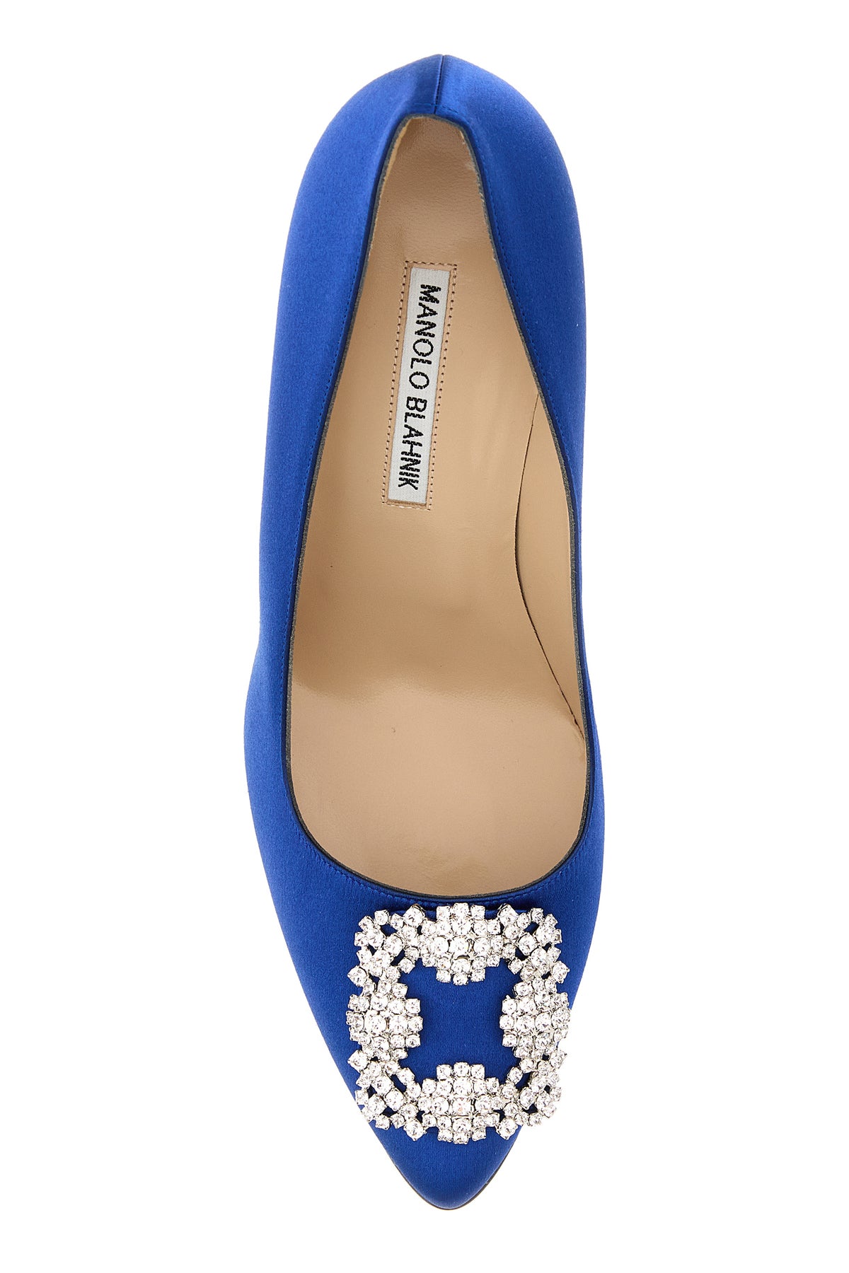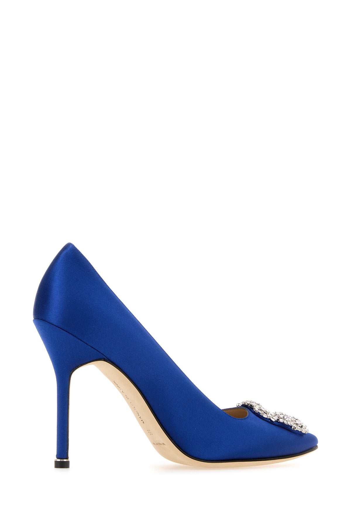 Scarpe con tacco realizzate in raso arricchite da decorazione gioiello sulla parte frontale.