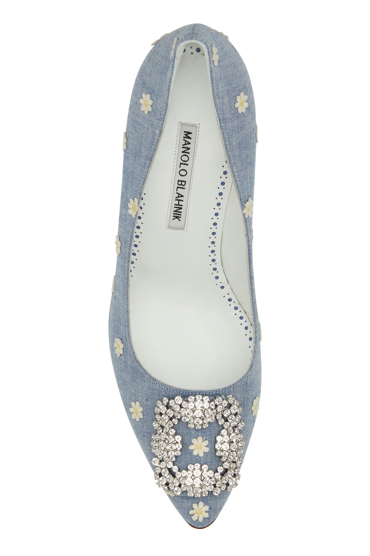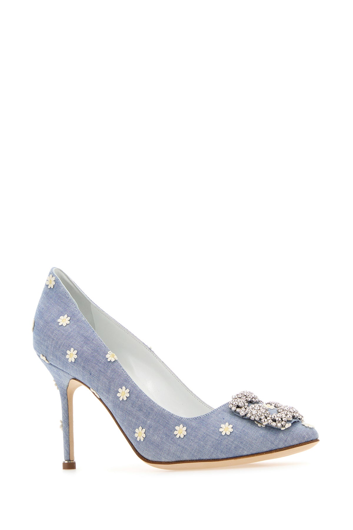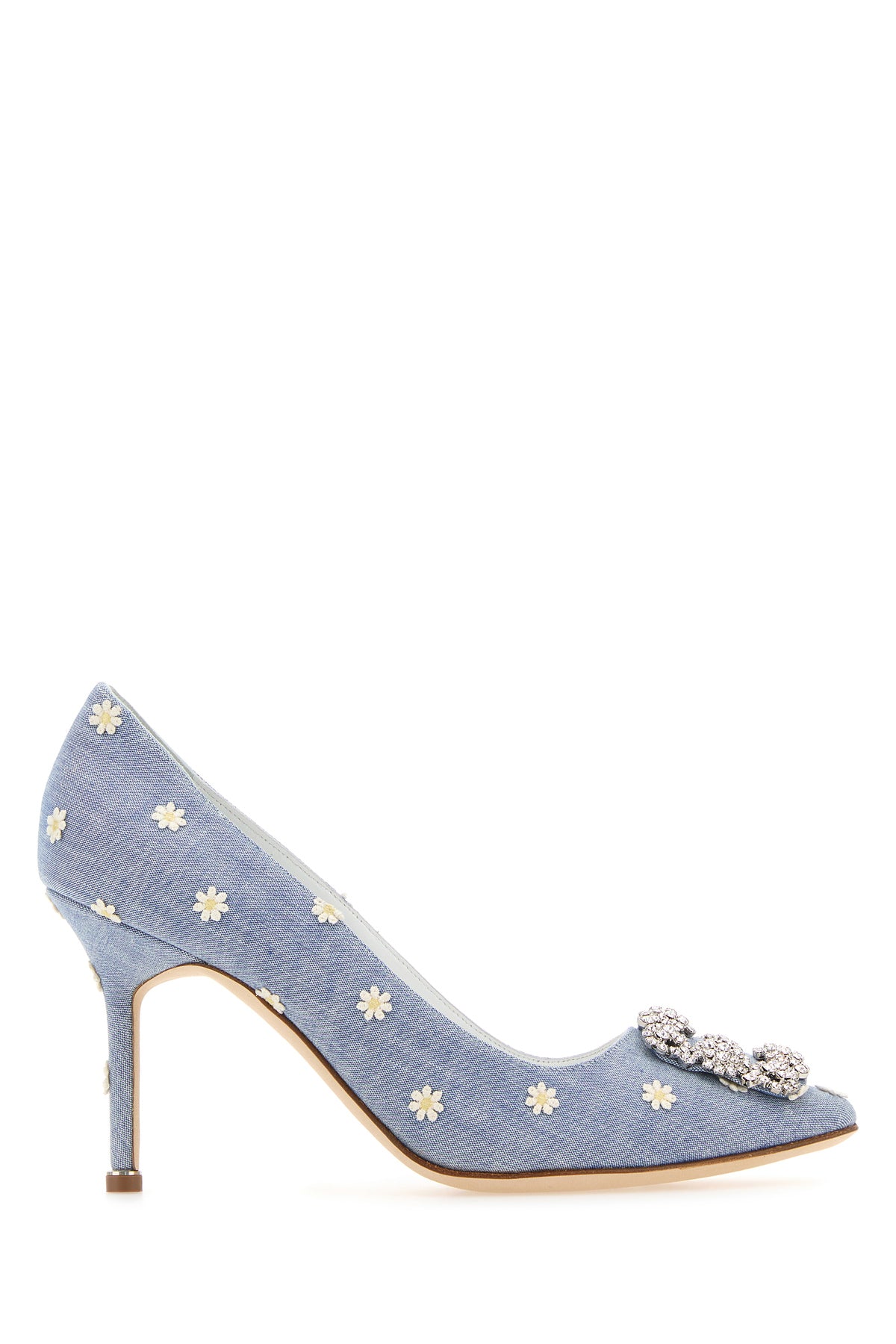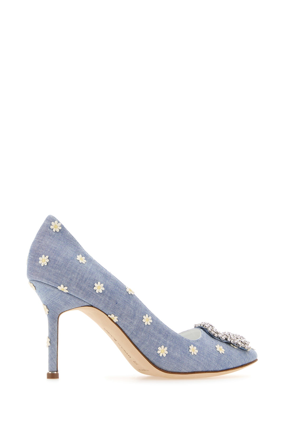 Scarpe con tacco realizzate in tessuto caratterizzate da ricamo floreale su tutta la superficie arricchite da dettaglio gioiello sulla parte frontale.