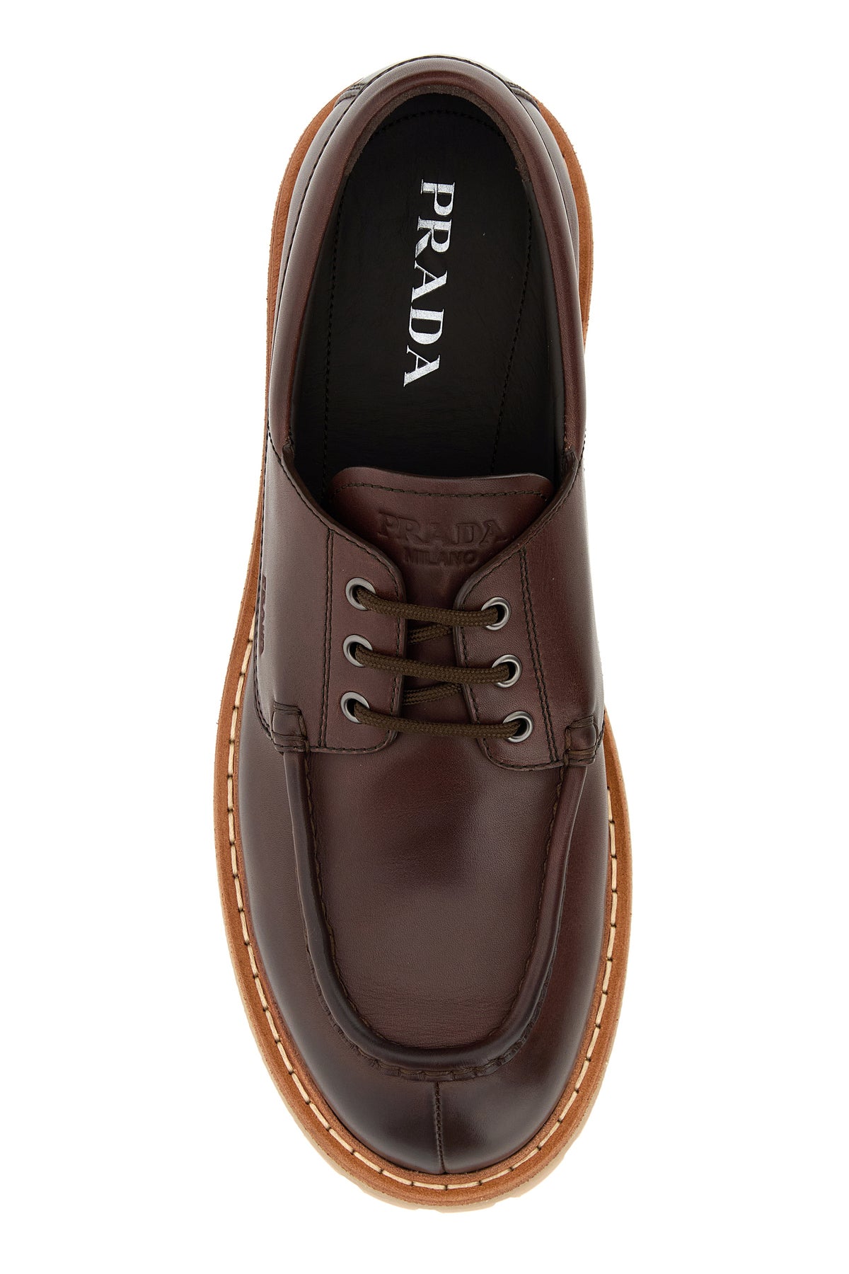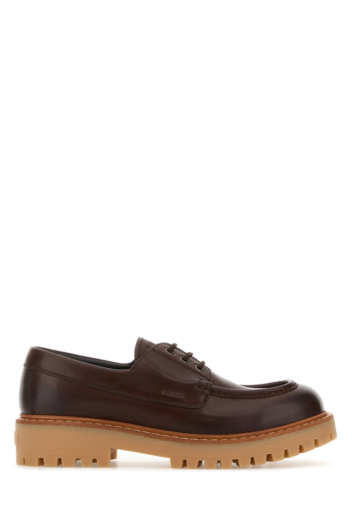 Scarpe stringate realizzate in pelle di vitello liscia arricchite da iconico triangolo metallico logato sulla mascherina.