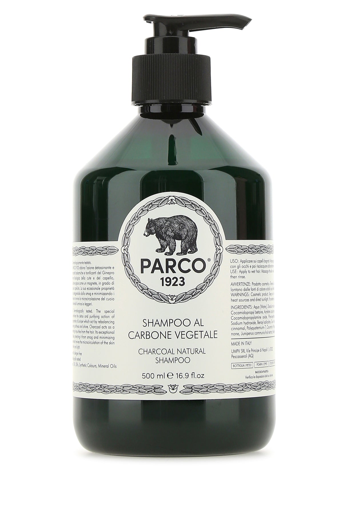 La speciale formula attiva al profumo Parco 1923 abbina l'azione detossinante e purificante del carbone vegetale alle proprietà balsamiche e tonificanti del Ginepro che agiscono riequilibrando la barriera fisiologica della cute e del capello, assicurando morbidezza e lucidità.