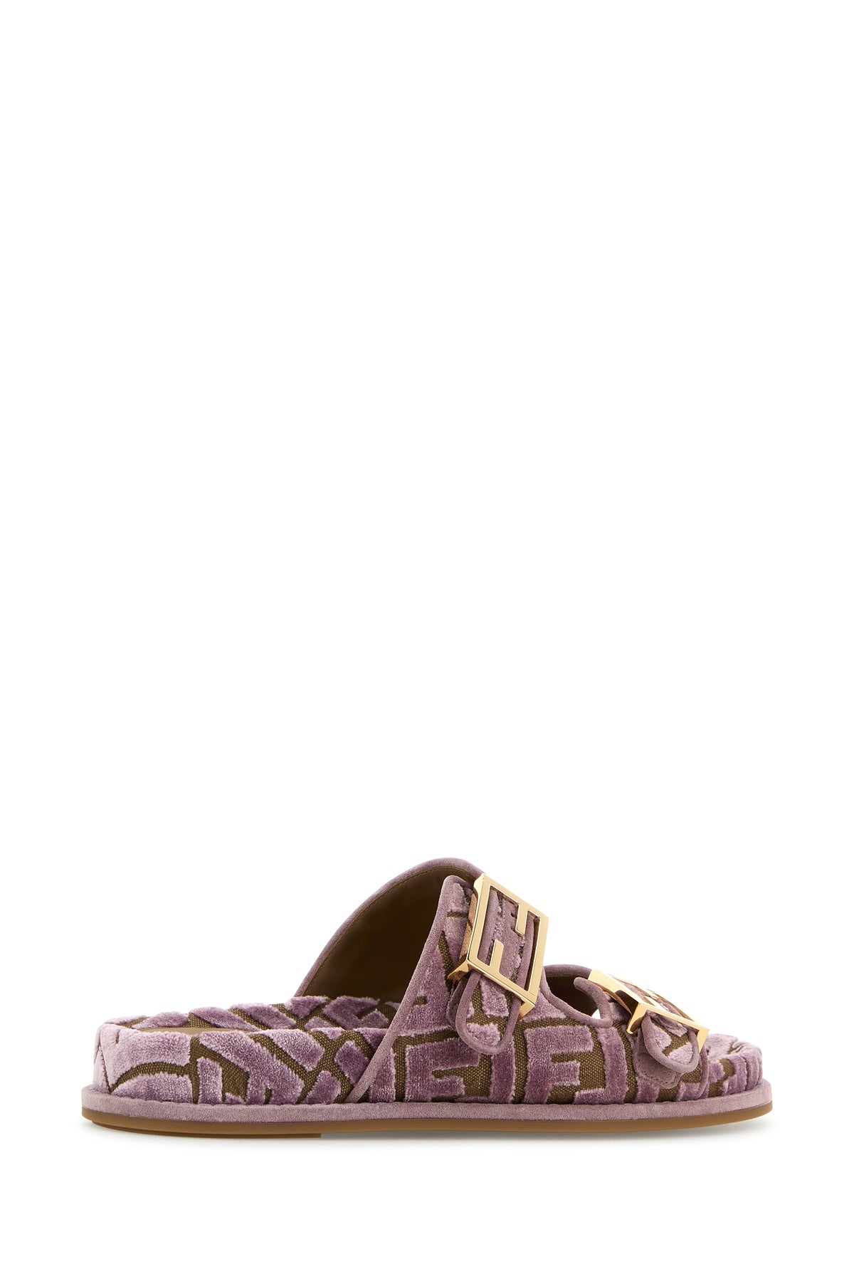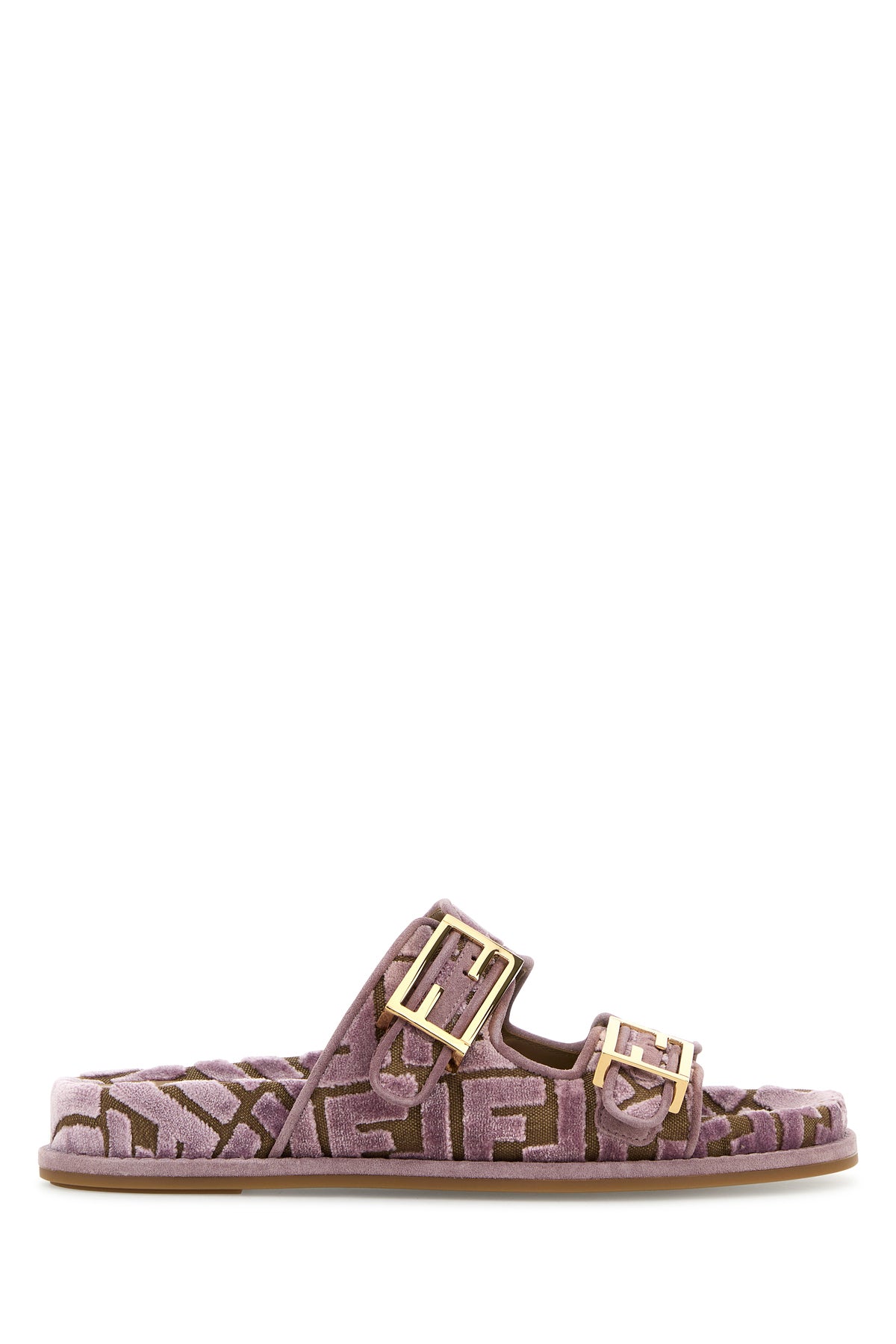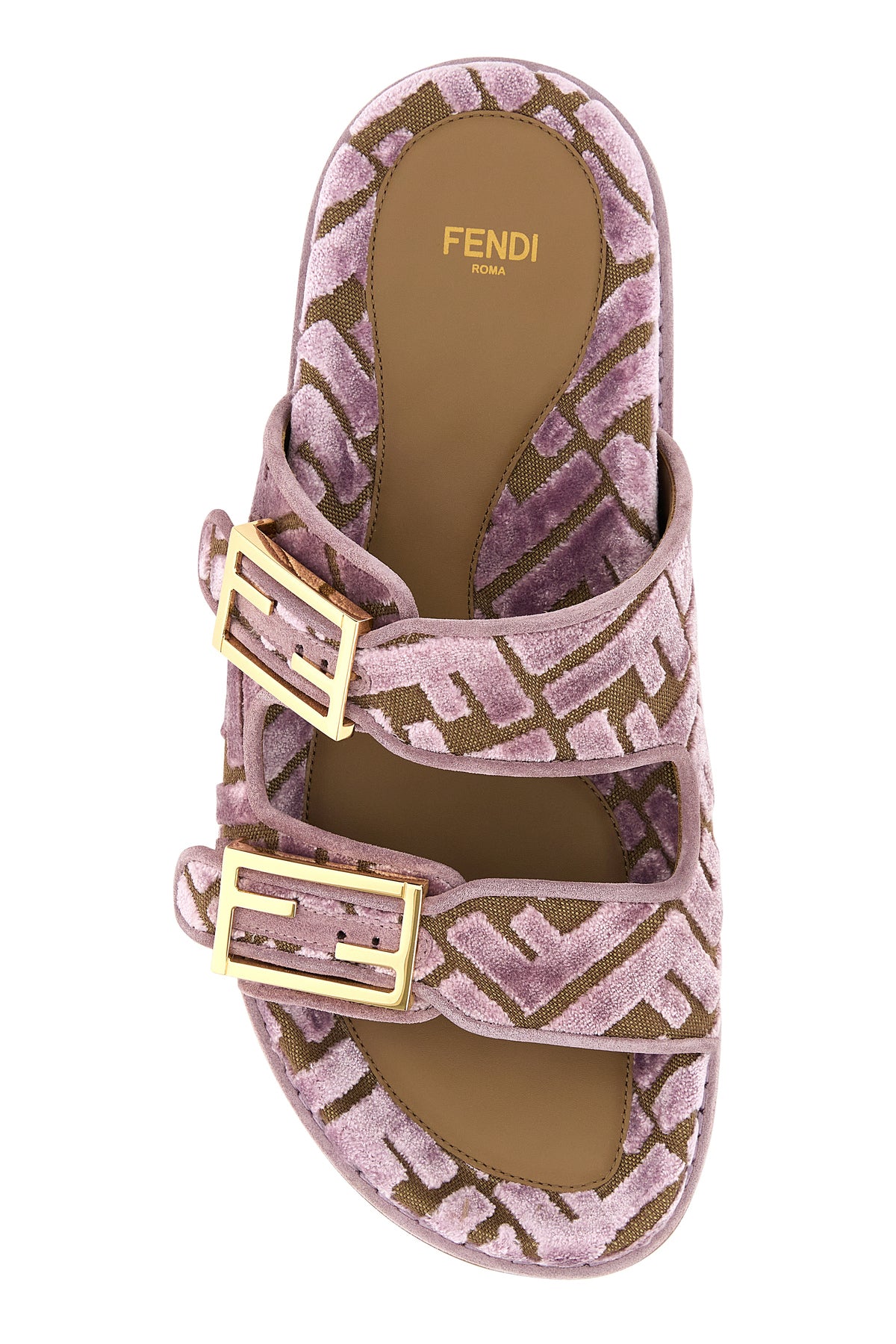 Slippers realizzate in velluto e jacquard caratterizzate da ricamo a motivo FF su tutta la superficie arricchite da cinturini regolabili con fibbie metalliche logate.