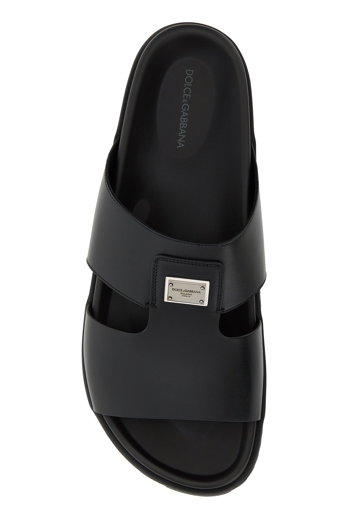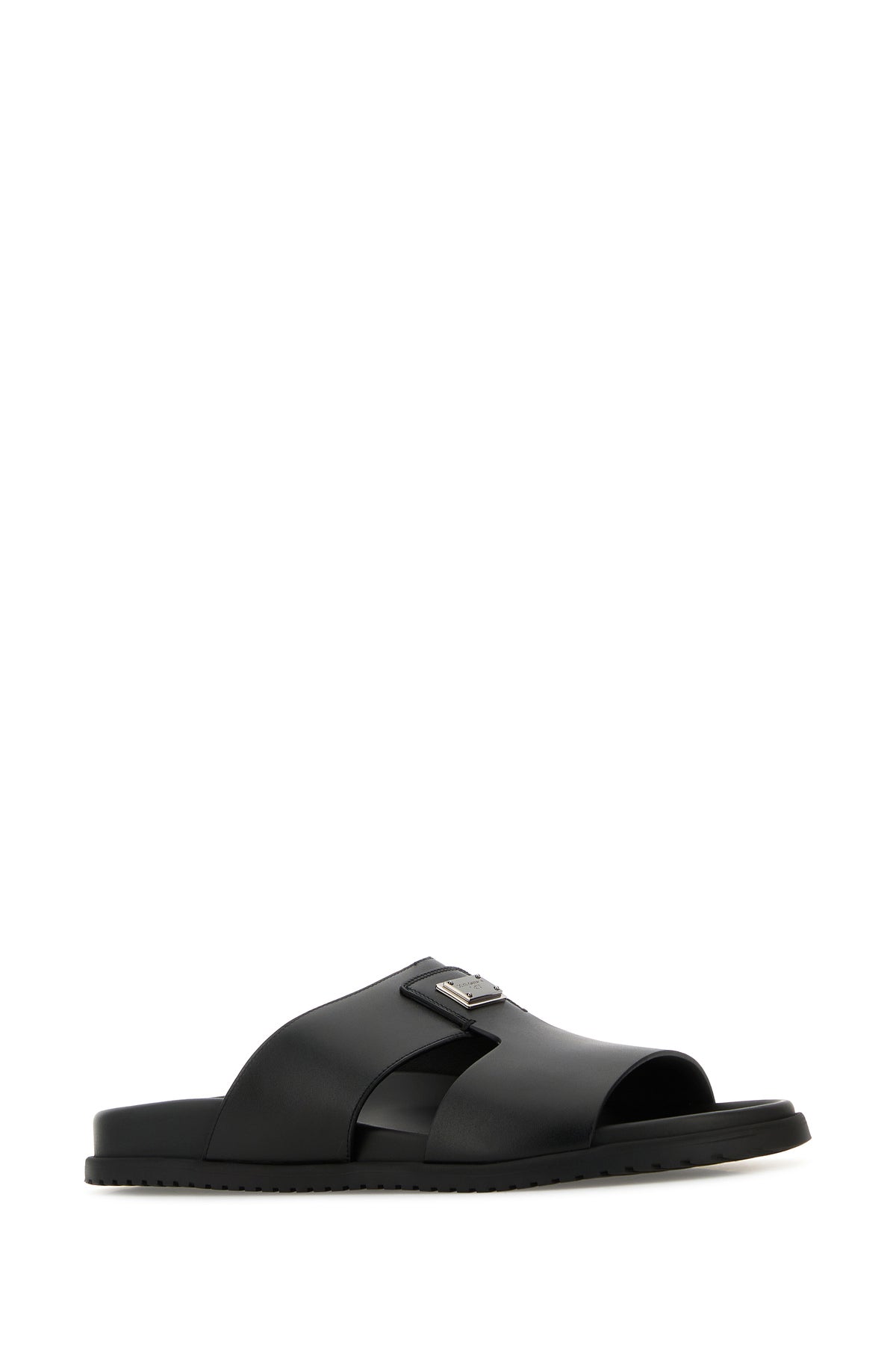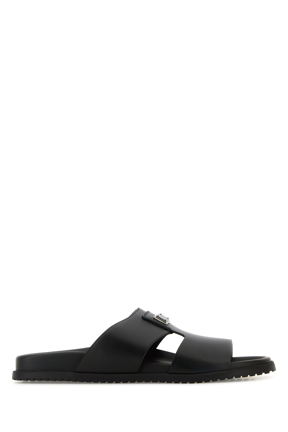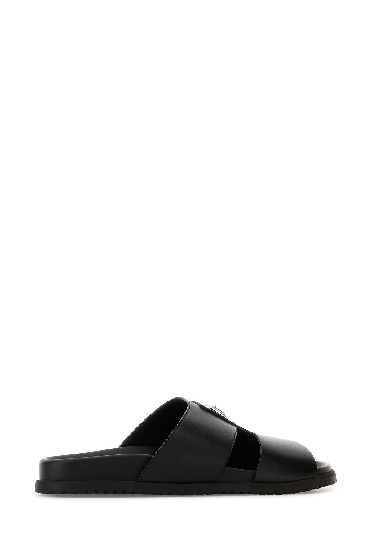 Slippers realizzate in pelle di vitello arricchite da traghetta metallica logata sul collo del piede.