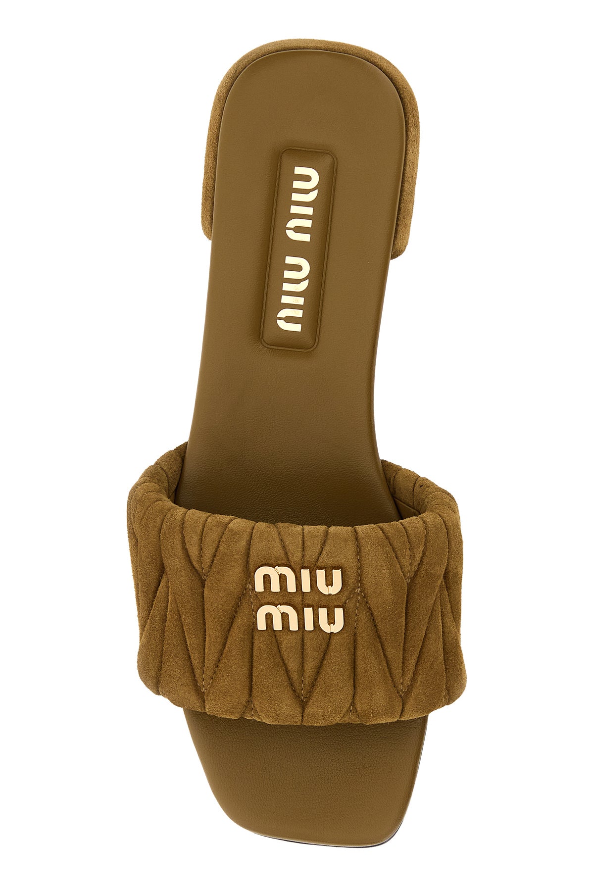Slippers realizzate in pelle scamosciata matelassé arricchite da logo in lettere metalliche sul collo del piede.