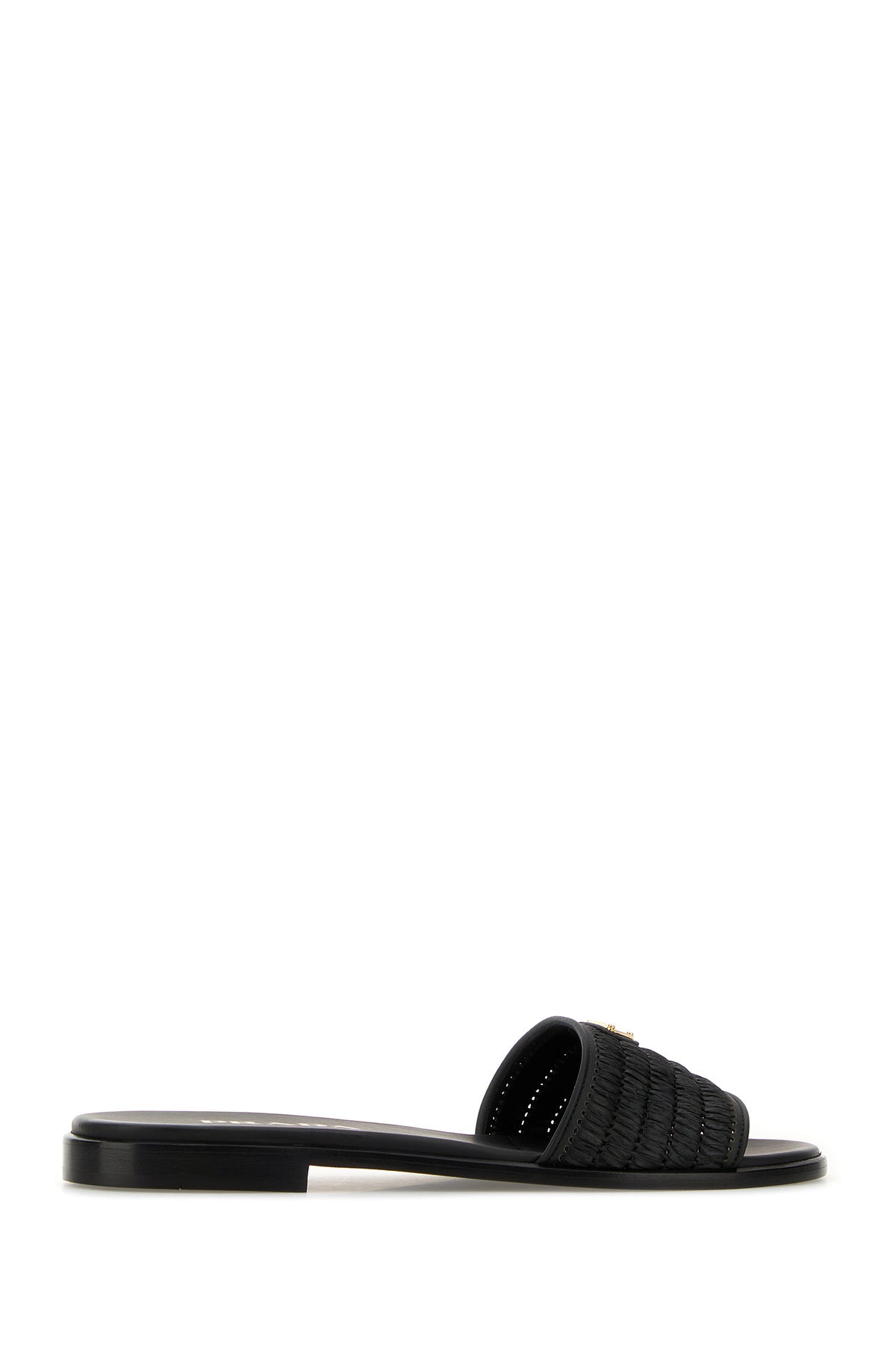 Slippers realizzate in rafia arricchite da iconico triangolo metallico logato sul collo del piede.