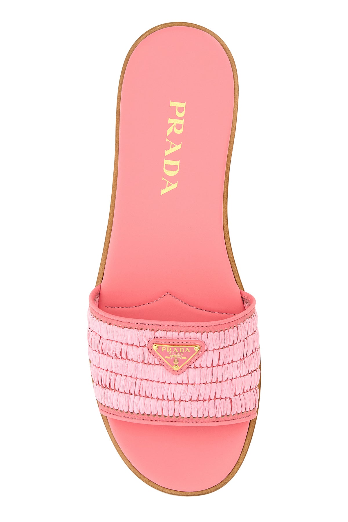 Slippers realizzate in radia arricchite da iconico triangolo metallico logato sul collo del piede.