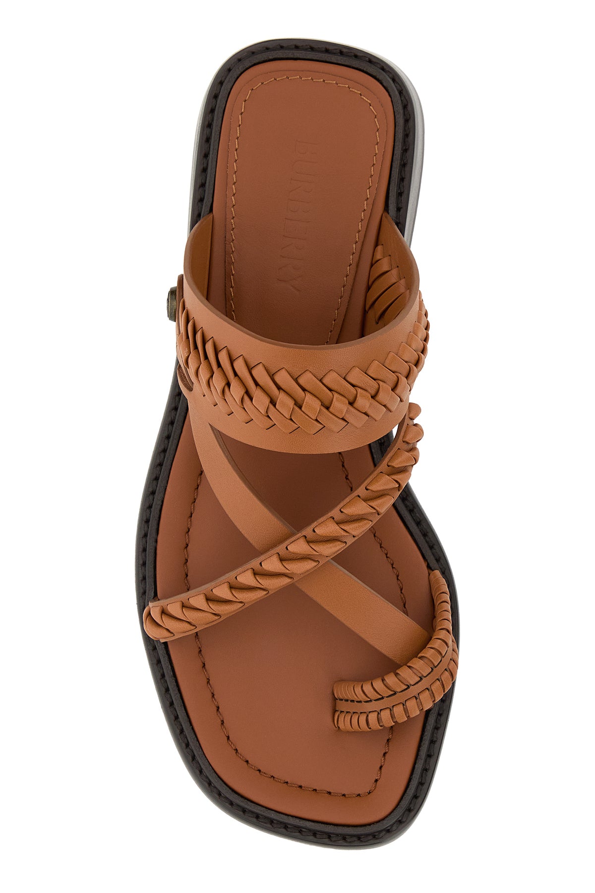 Slippers infradito realizzati in pelle con inserti in pelle intrecciata sul collo del piede arricchite da dettaglio metallico Equestrian Knight sul lato.