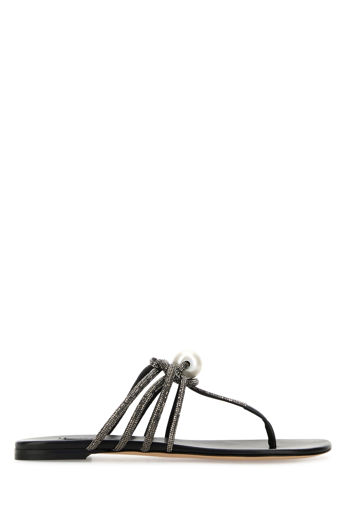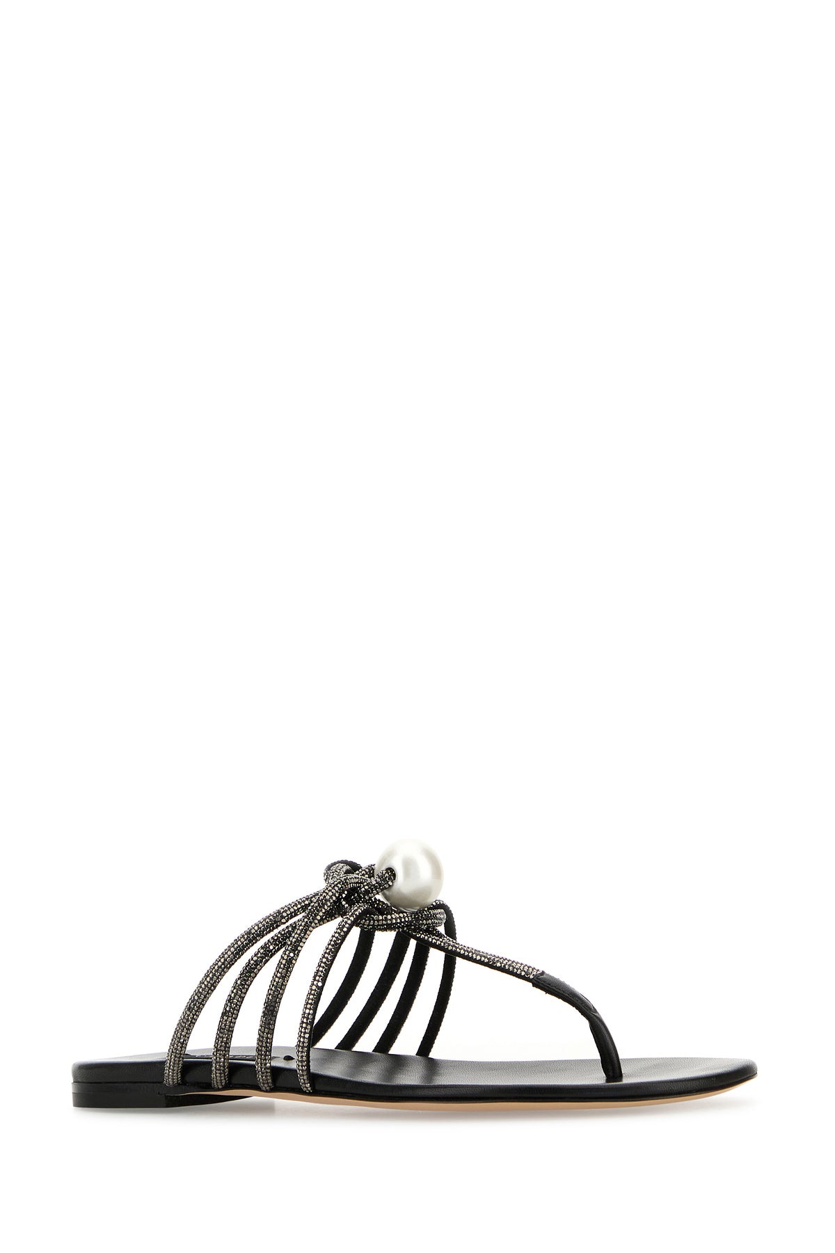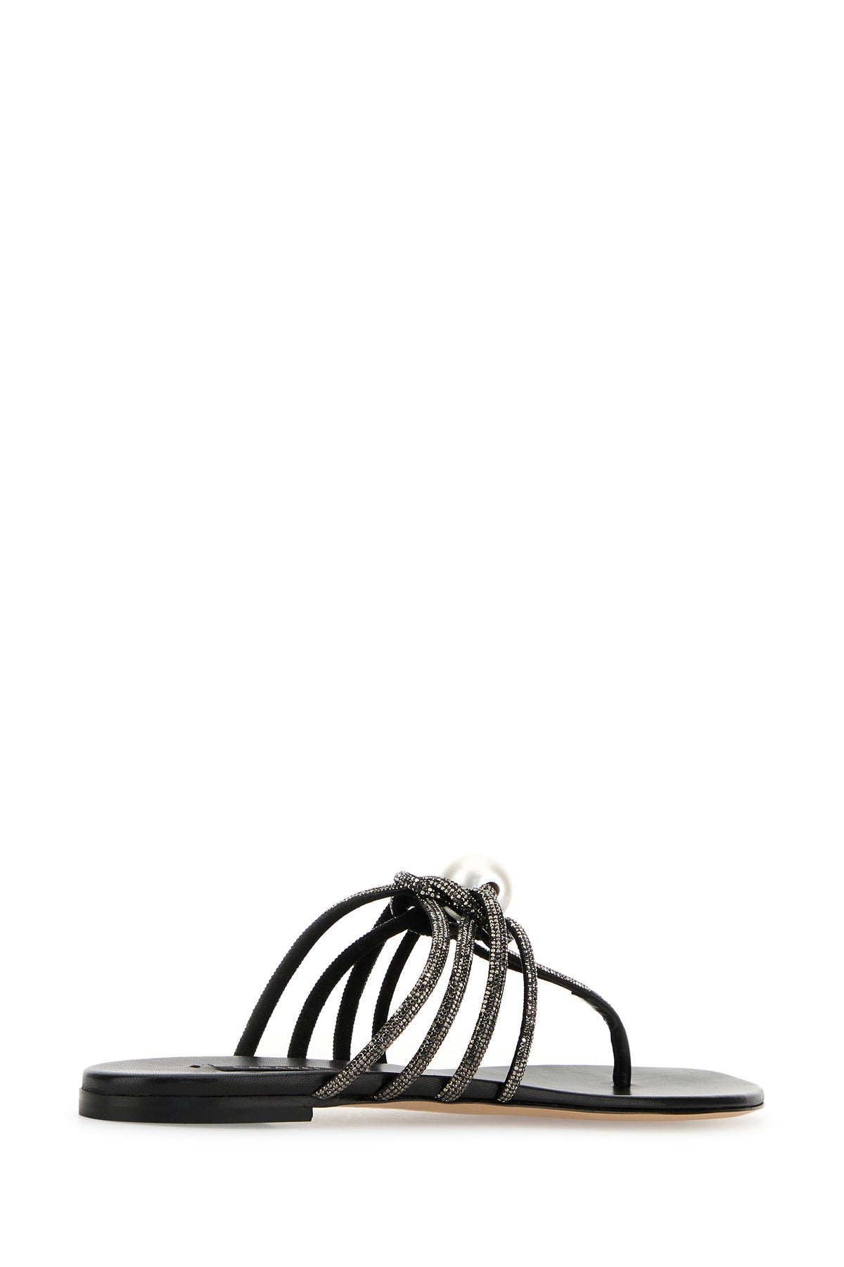 Slippers infradito realizzate in tessuto interamente ricoperto da cristalli arricchite da nodo decorativo con maxi perla sul collo del piede.