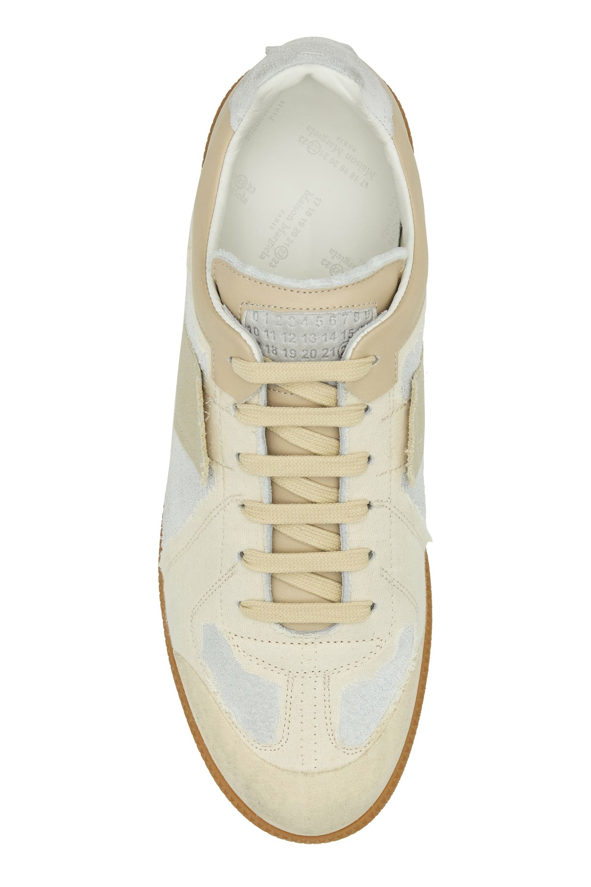 Sneakers realizzate in pelle di vitello e pelle scamosciata con inserti in tela di puro cotone e inserti in tessuto arricchite da applicazione logata sulla linguetta imbottita.