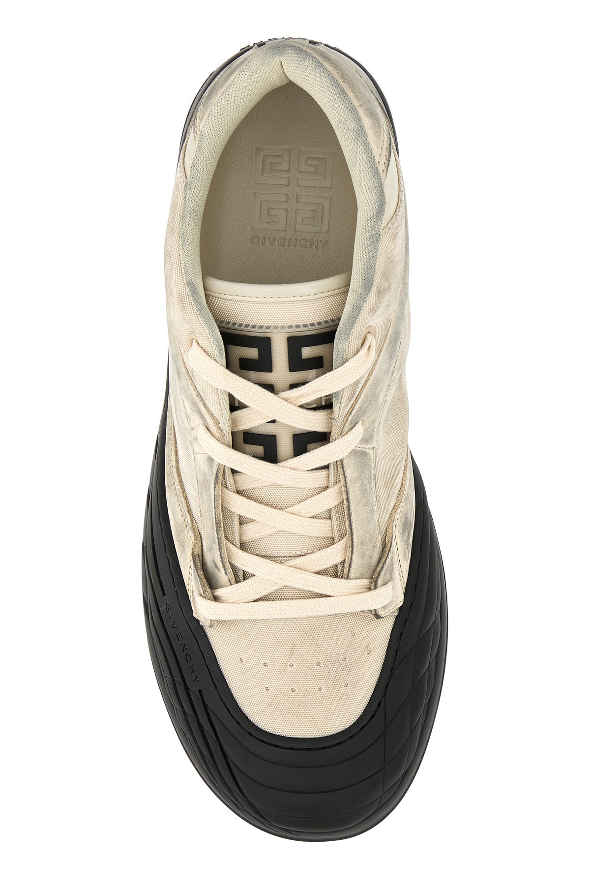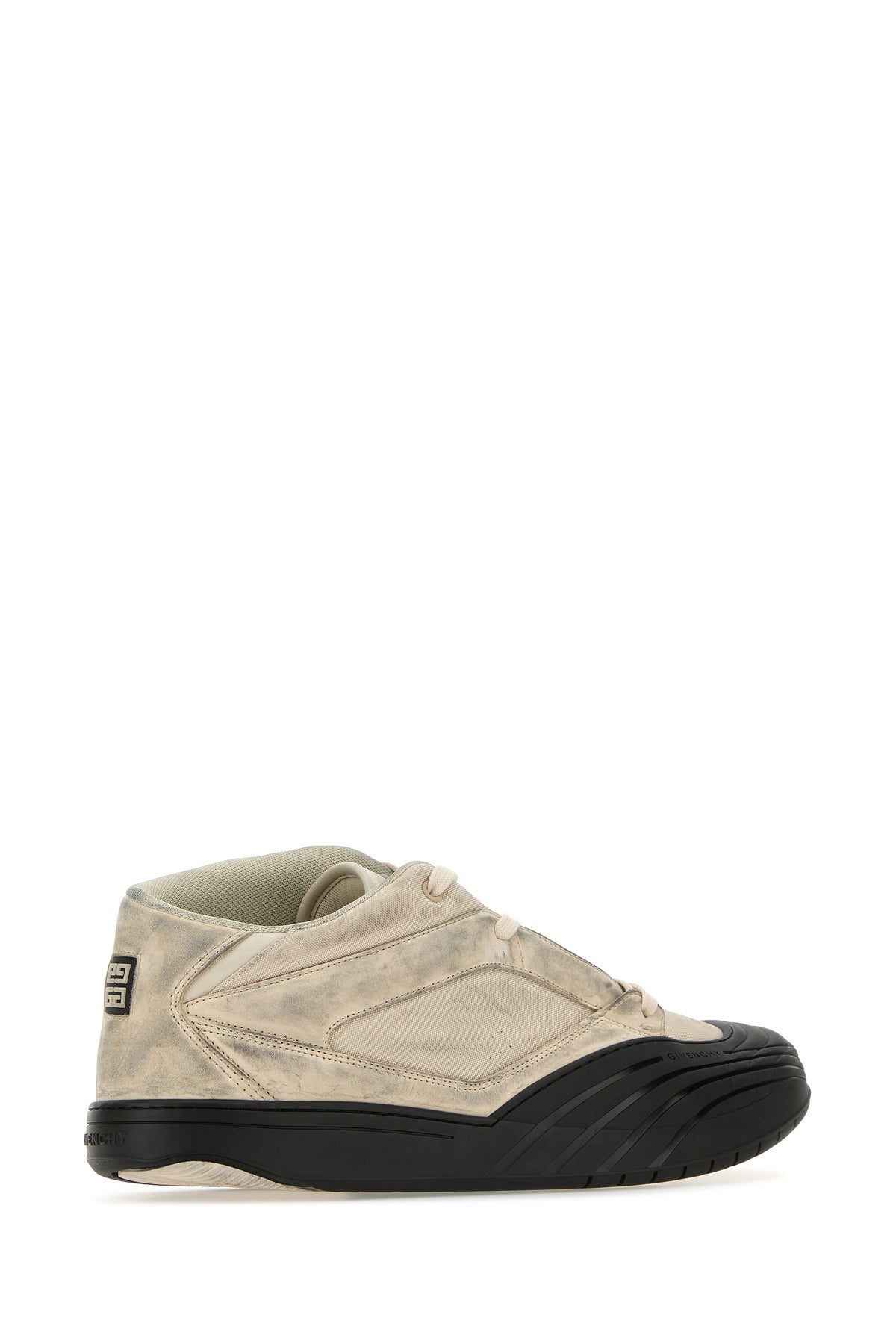 Sneakers realizzate in tessuto e pelle con inserto in gomma sulla punta e sporcature intenzionali su tutta la superficie caratterizzate da logo impresso sulla parte frontale e logo in rilievo sul retro arricchite da applicazione logata sul retro.
