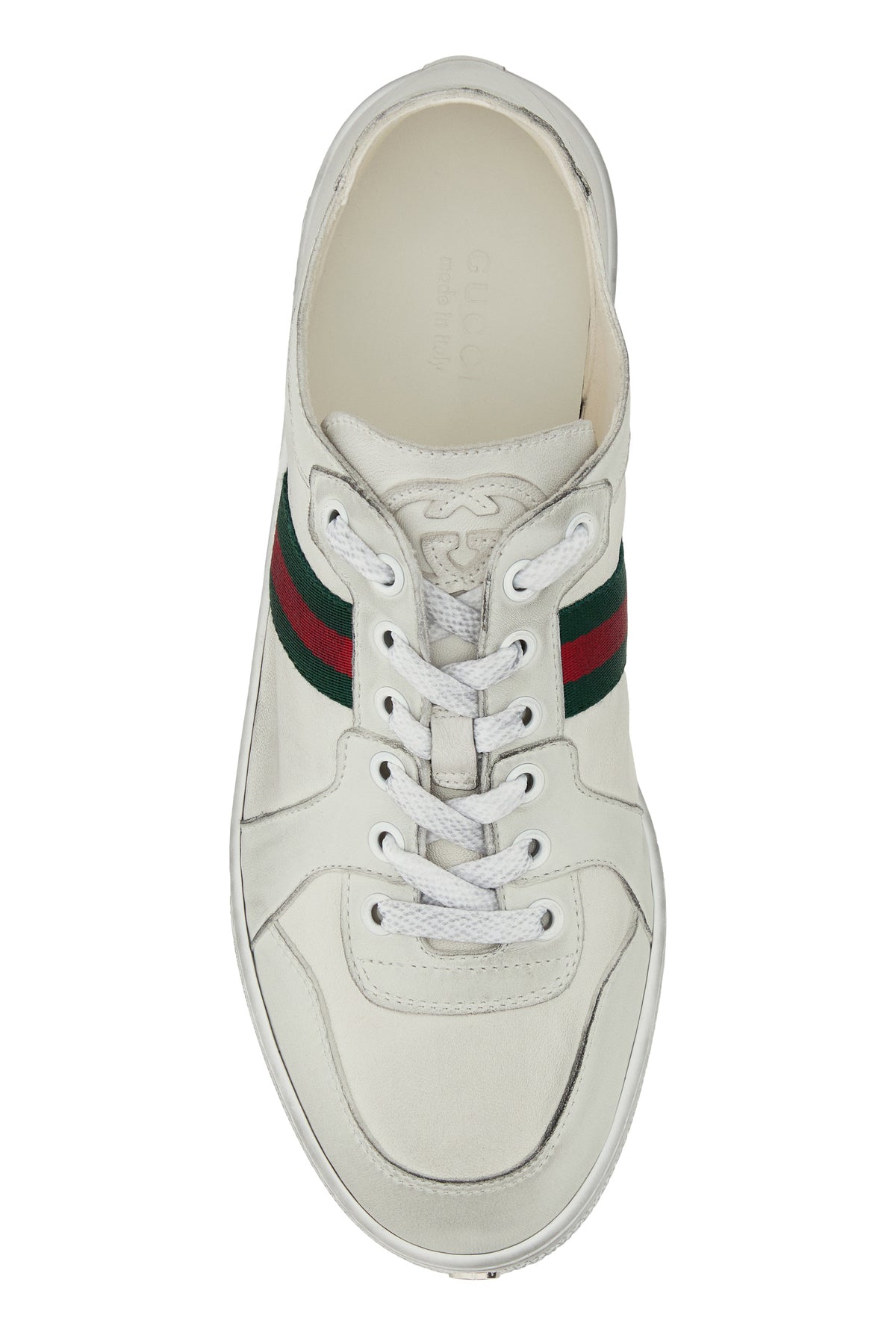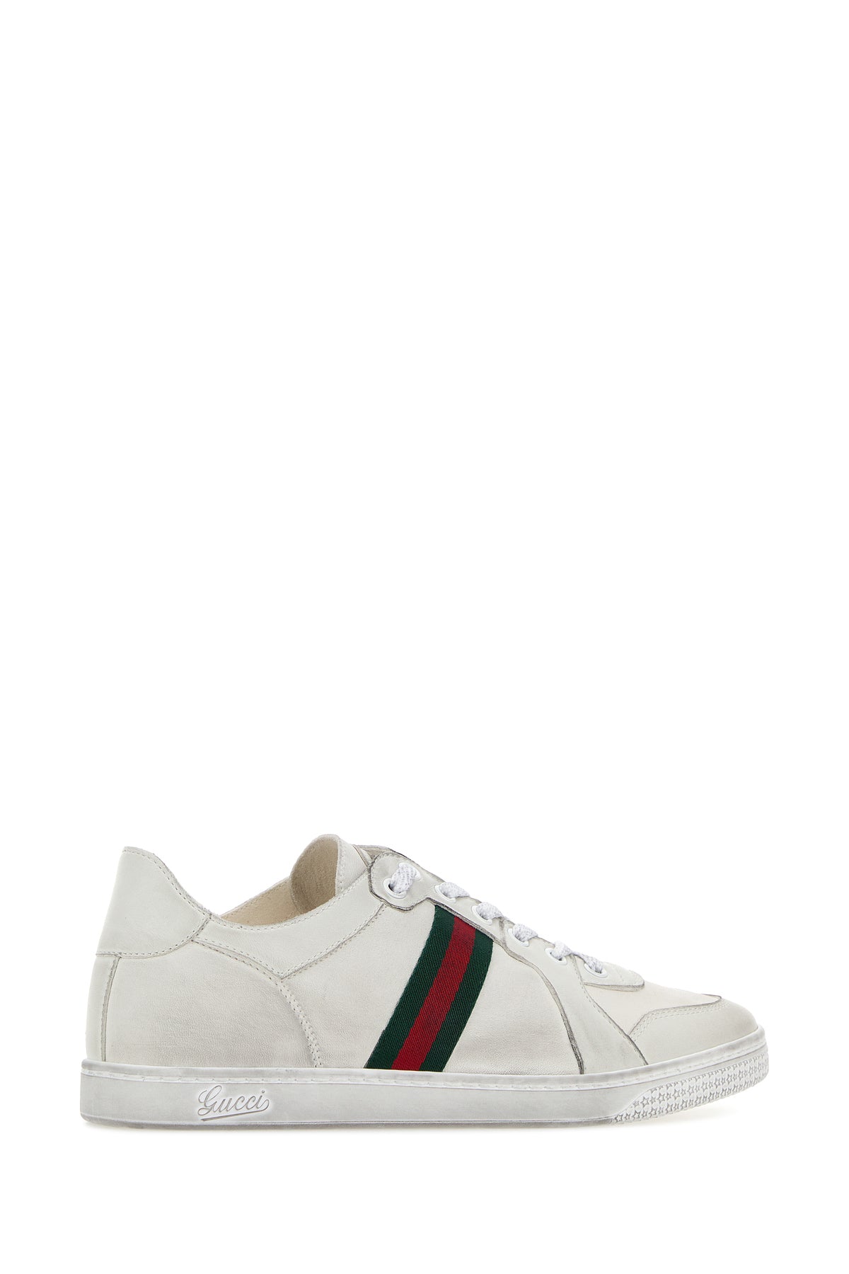 Sneakers realizzate in pelle con sporcature intenzionali caratterizzate da motivo Gucci in rilievo sul fondo arricchite da nastro Web sui lati.