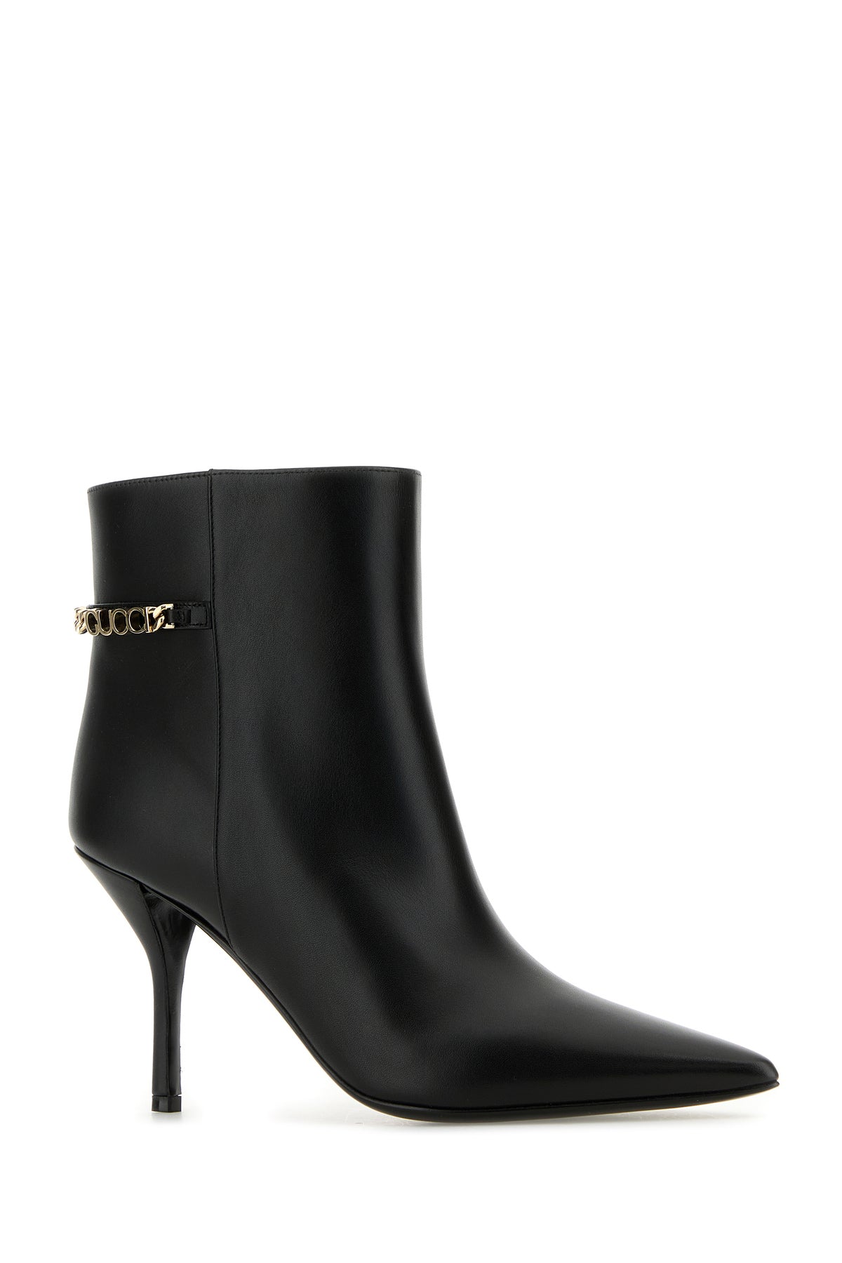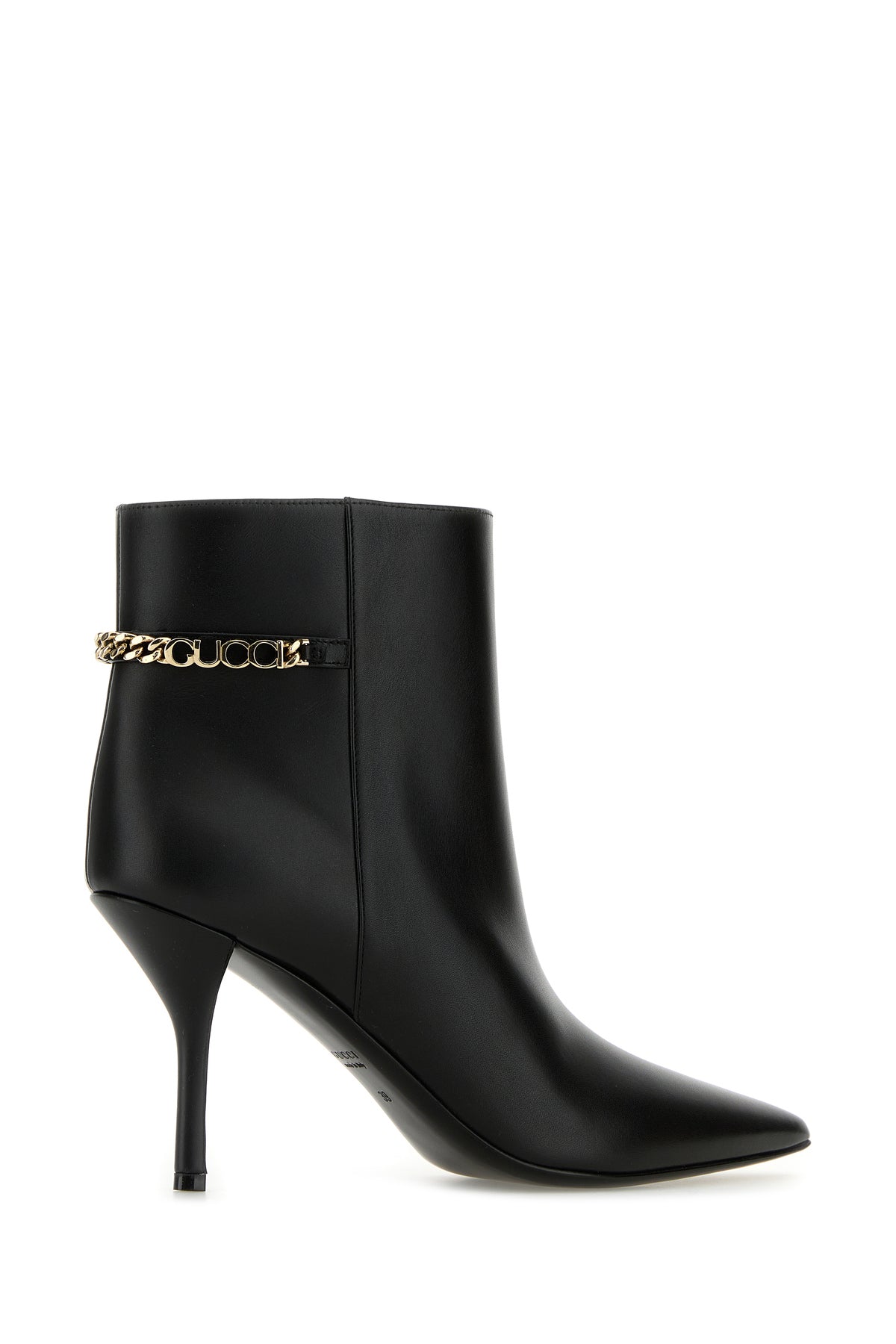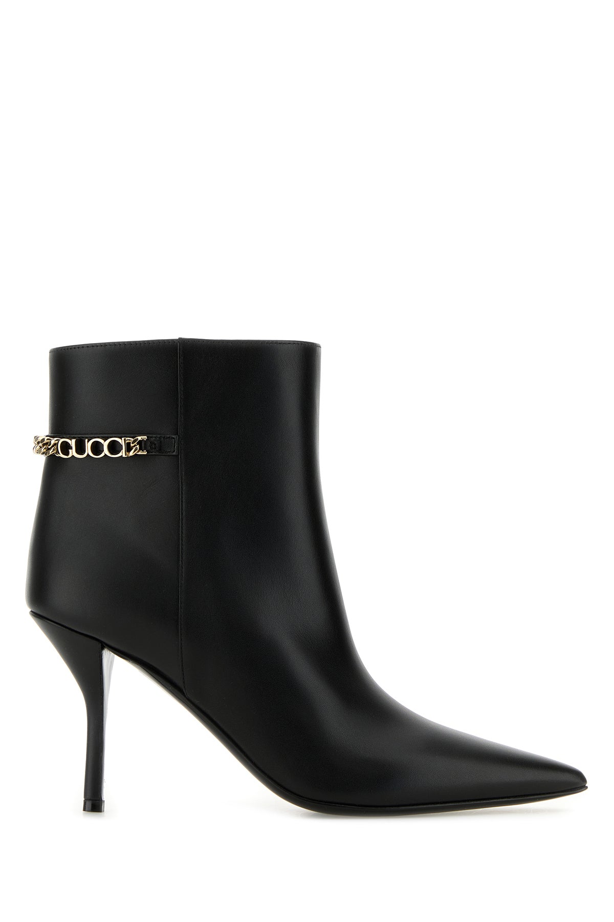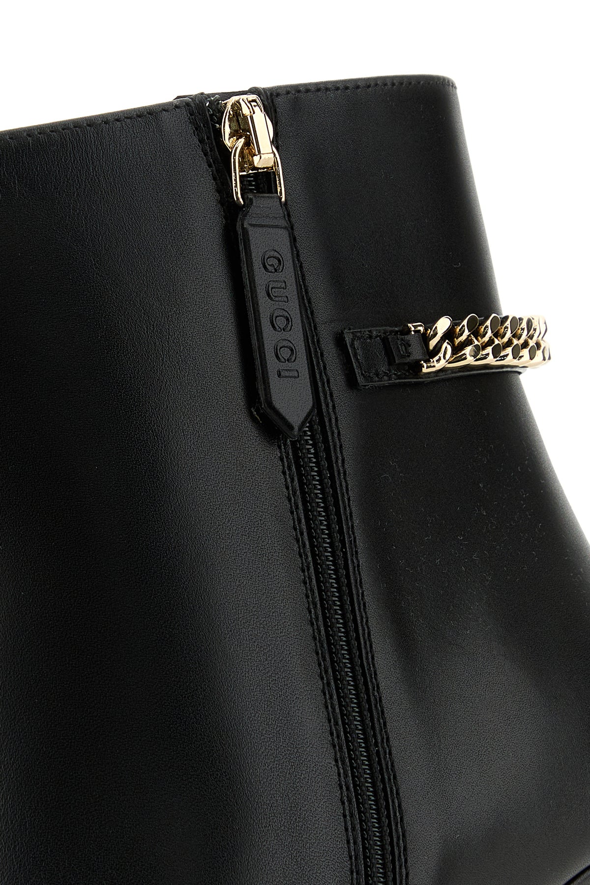 Stivaletti realizzati in pelle di vitello liscia arricchiti da dettaglio Gucci in catena metallica sul retro.