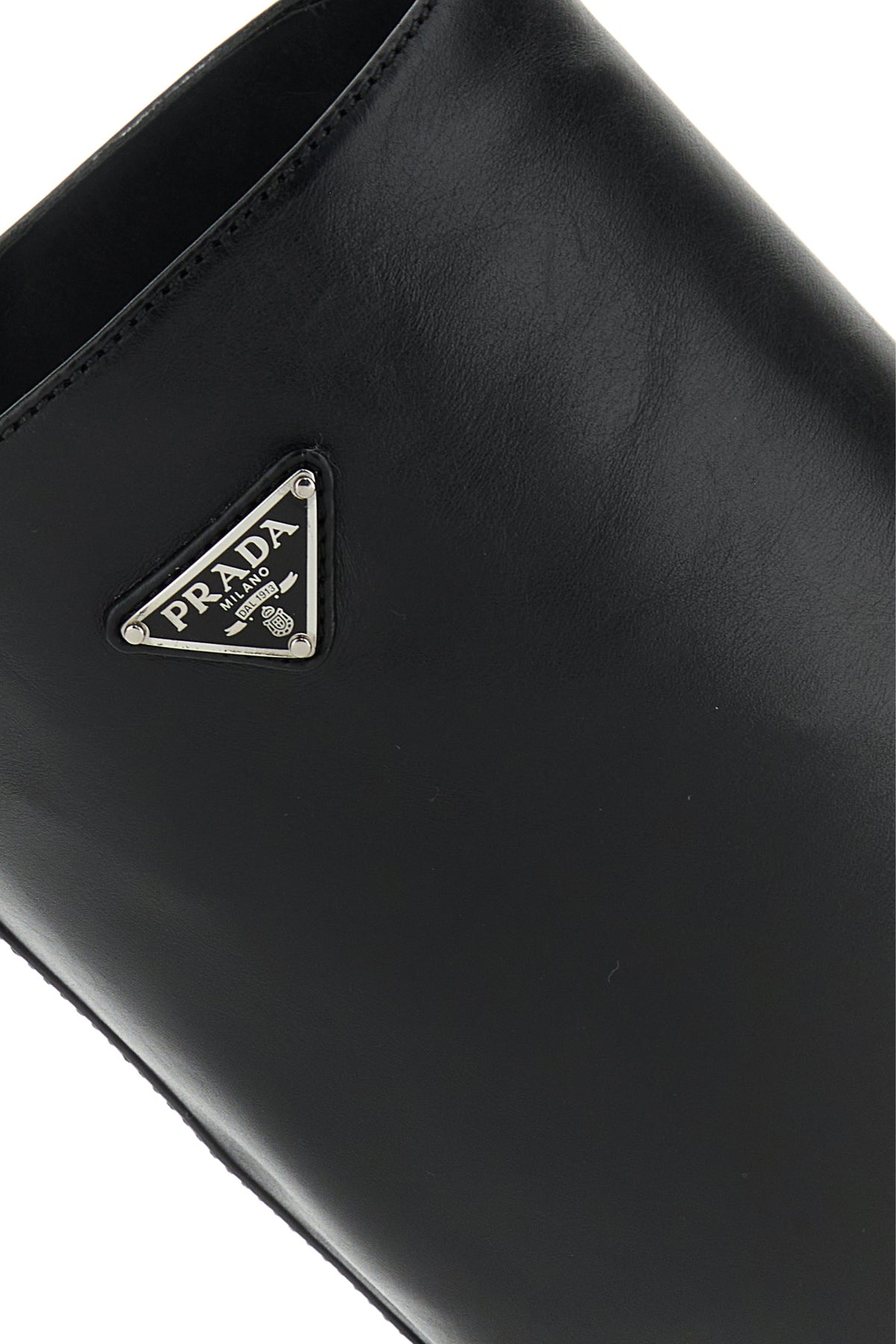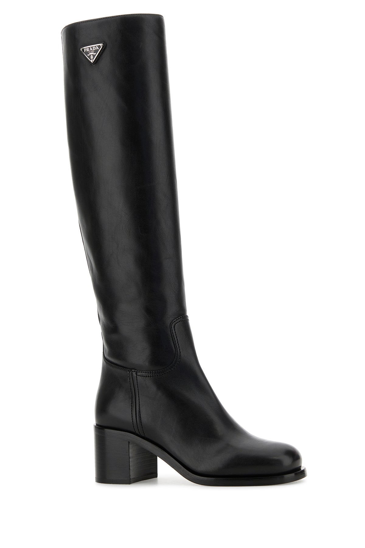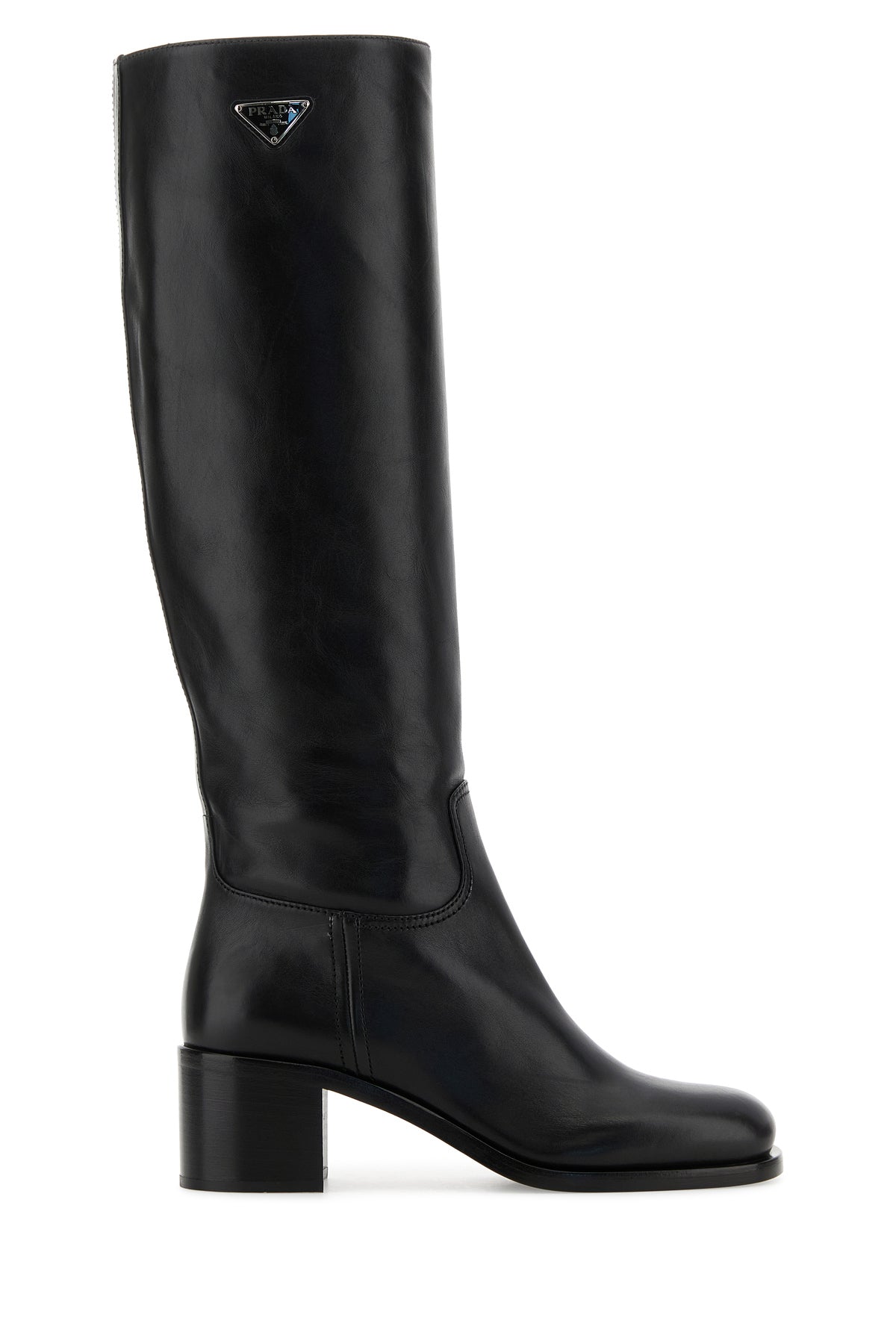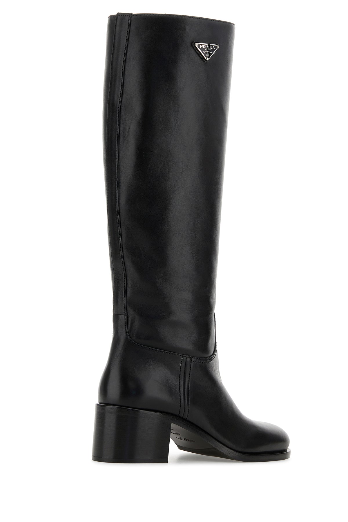 Stivali realizzati in pelle di agnello liscia arricchiti da iconico triangolo logato in metallo sul lato.
