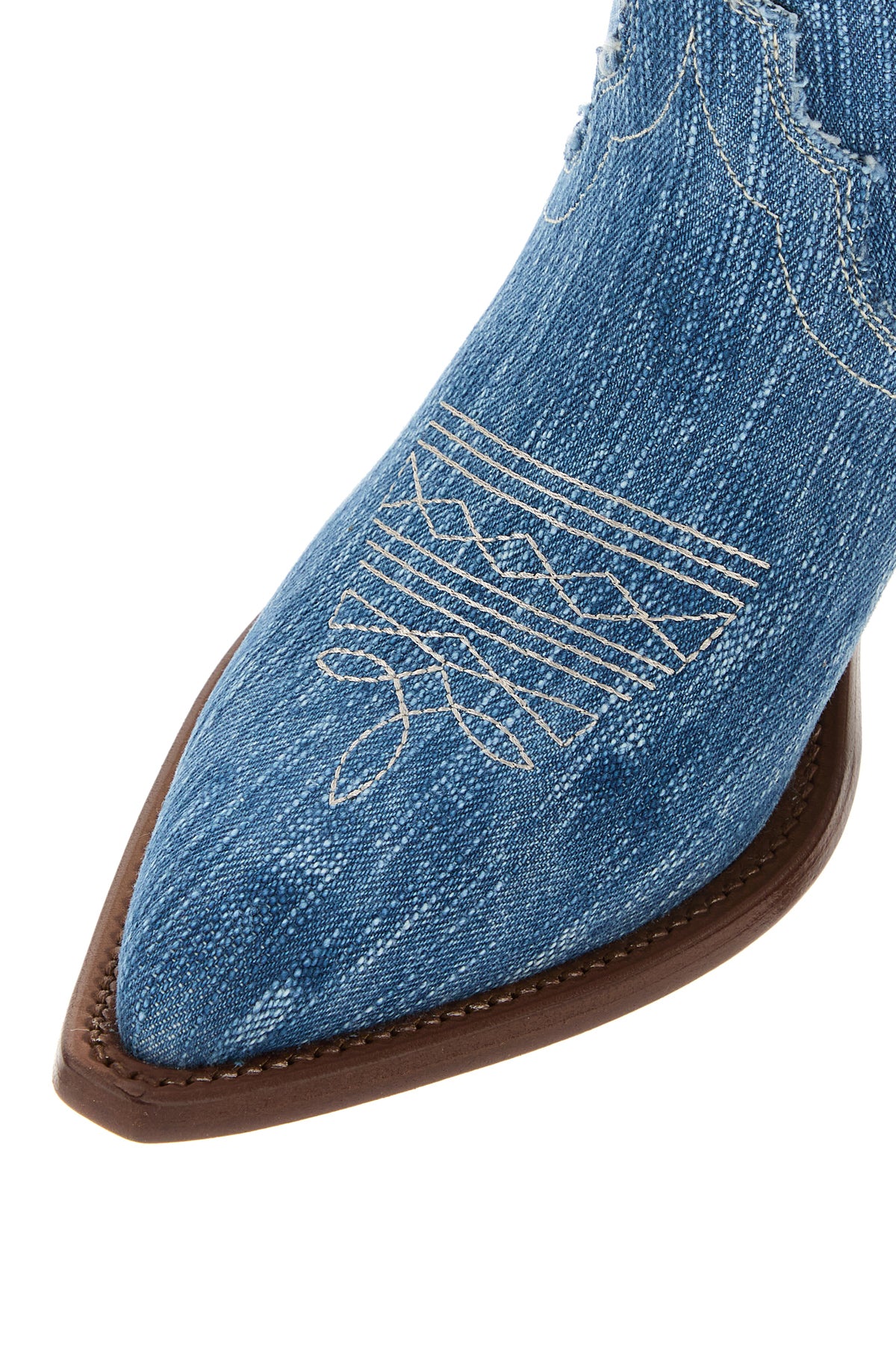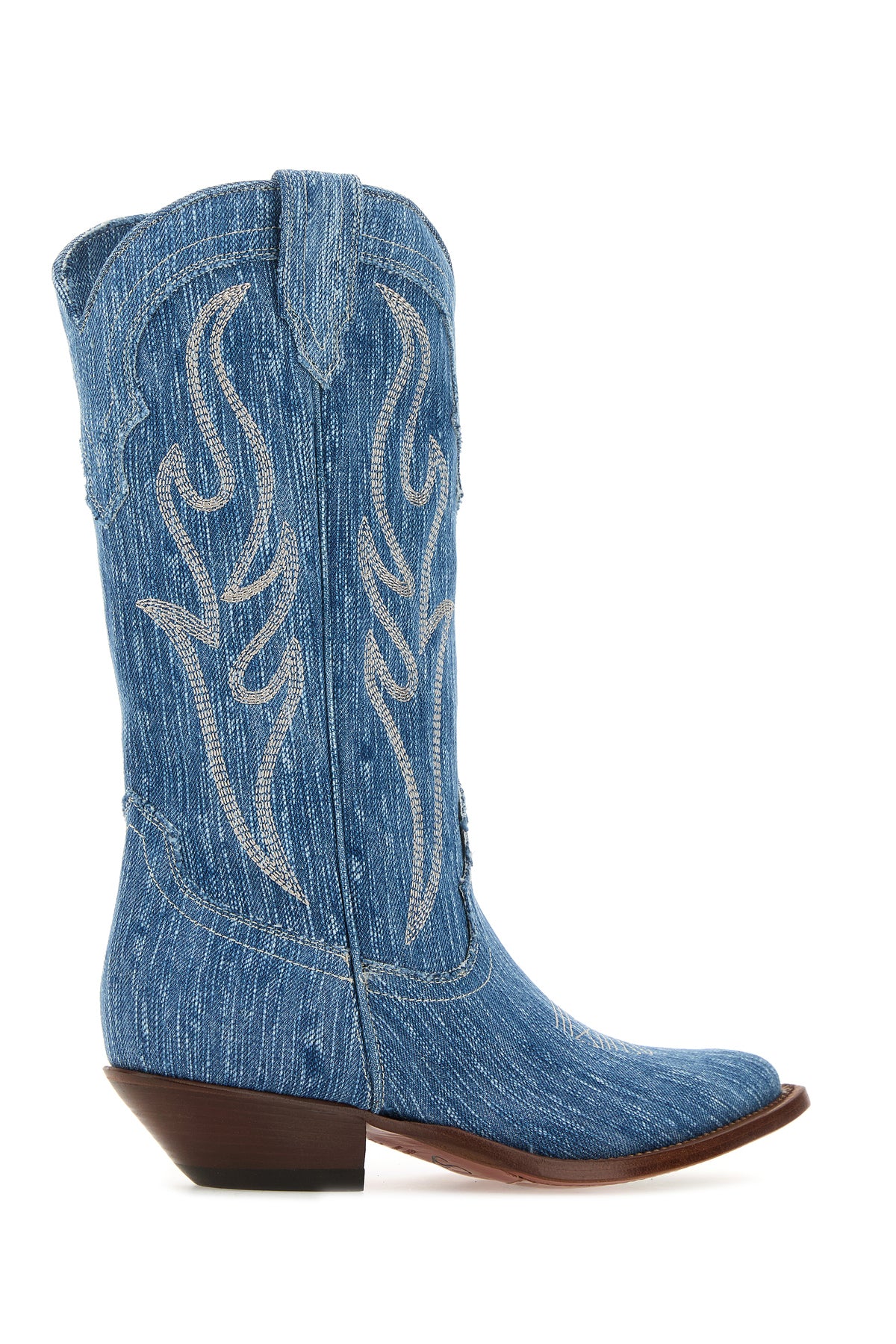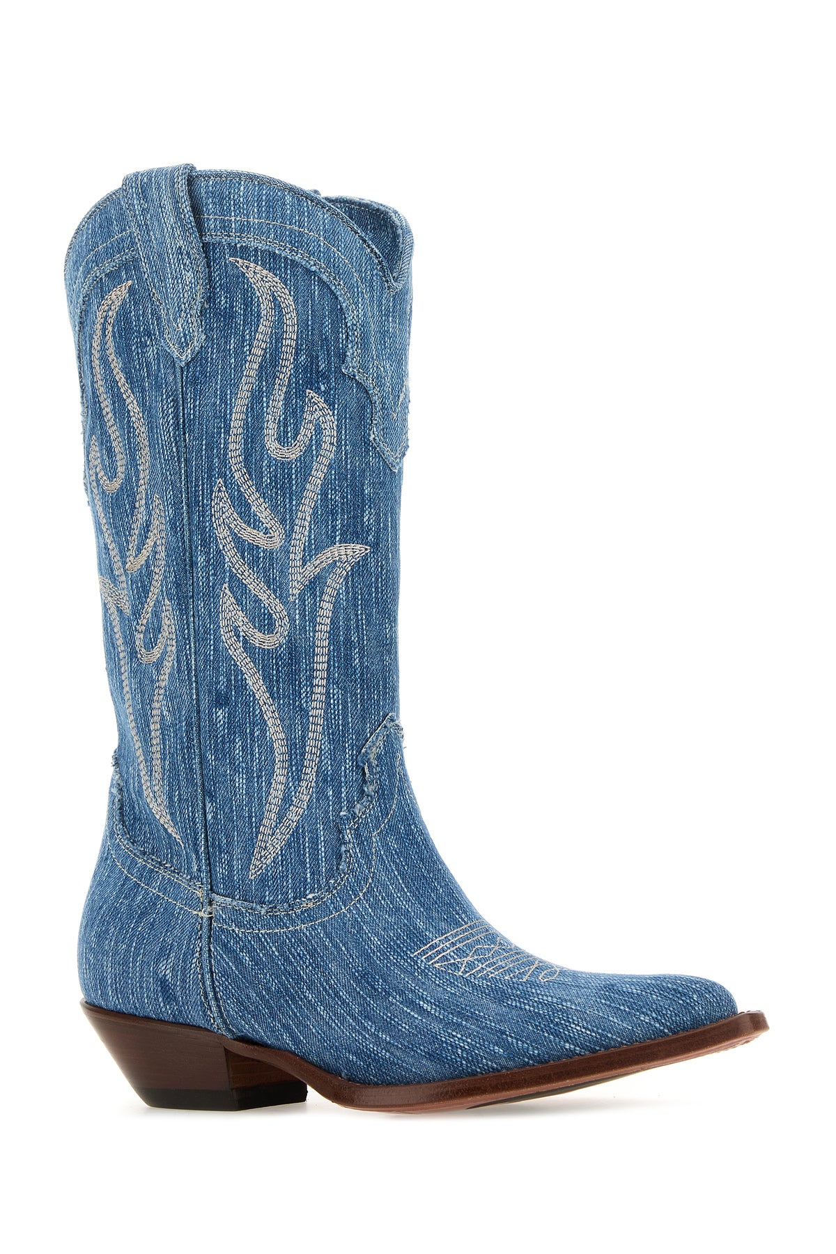 Stivali realizzati in denim slavato caratterizzati da particolari ricami a contrasto su tutta la superficie.