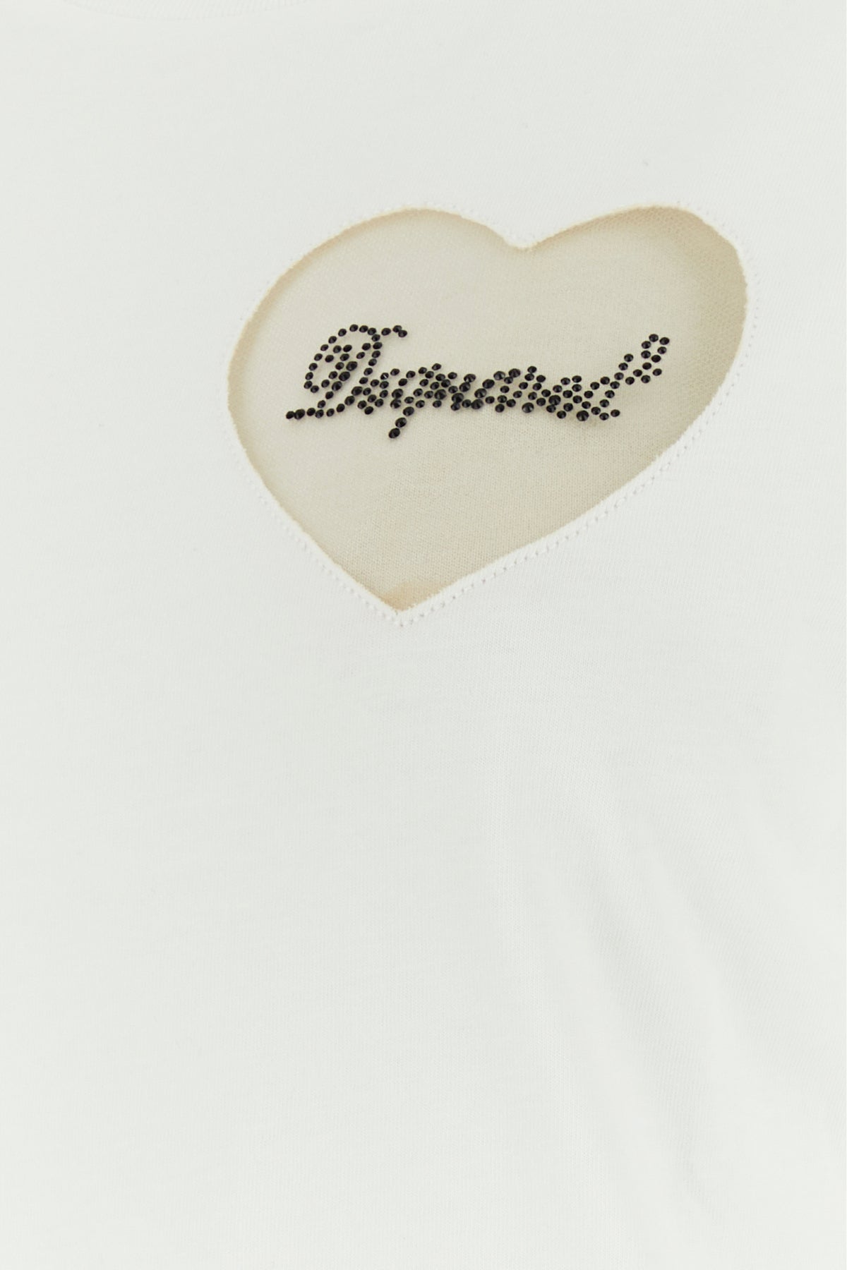 T-shirt realizzata in jersey di puro cotone arricchita da inserto in tulle a forma di cuore con logo in cristalli sul petto.