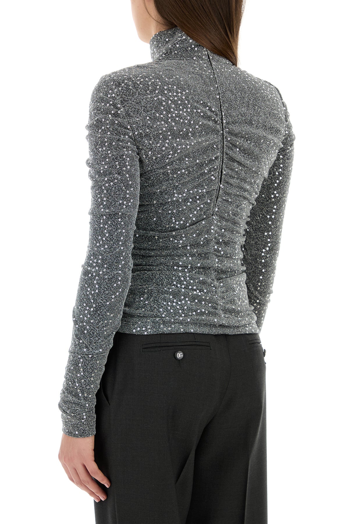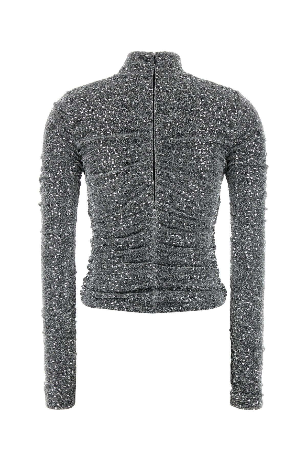 Top drappeggiato realizzato in jersey con fili in lurex arricchito da paillettes su tutta la superficie.