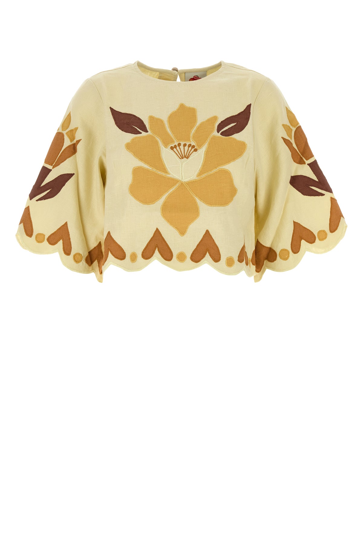 Top realizzato in puro lino caratterizzato da motivo Summer Cutwork su tutta la superficie.