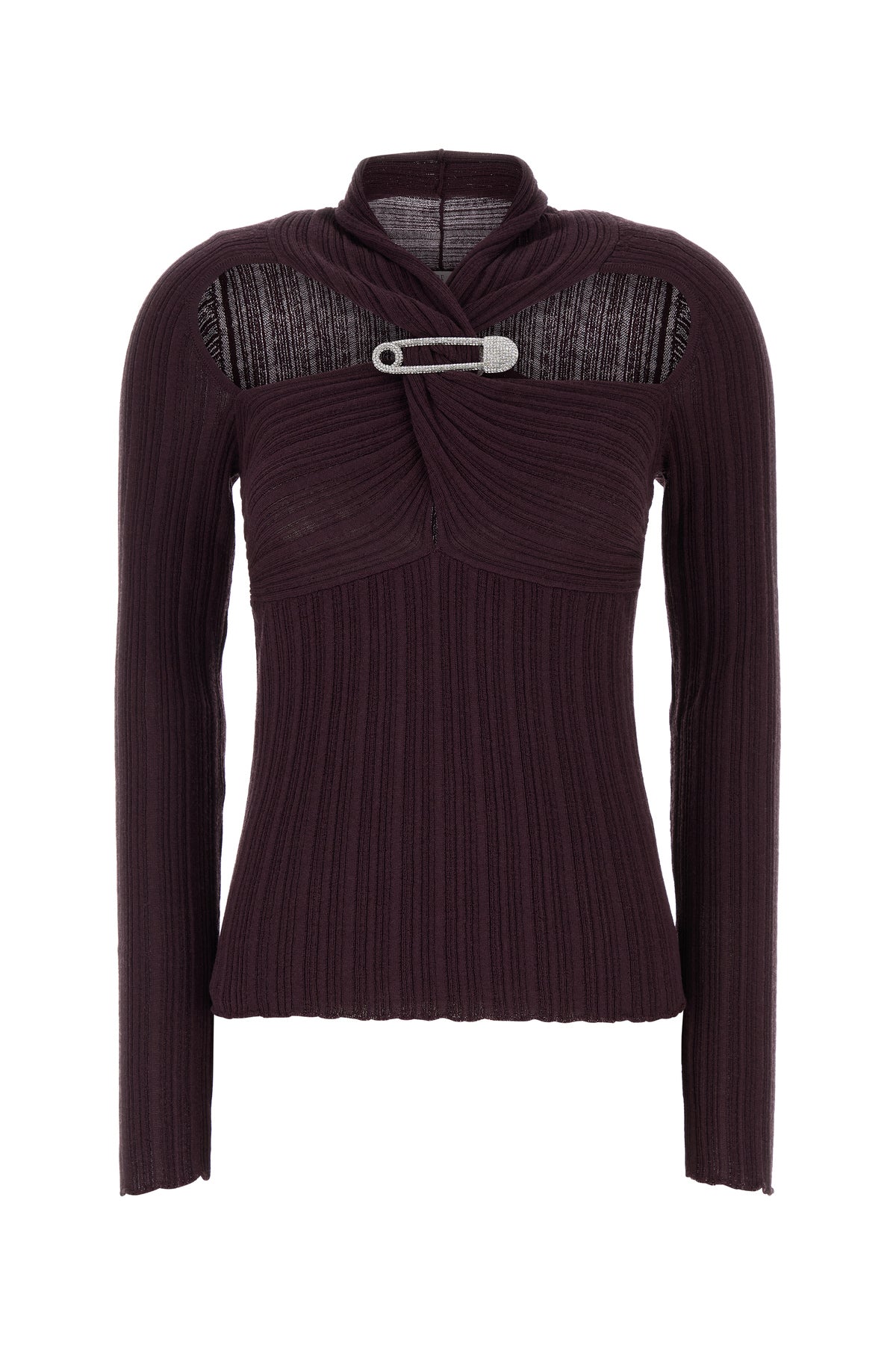 Top realizzato in misto lana merino caratterizzato da dettaglio cut-out arricchito da spilla gioiello amovibile sul petto.