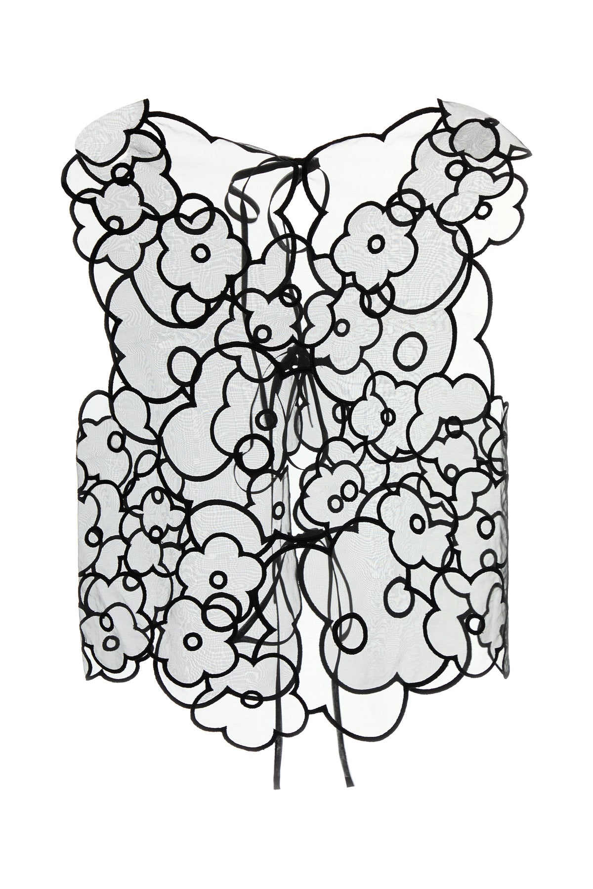 Top semitrasparente realizzato in organza caratterizzato da ricamo floreale tonale su tutta la superficie.