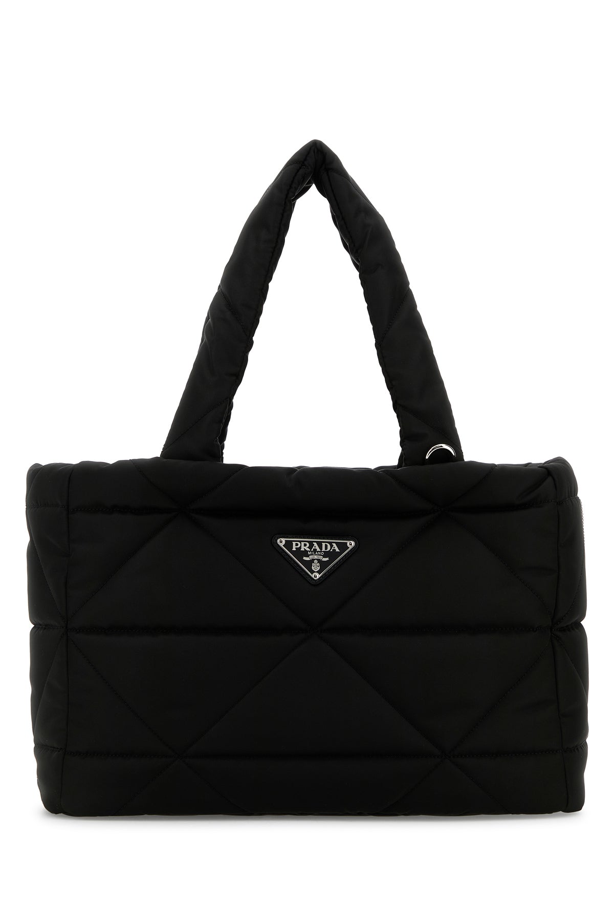 Trasportino per cani realizzato in nylon trapuntato arricchito da iconico triangolo metallico logato sulla parte frontale