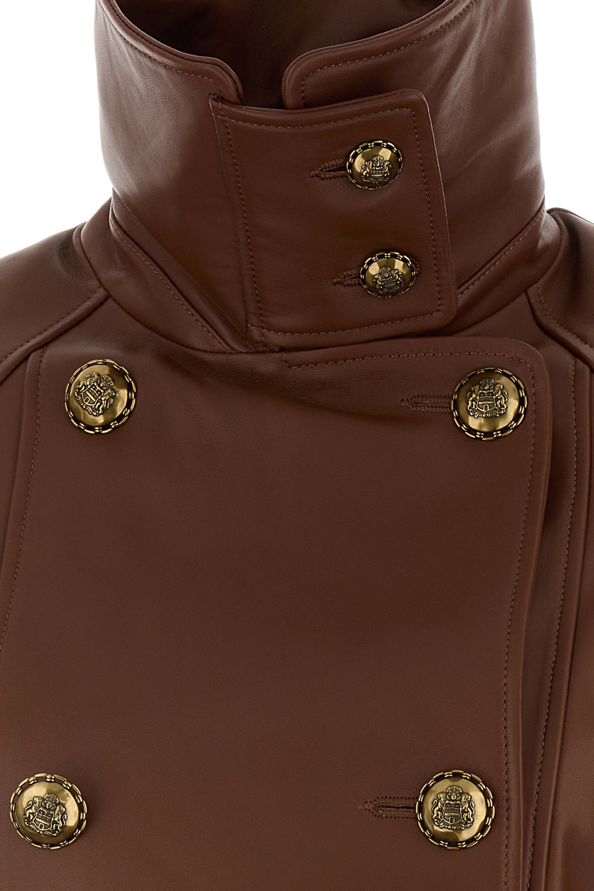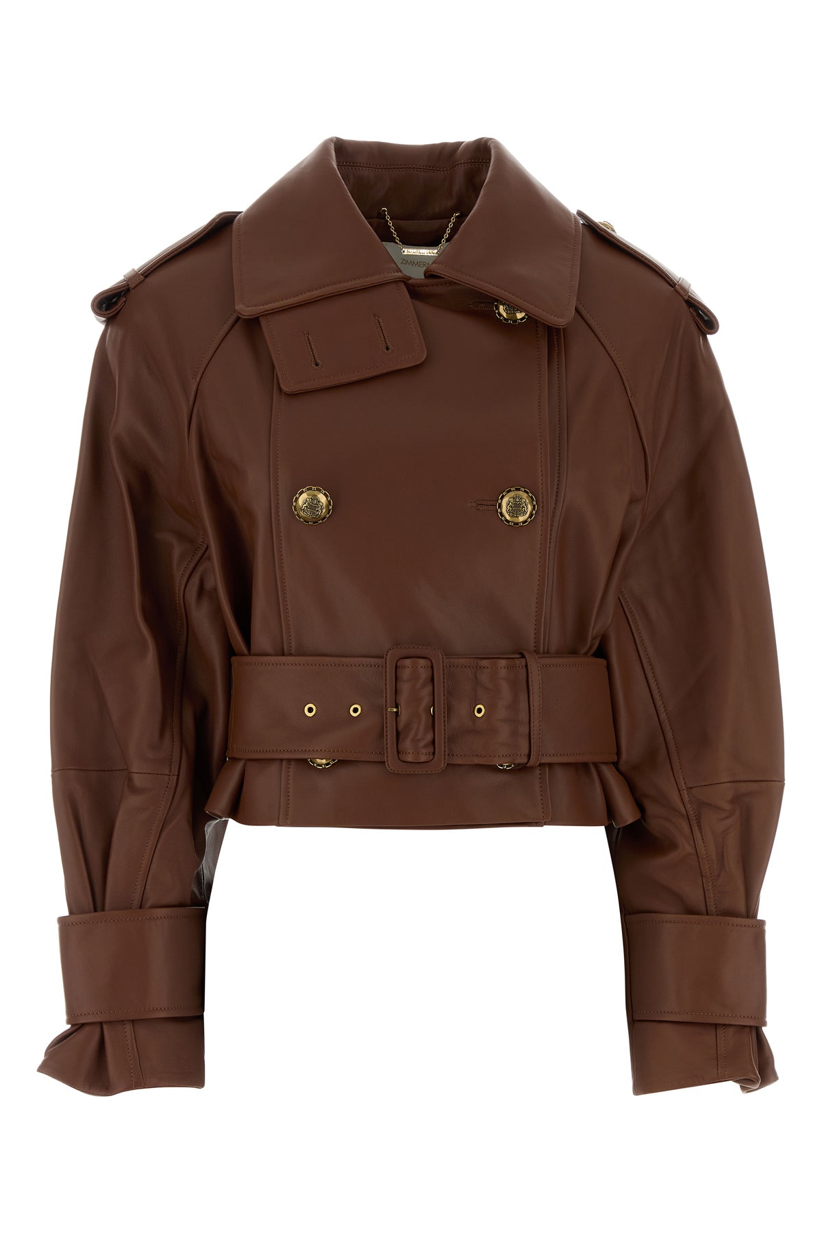 Trench dal taglio corto realizzato in pelle arricchito da cintura amovibile tonale in vita.