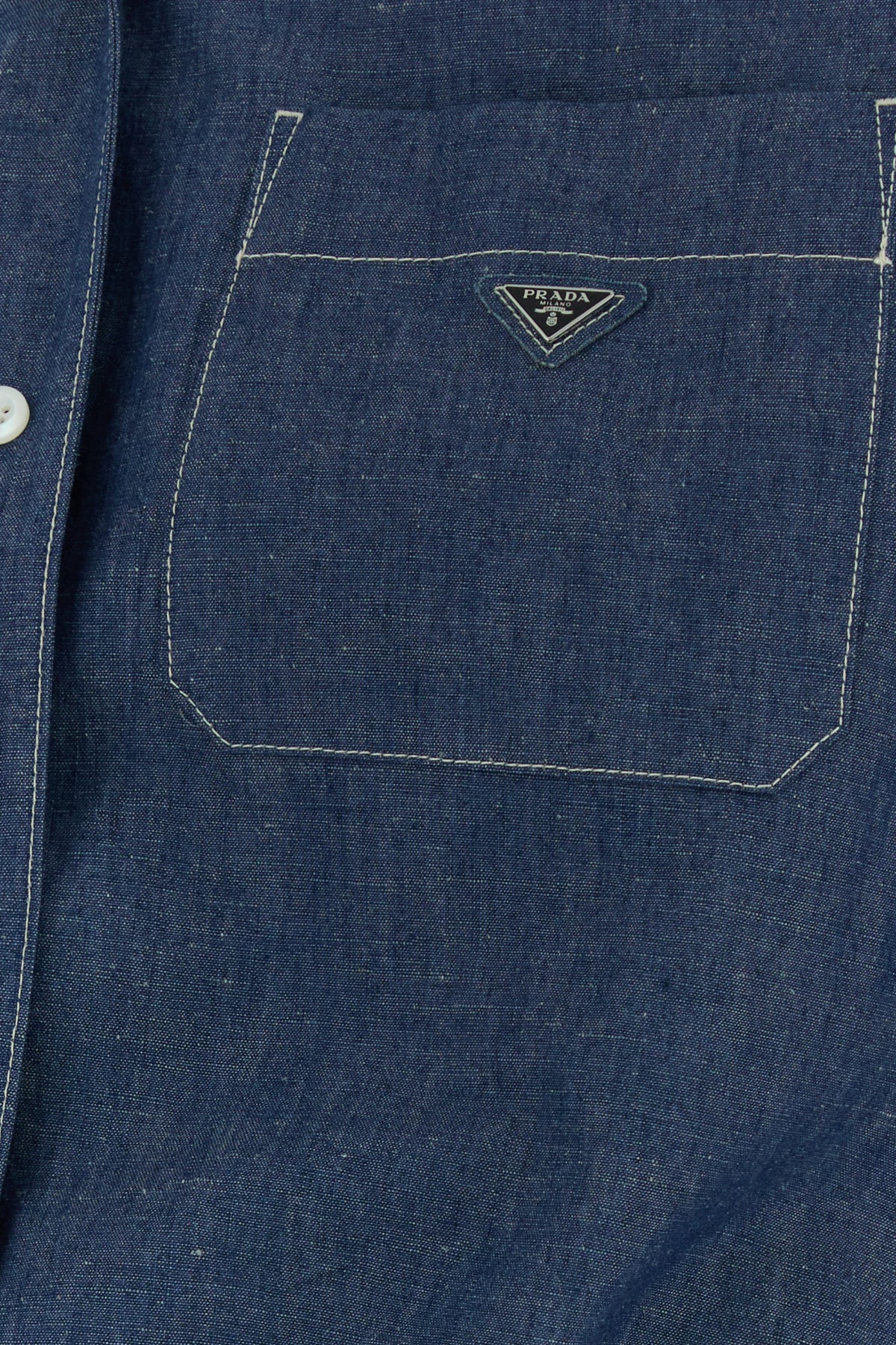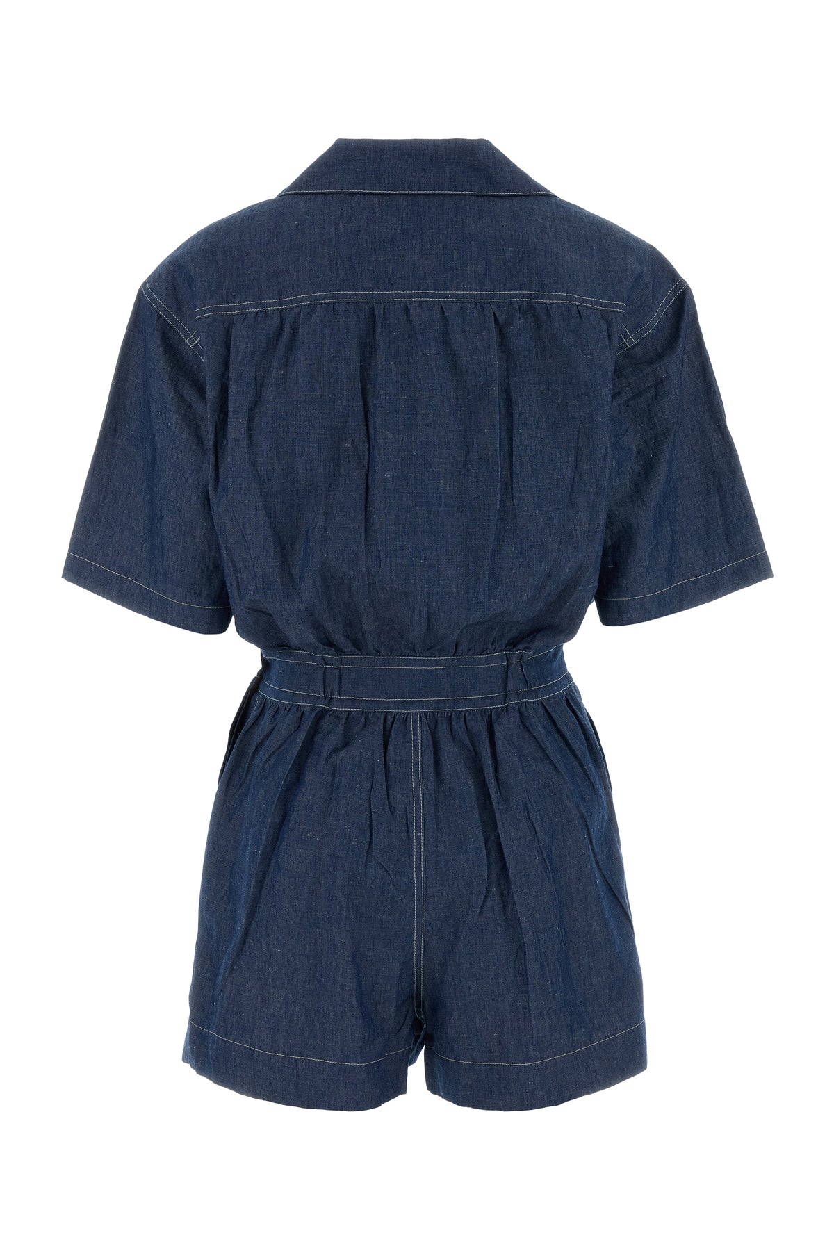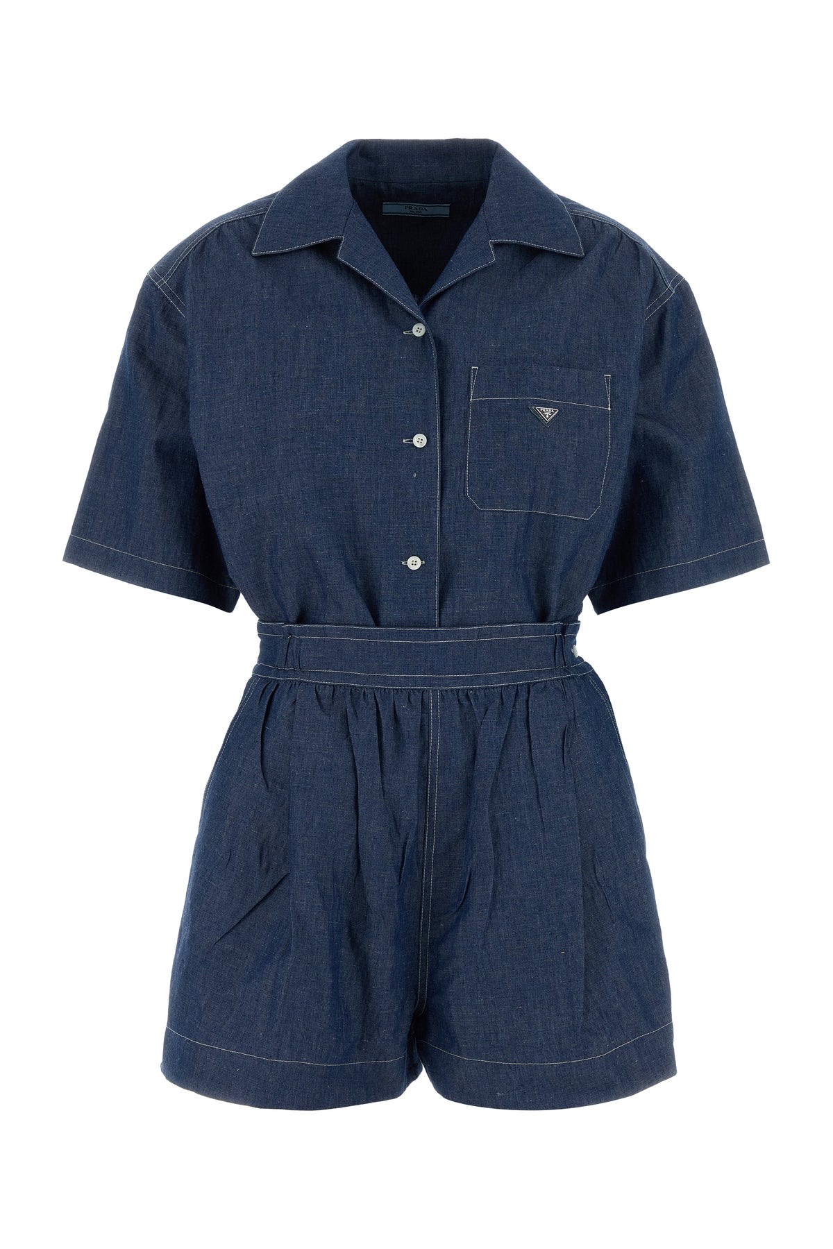 Tuta corta realizzata in chambray di cotone e lino arricchita da iconico triangolo logato in metallo sul petto.