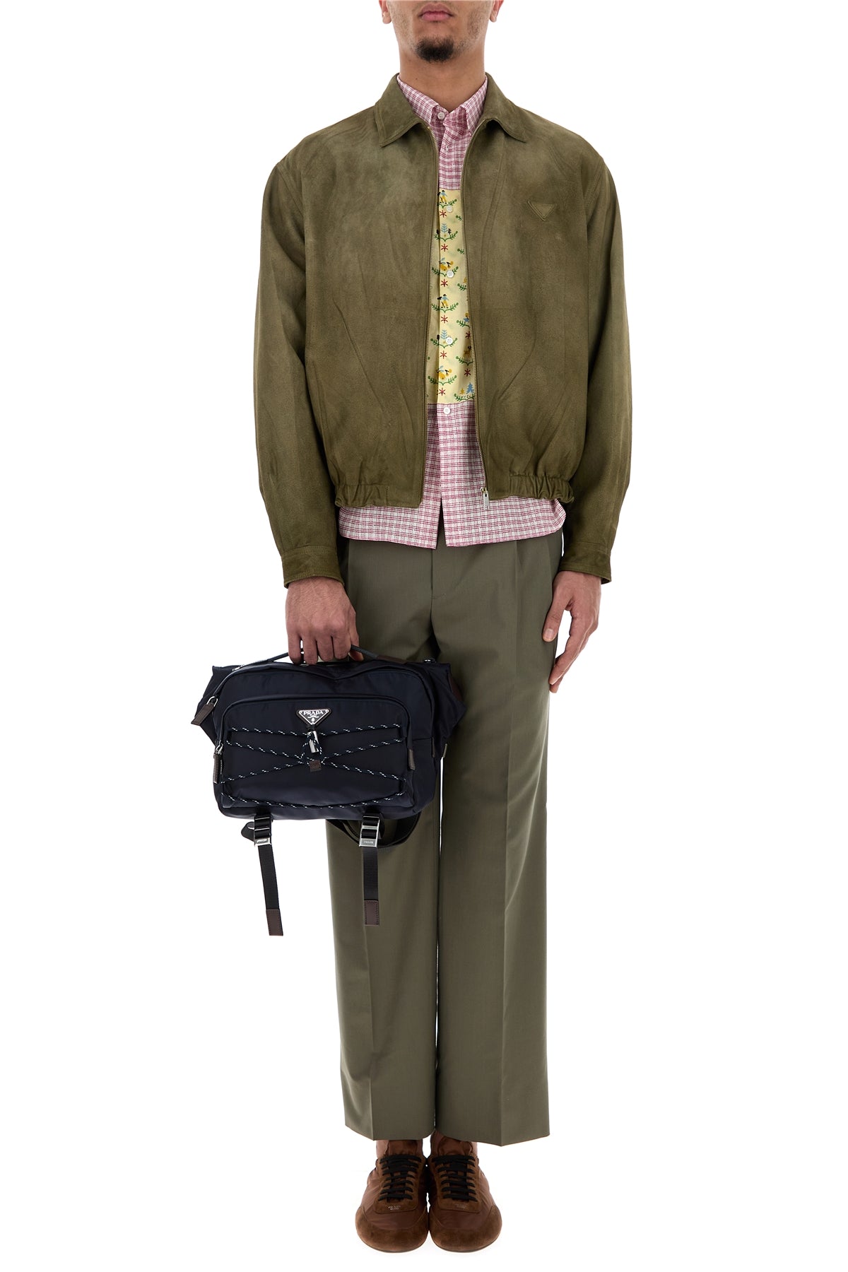 Jacket realized in lamb suede enriched by iconic leather triangle on the chest.
