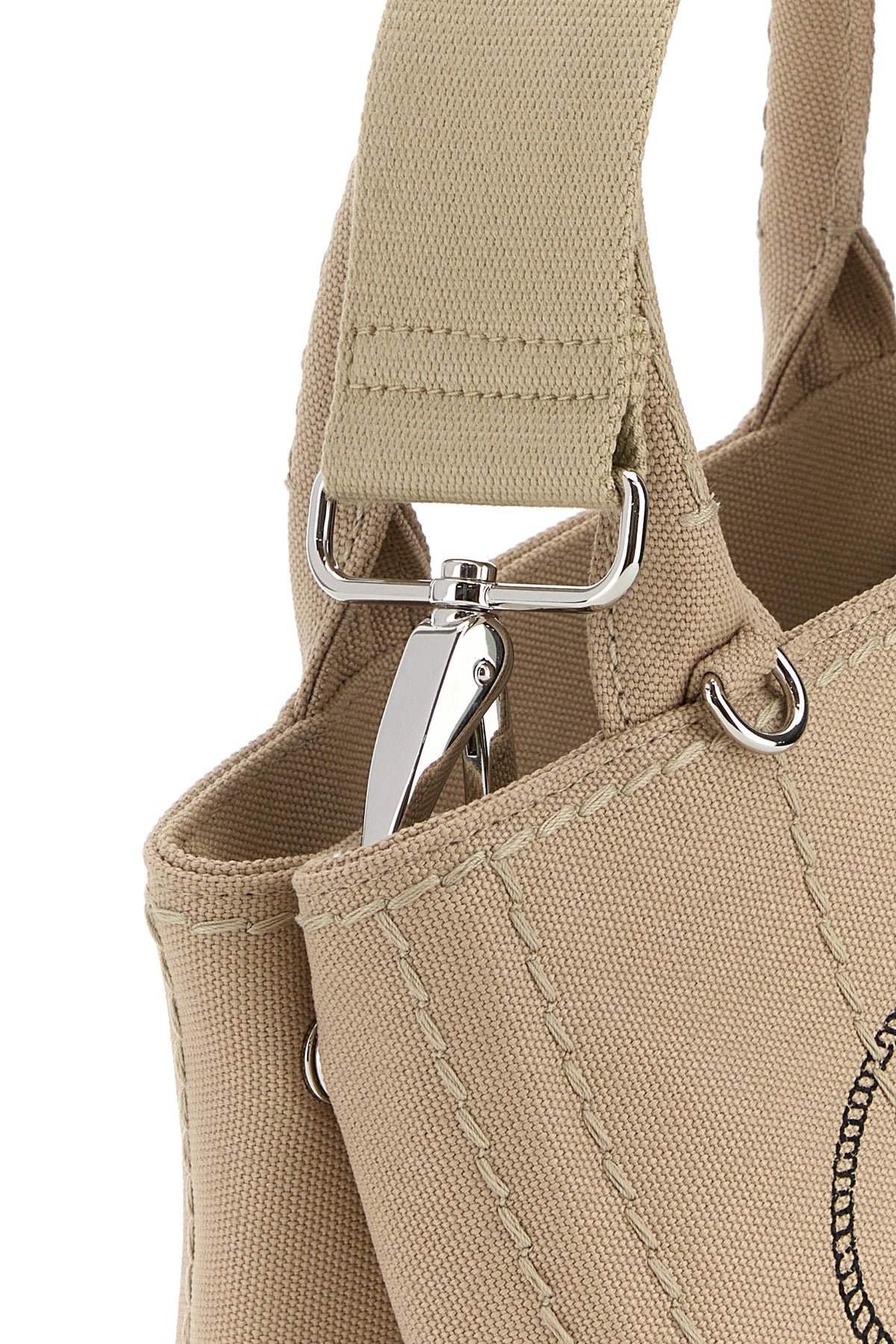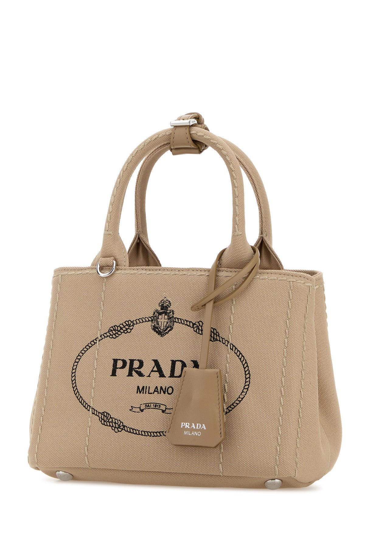 Handbag realized in canvas characterized by printed logo at the front enriched by iconic logoed metal triangle on the side.