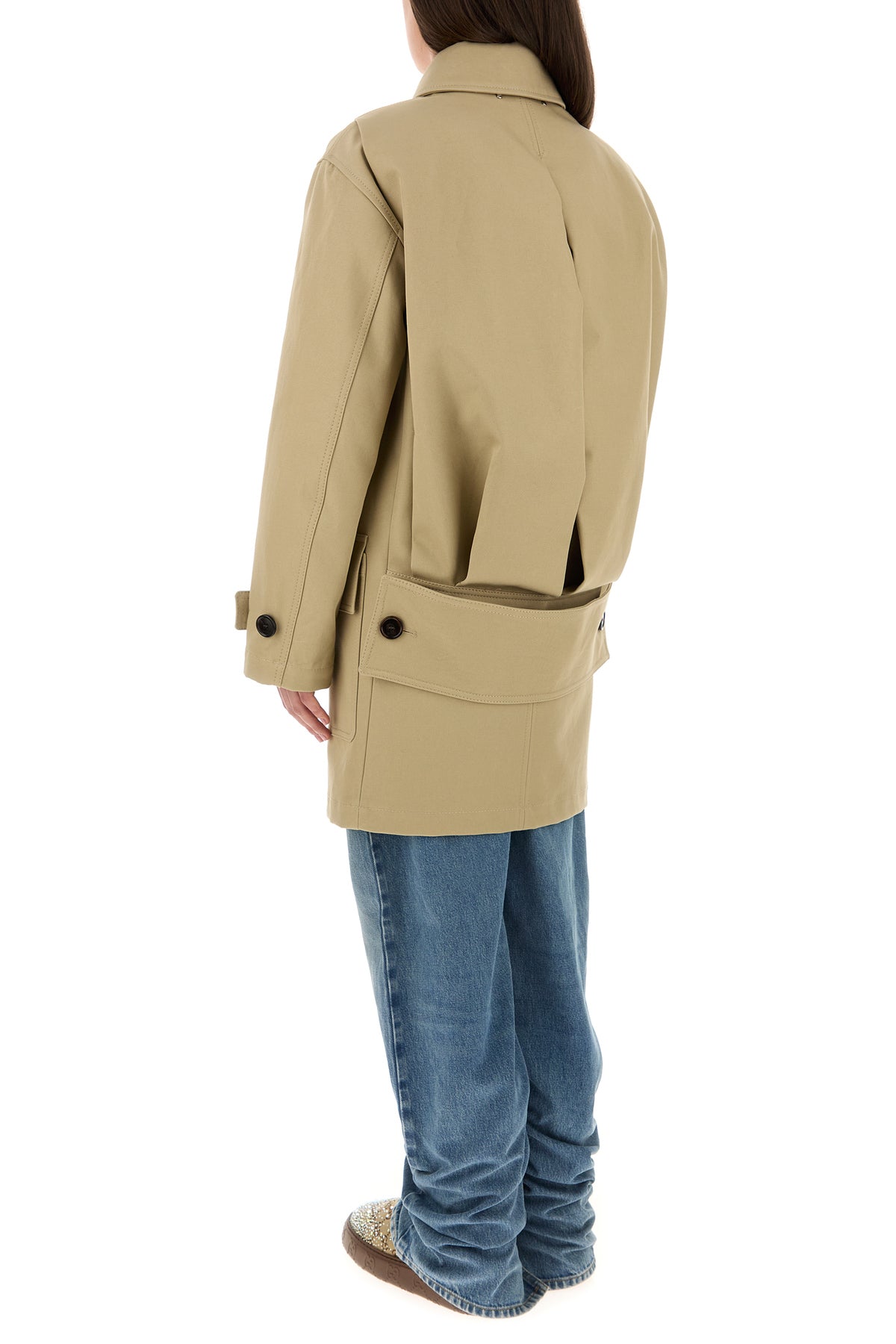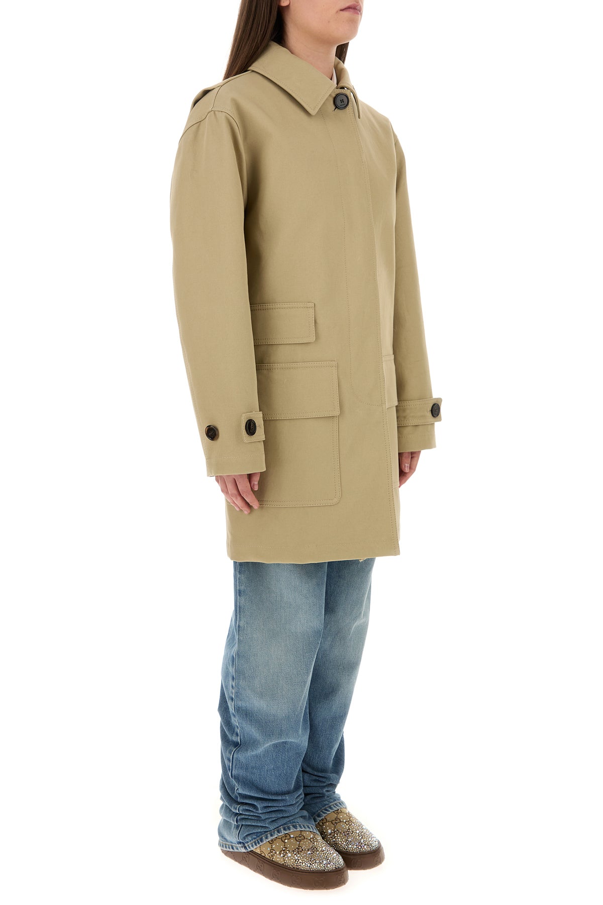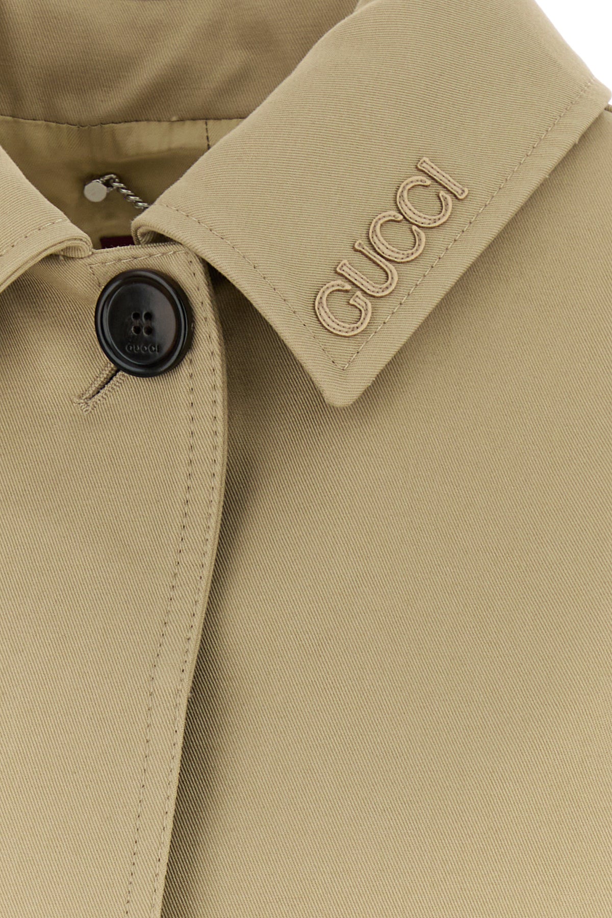 Overcoat realized in pure cotton drill enriched by tonal Gucci patch on the collar.