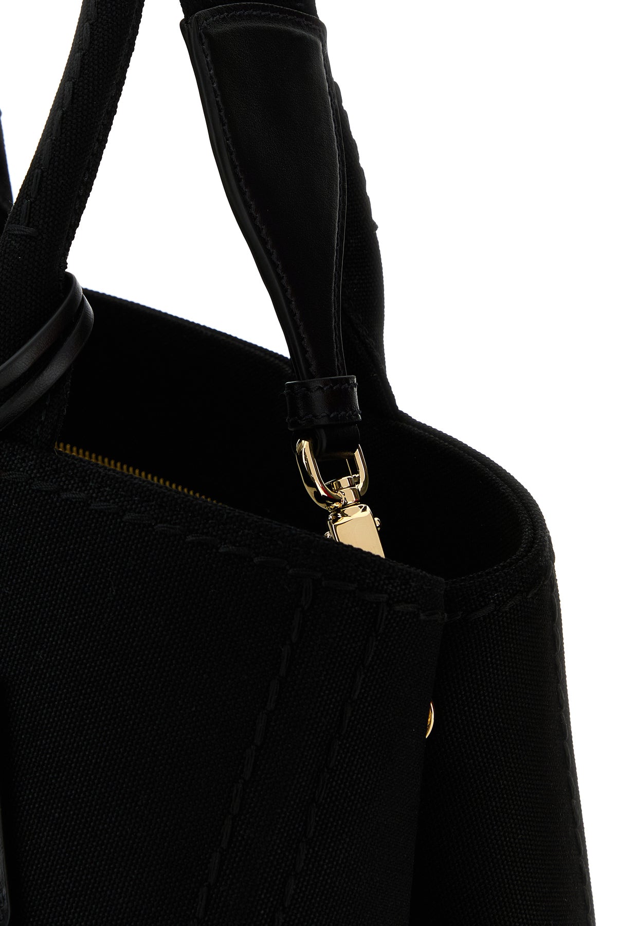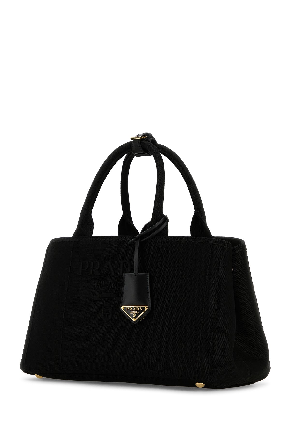 Shopping bag realized in canvas characterized by tonal embroidered logo at the front enriched by detachable keyring accessory with iconic logoed metal triangle at the front.