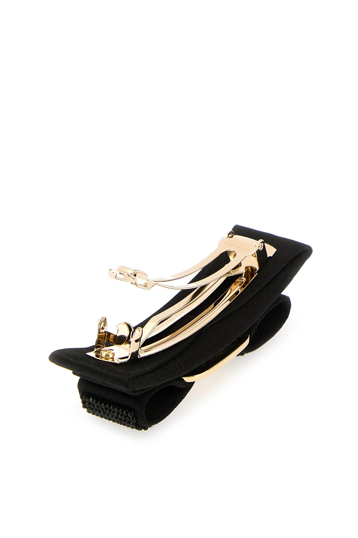 Hair clip realized in fabric enriched by logoed metal detail and tonal beads.