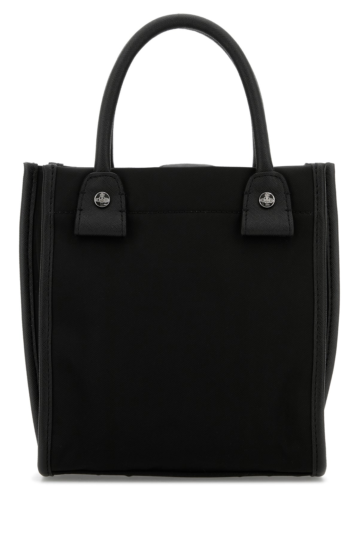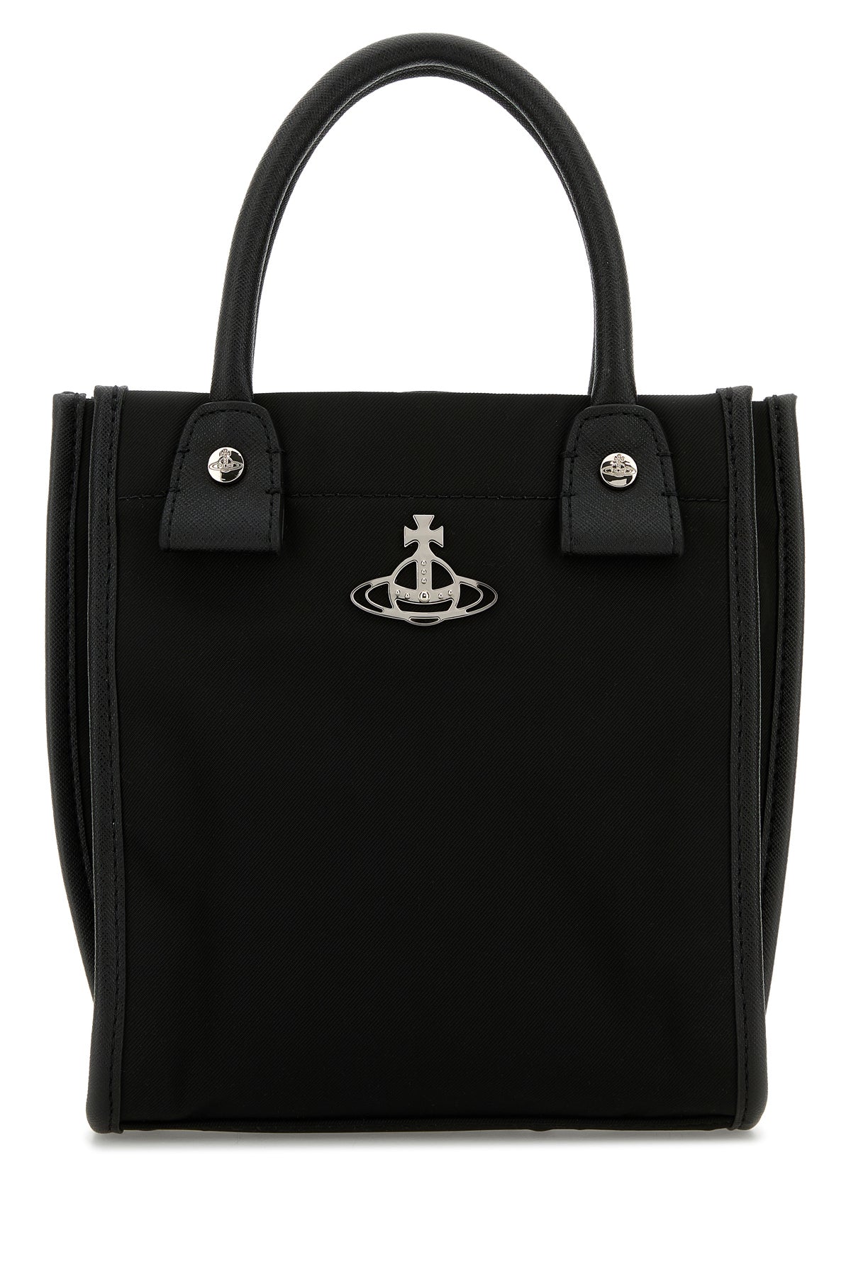 Handbag realized in fabric with tonal grained synthetic leather trimmings enriched by metal Orb detail at the front.
