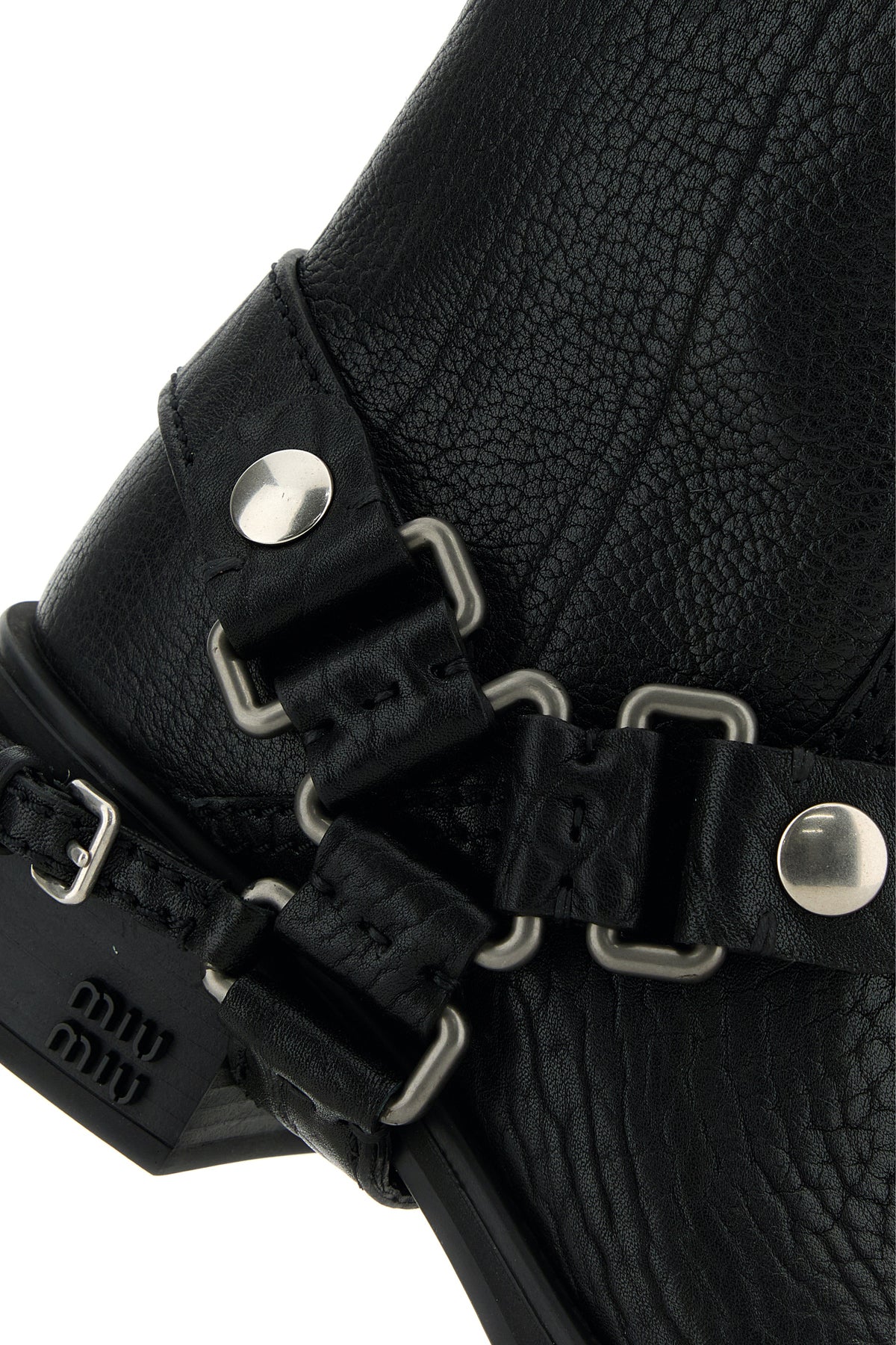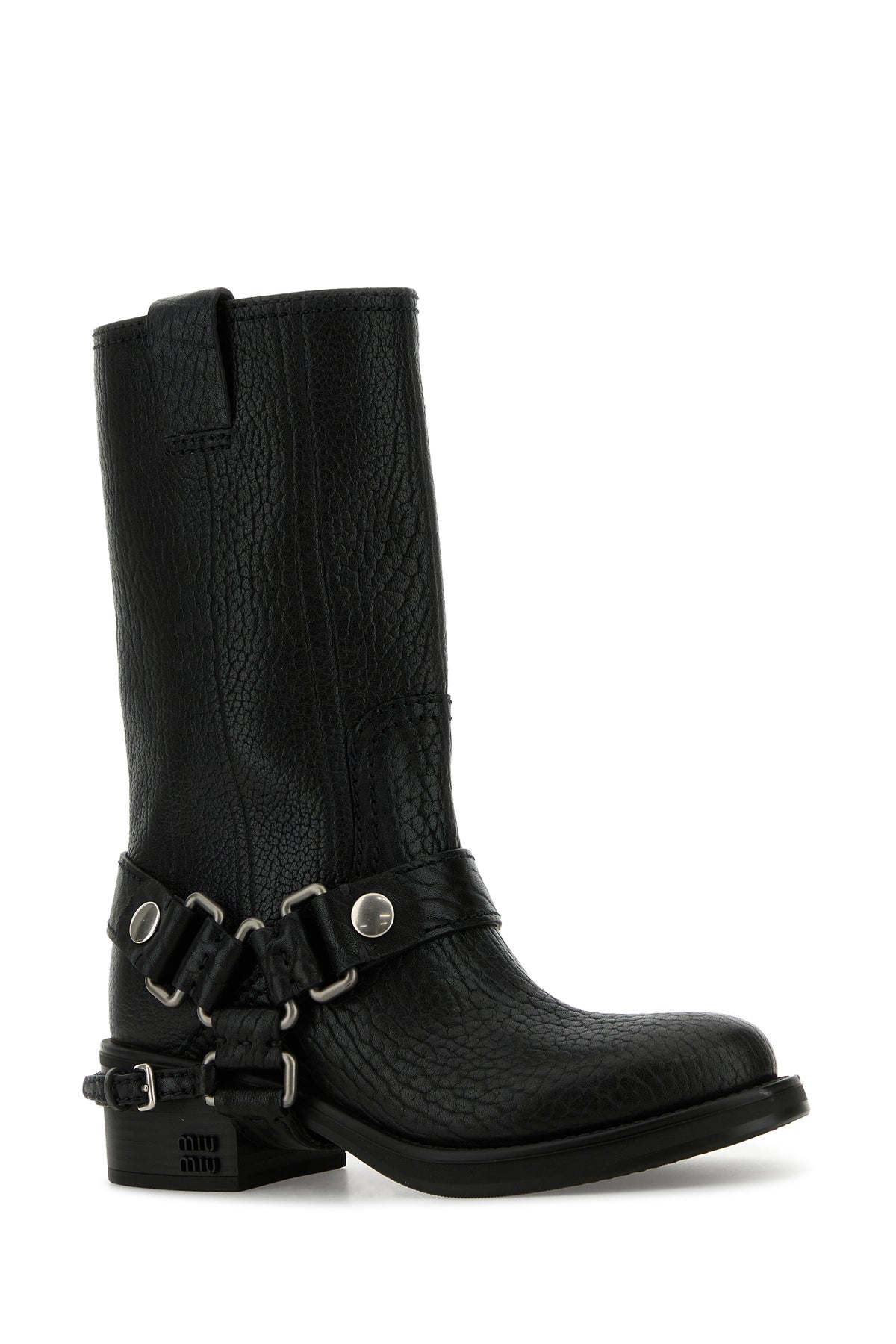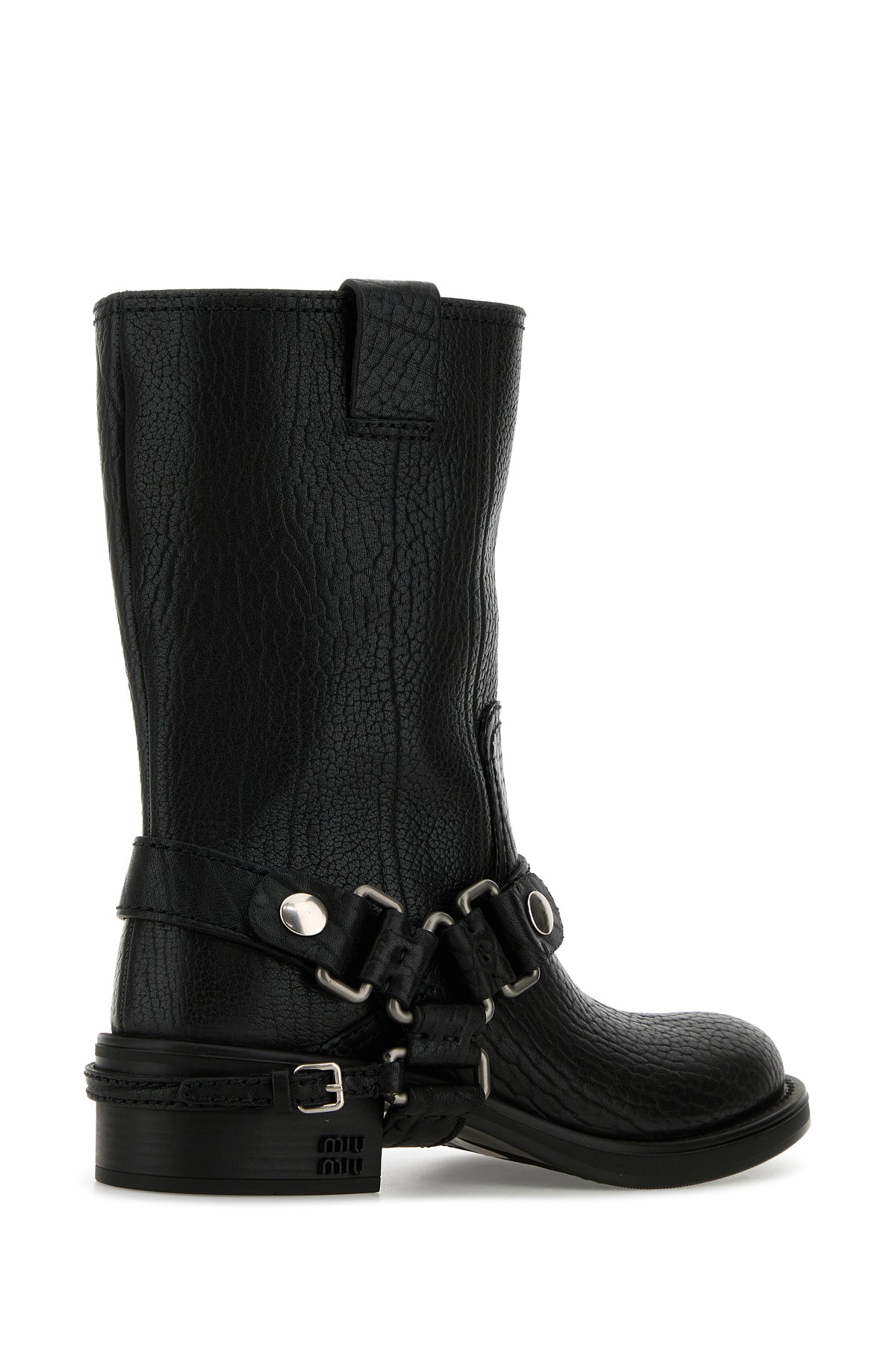 Ankle boots realized in pebble calf leather enriched by decorative straps with metal buckles on the hemline and metal lettering logo on the side.