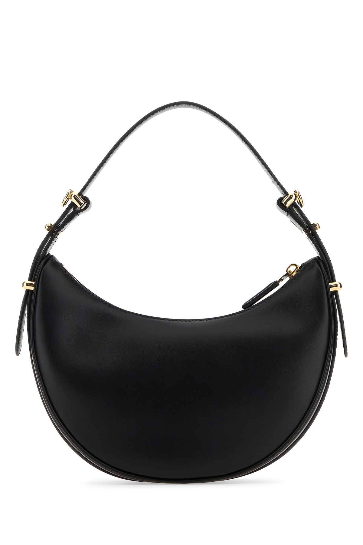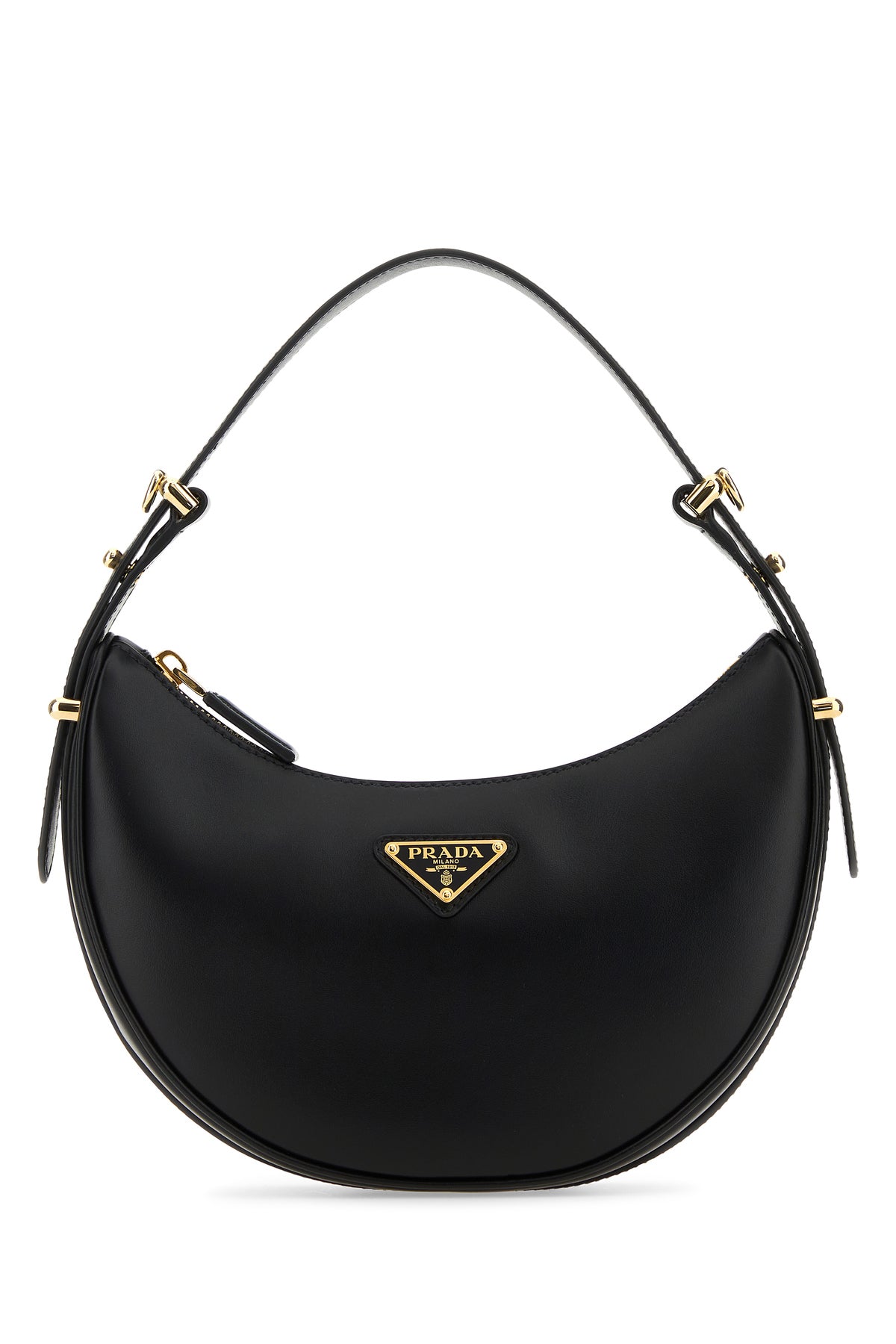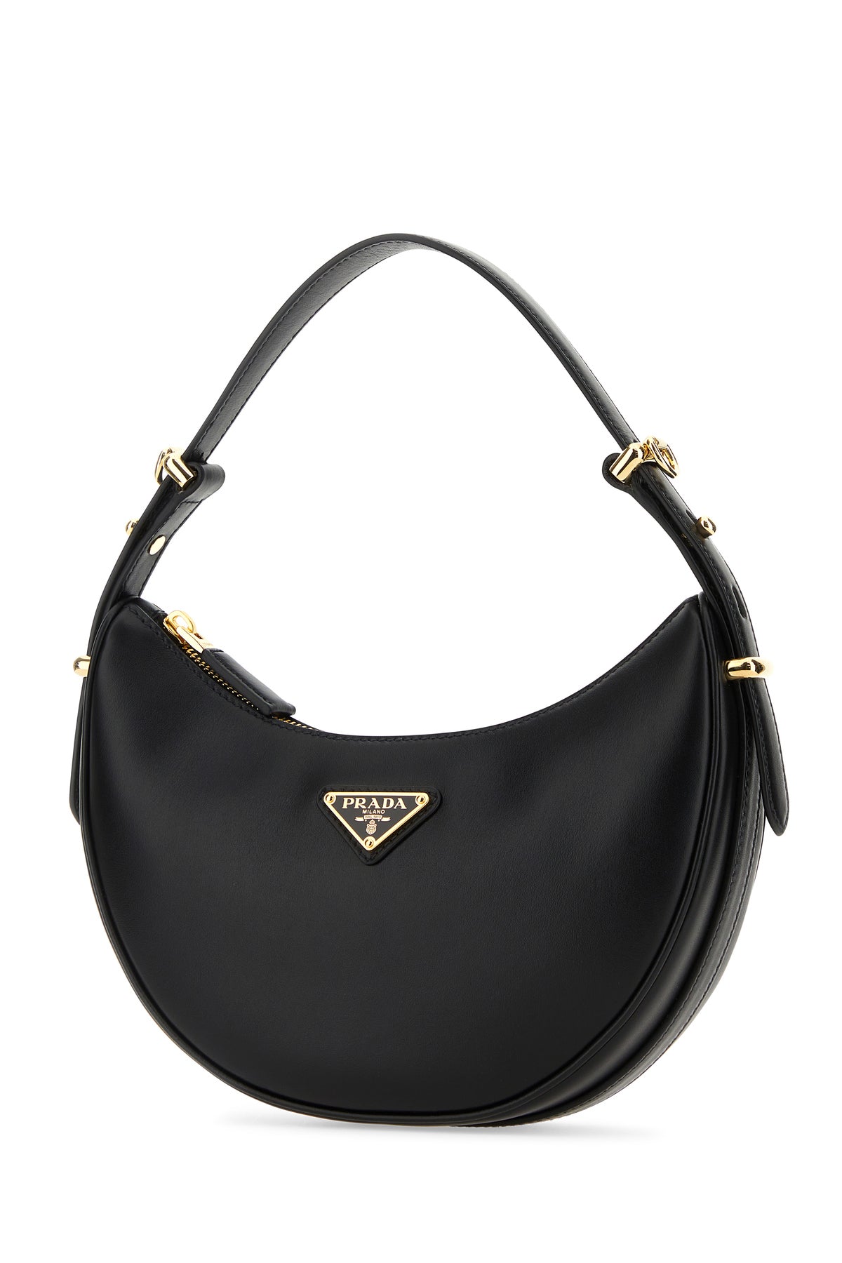 Handbag realized in smooth calf leather enriched by iconic metal logoed triangle at the front.