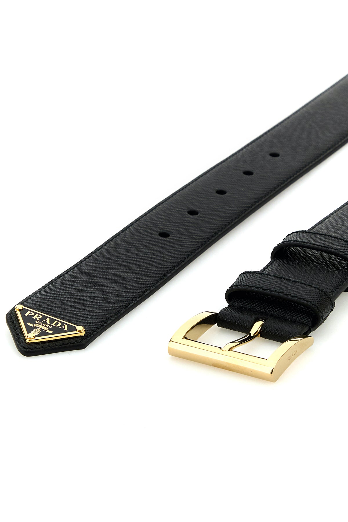 Belt realized in Saffiano leather enriched by metal iconic logoed triangle.