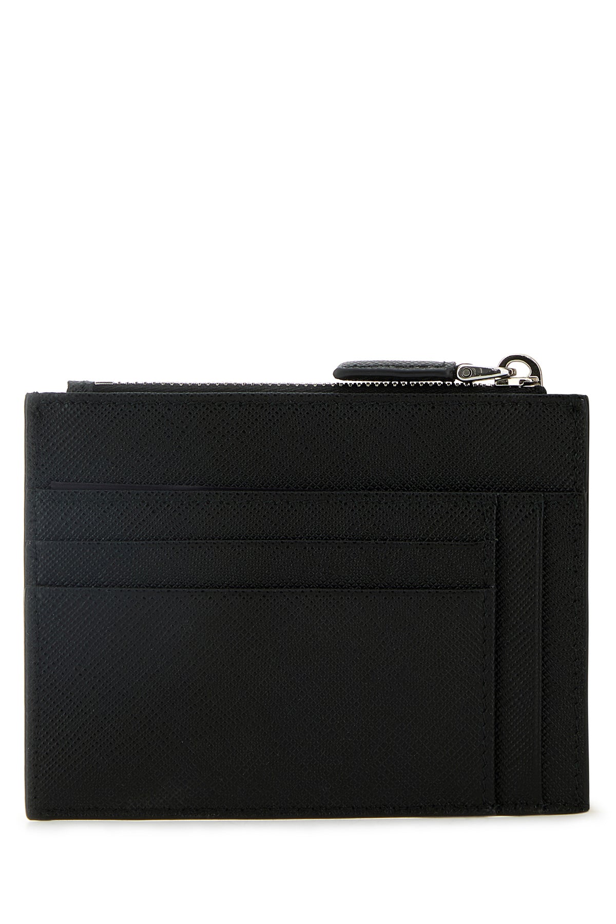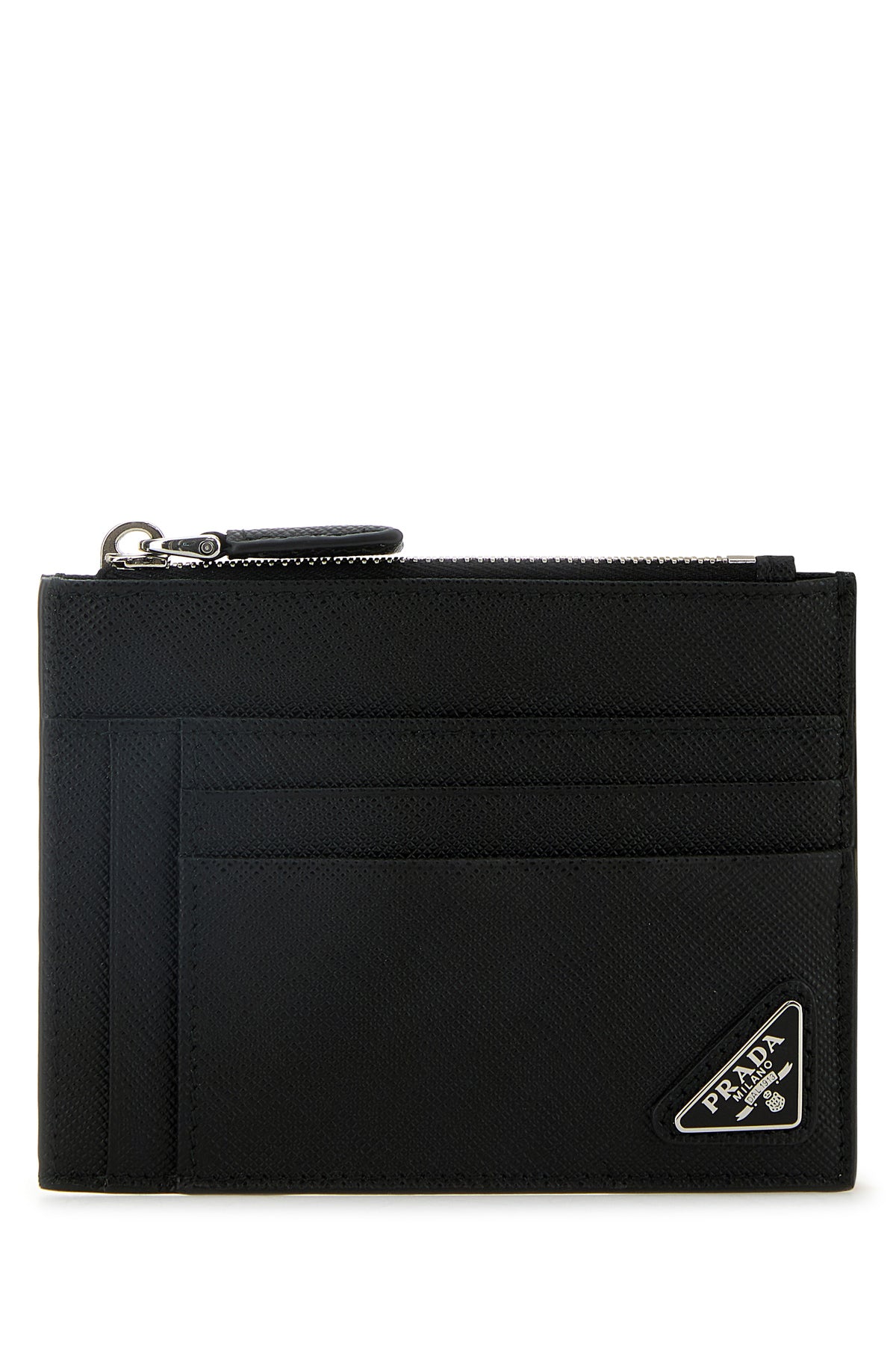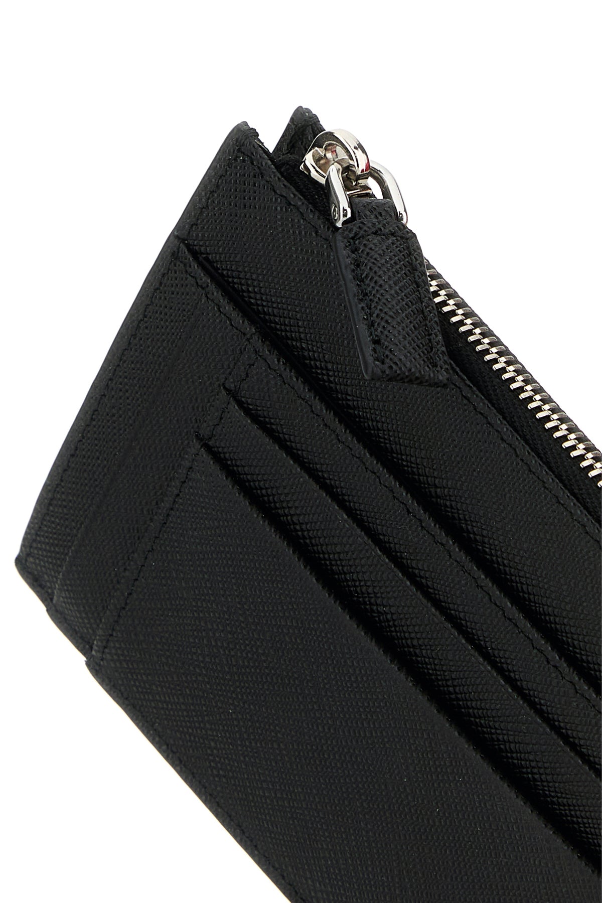 Card holder realized in Saffiano leather enriched by iconic metal logoed triangle at the front.