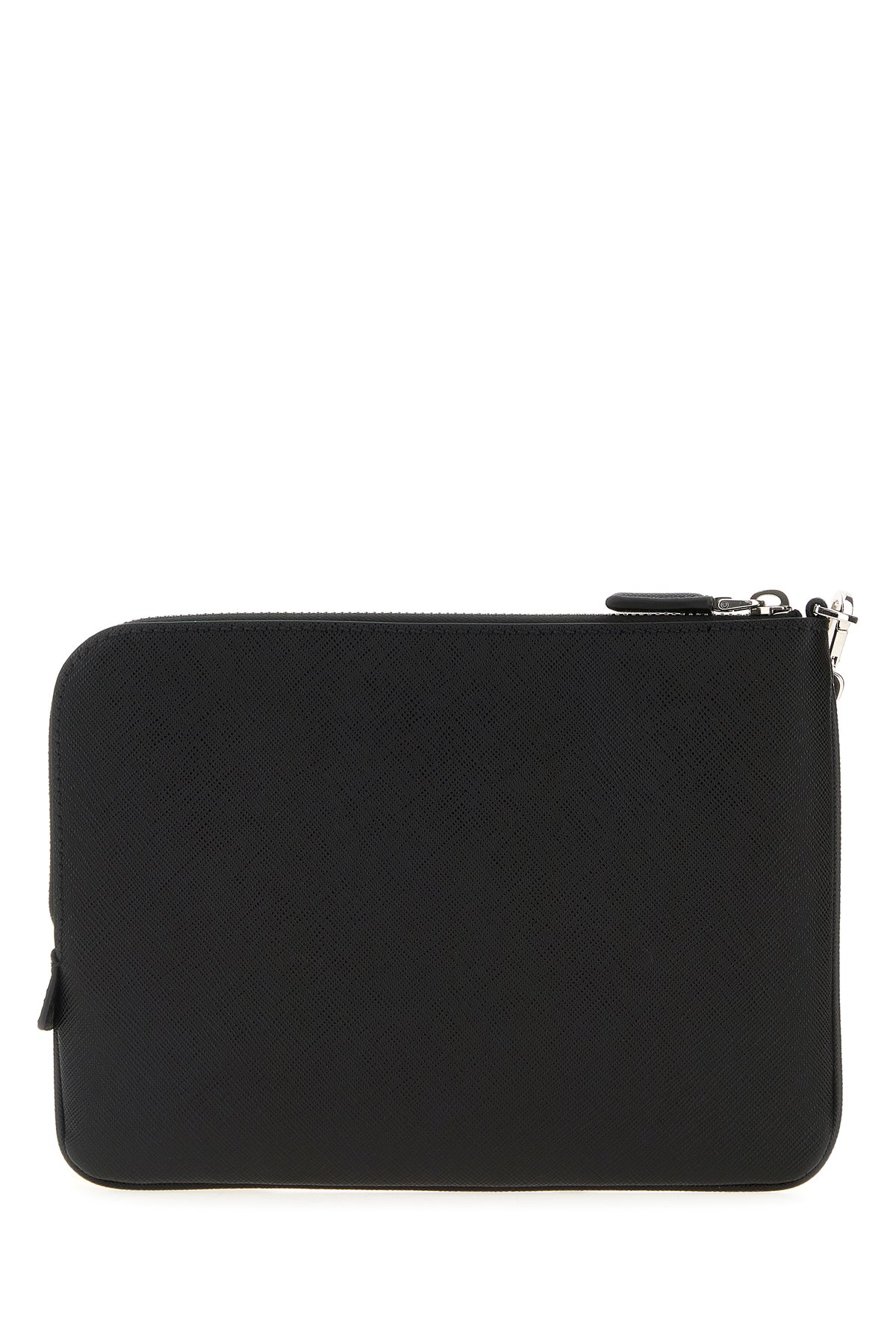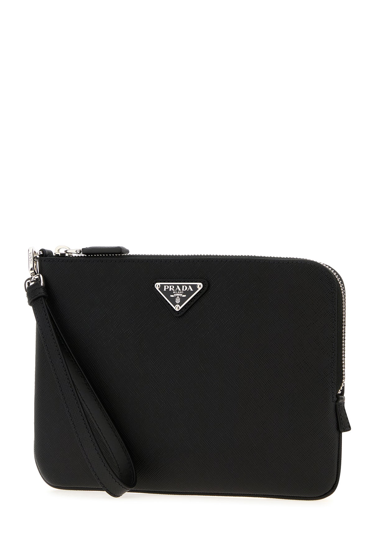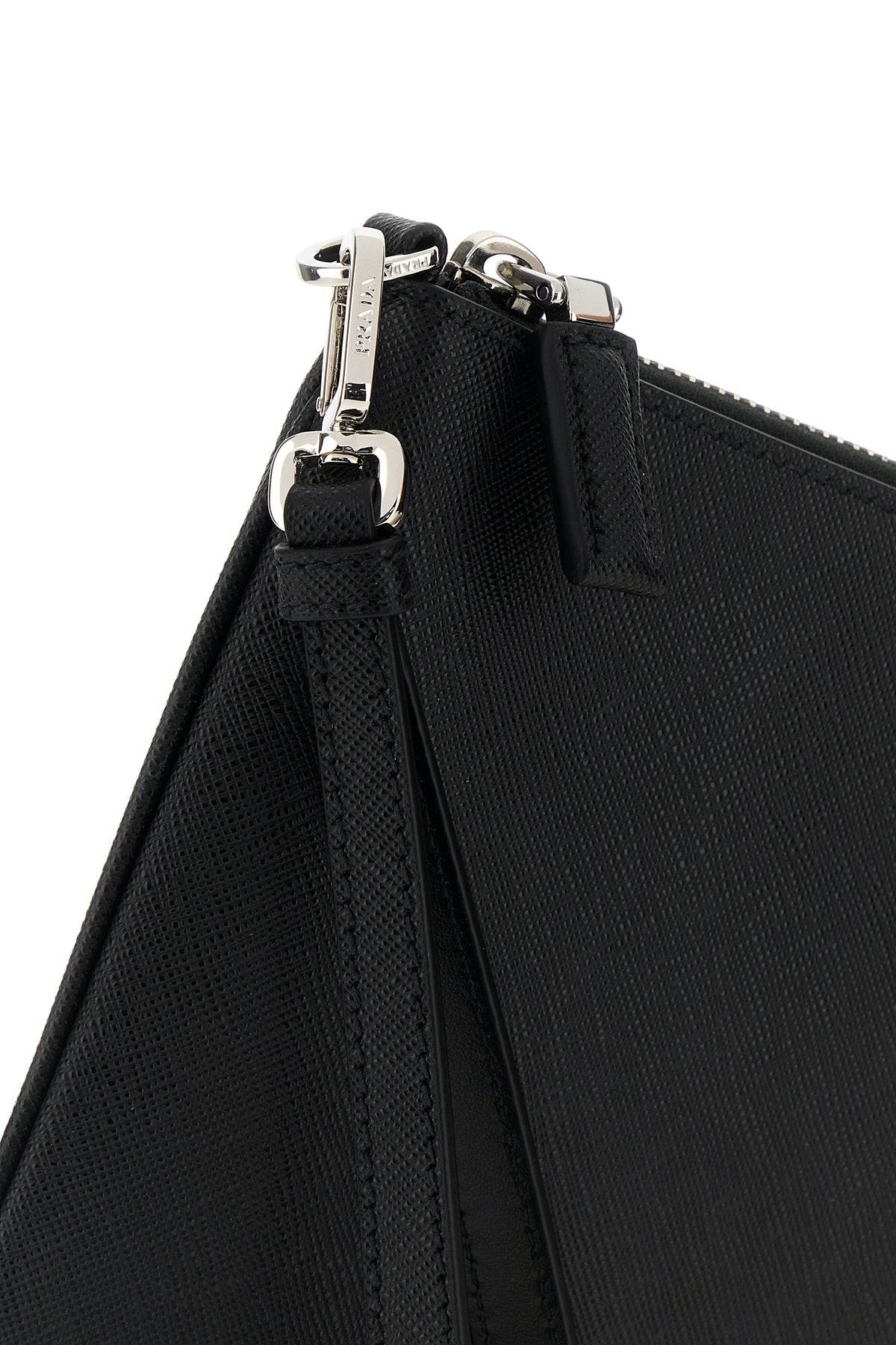 Clutch realized in Saffiano leather enriched by iconic metal logoed triangle at the front.