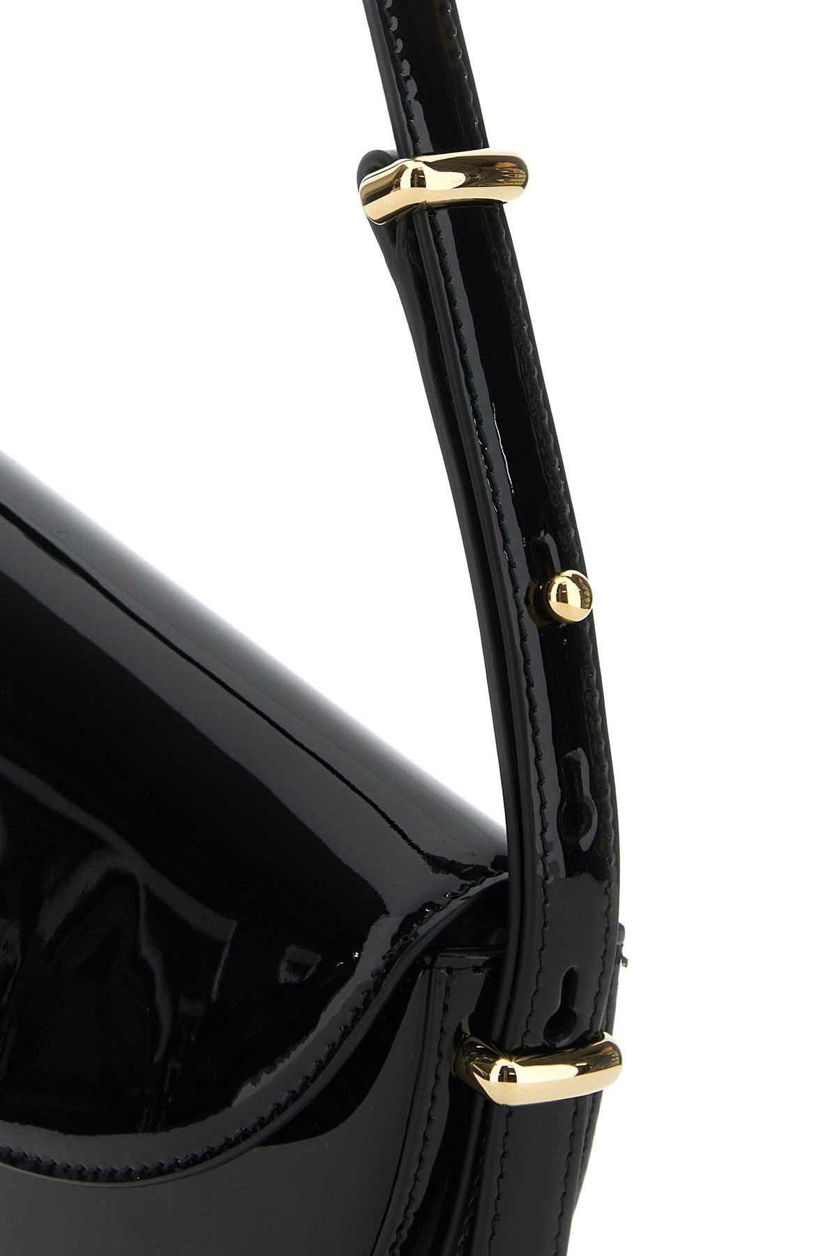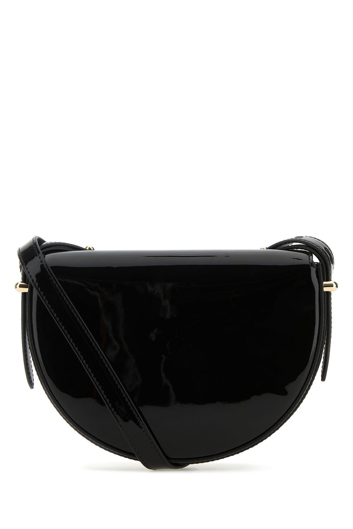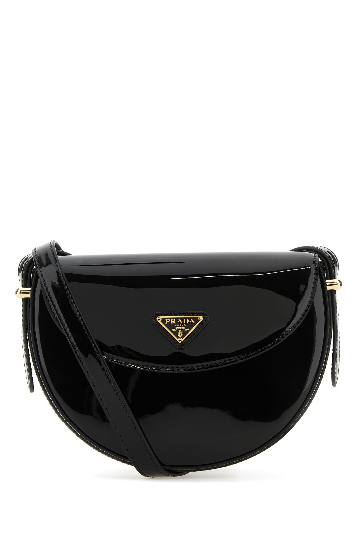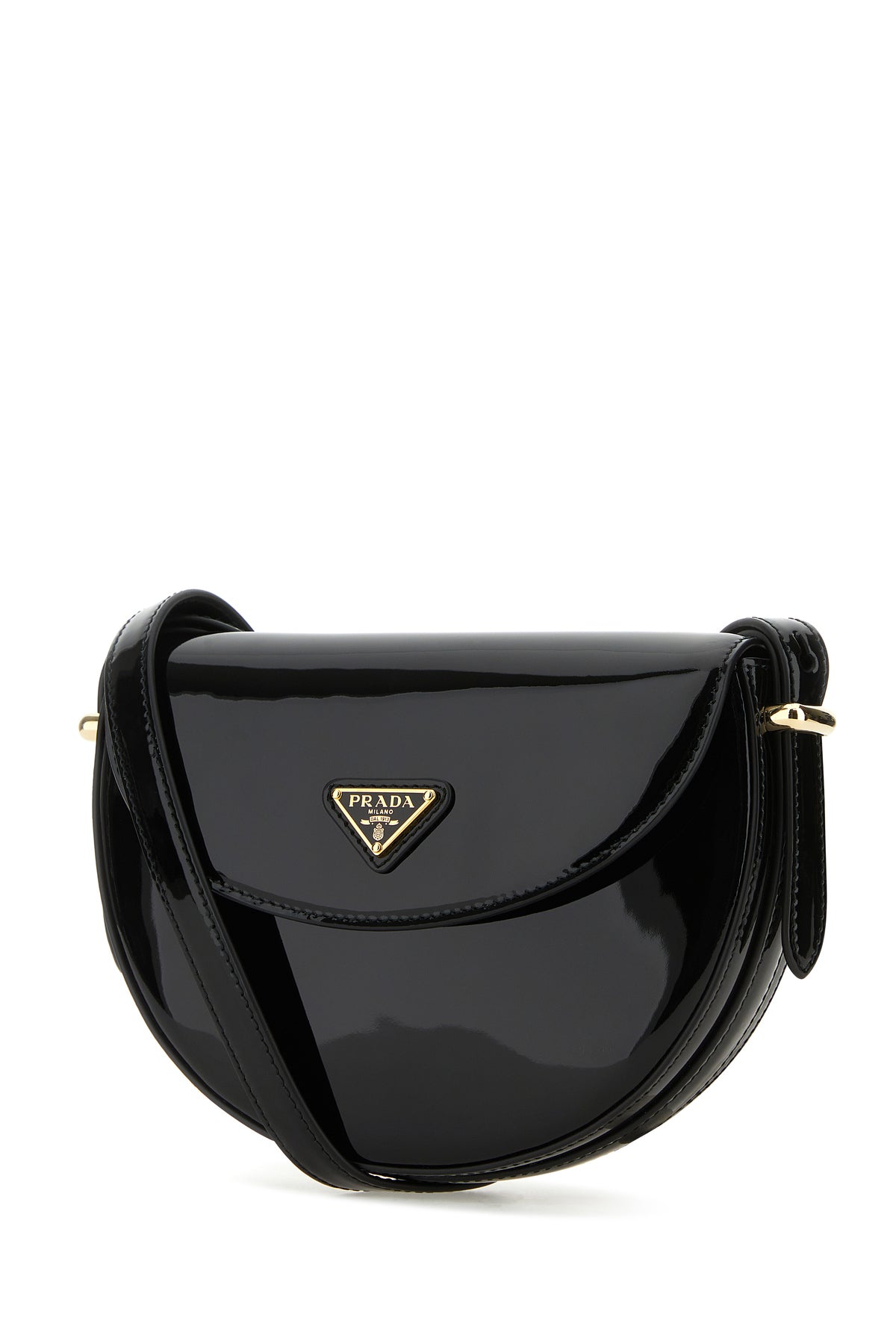 Crossbody bag realized in patent smooth leather enriched by iconic logoed triangle at the front.