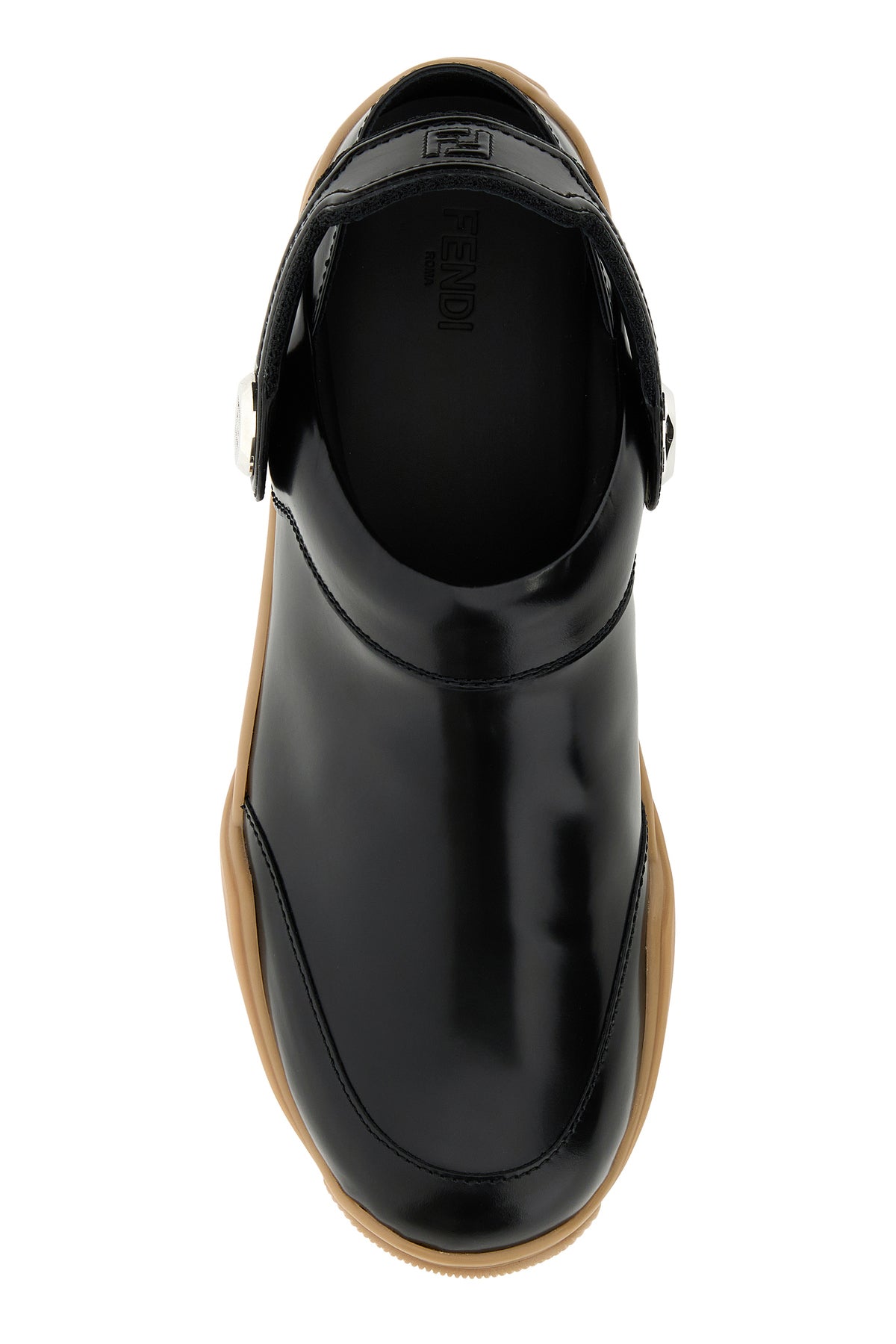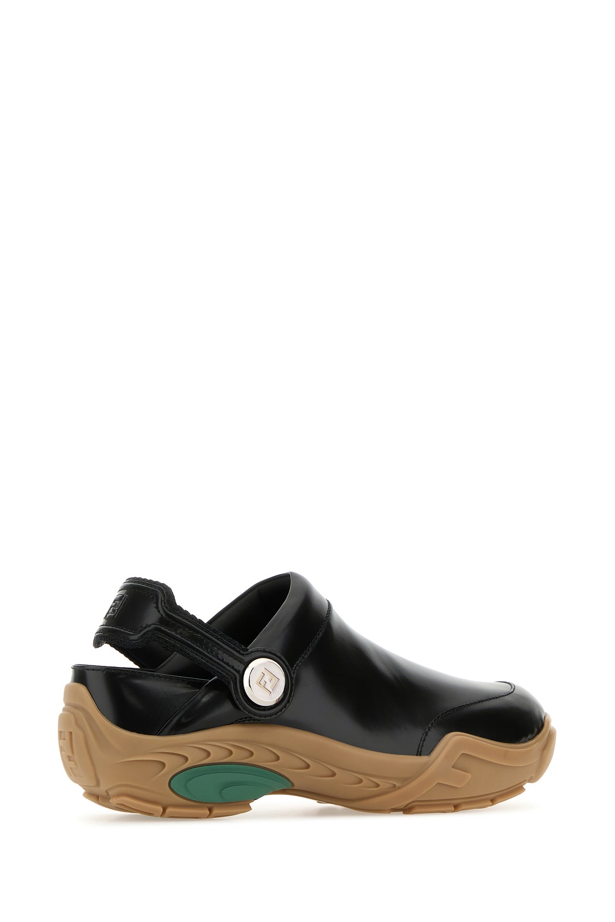 Mules realized in smooth calf leather characterized by tonal FF embroidery at the back enriched by metal FF details on the sides.