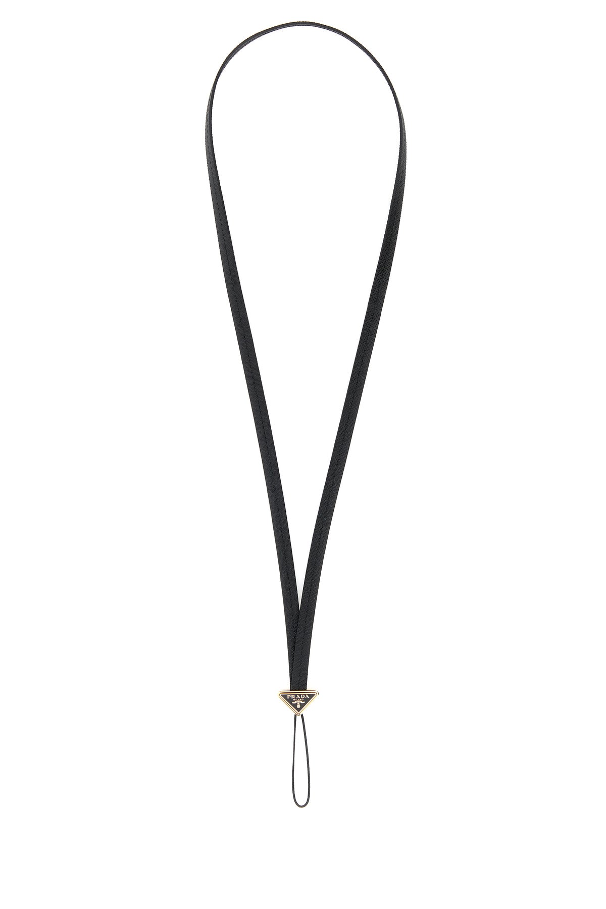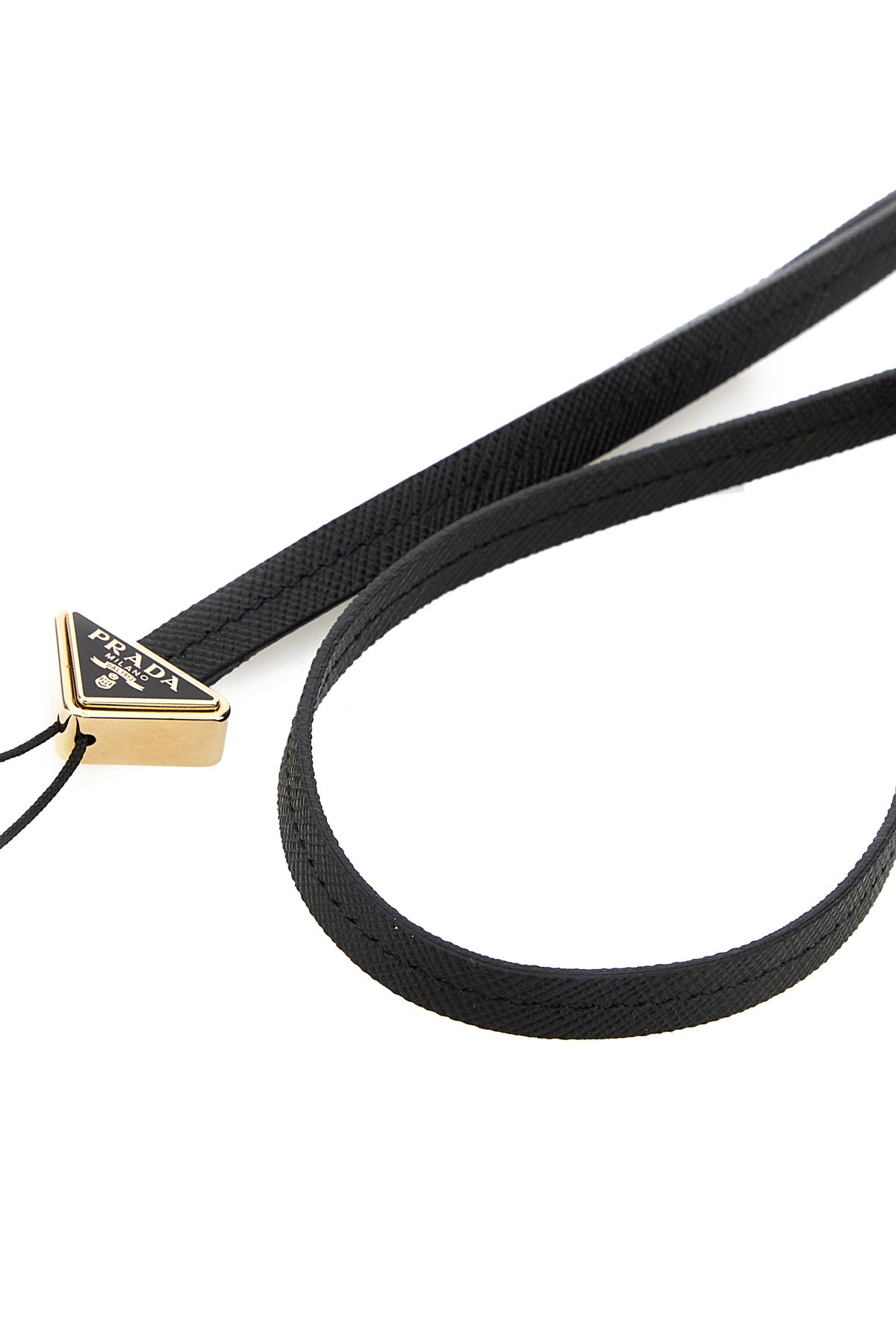 Headphone holder realized in leather enriched by iconic logoed metal triangle.