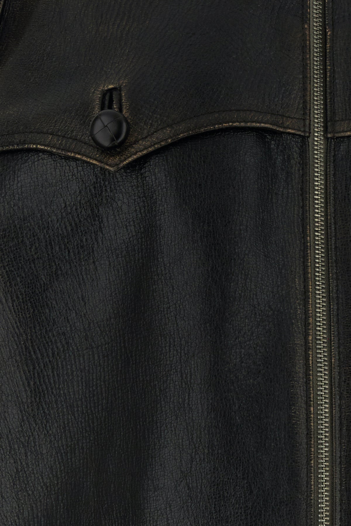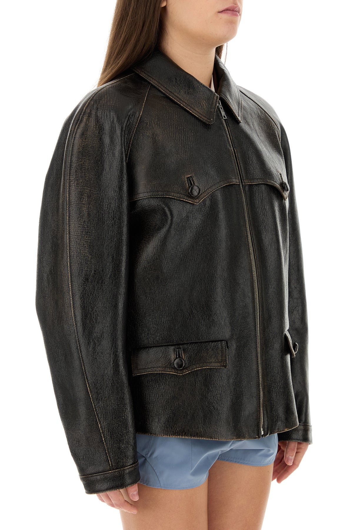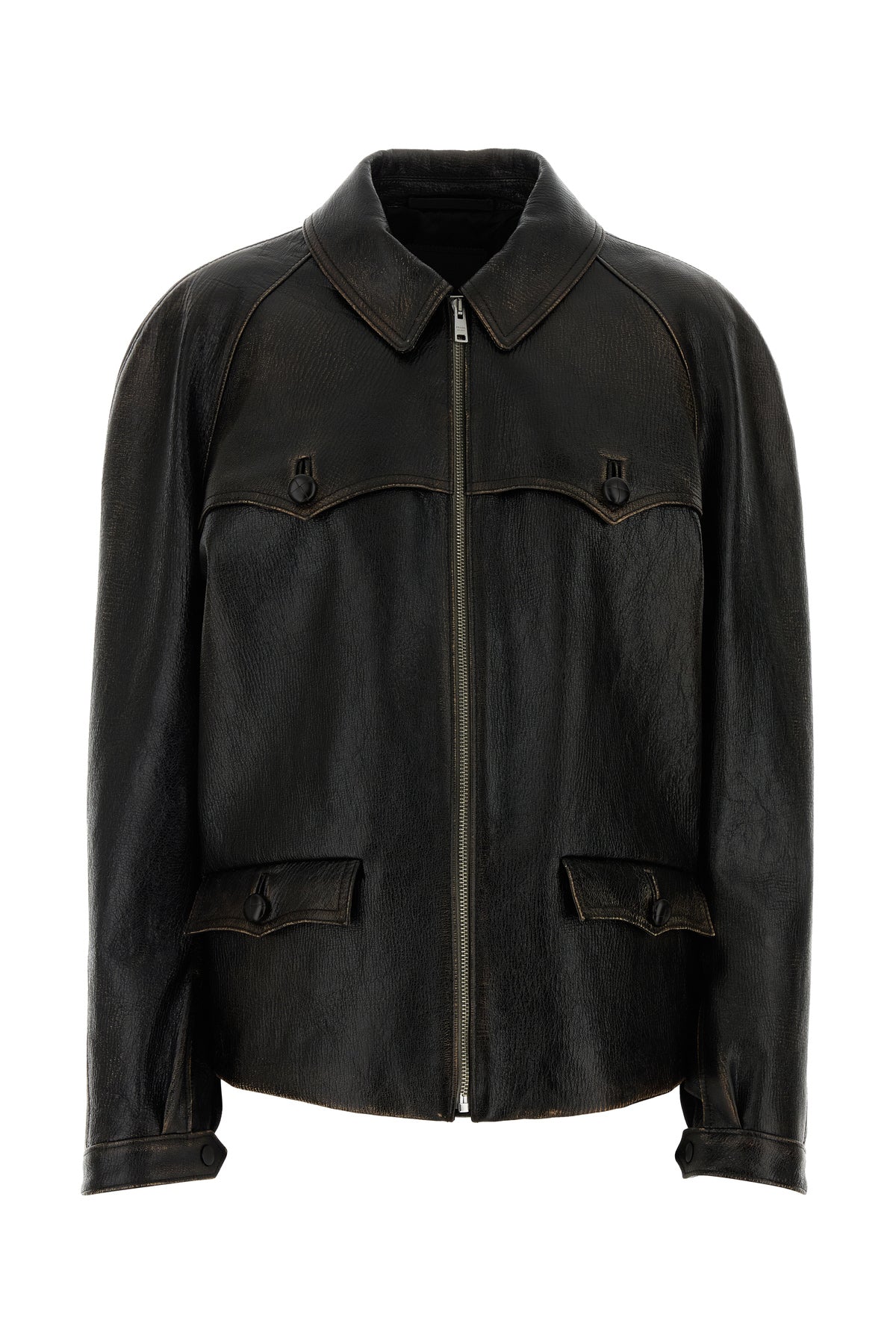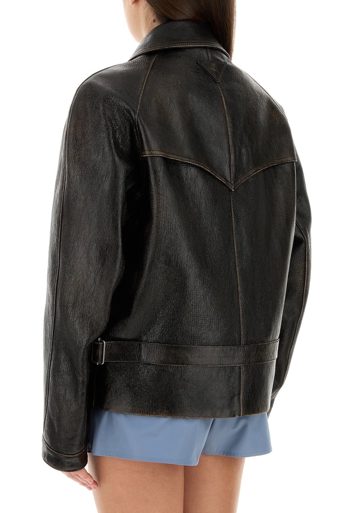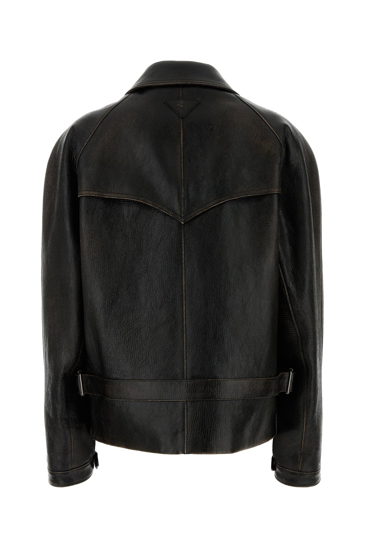 Jacket realized in vintage-effect leather enriched by tonal iconic triangle at the back.