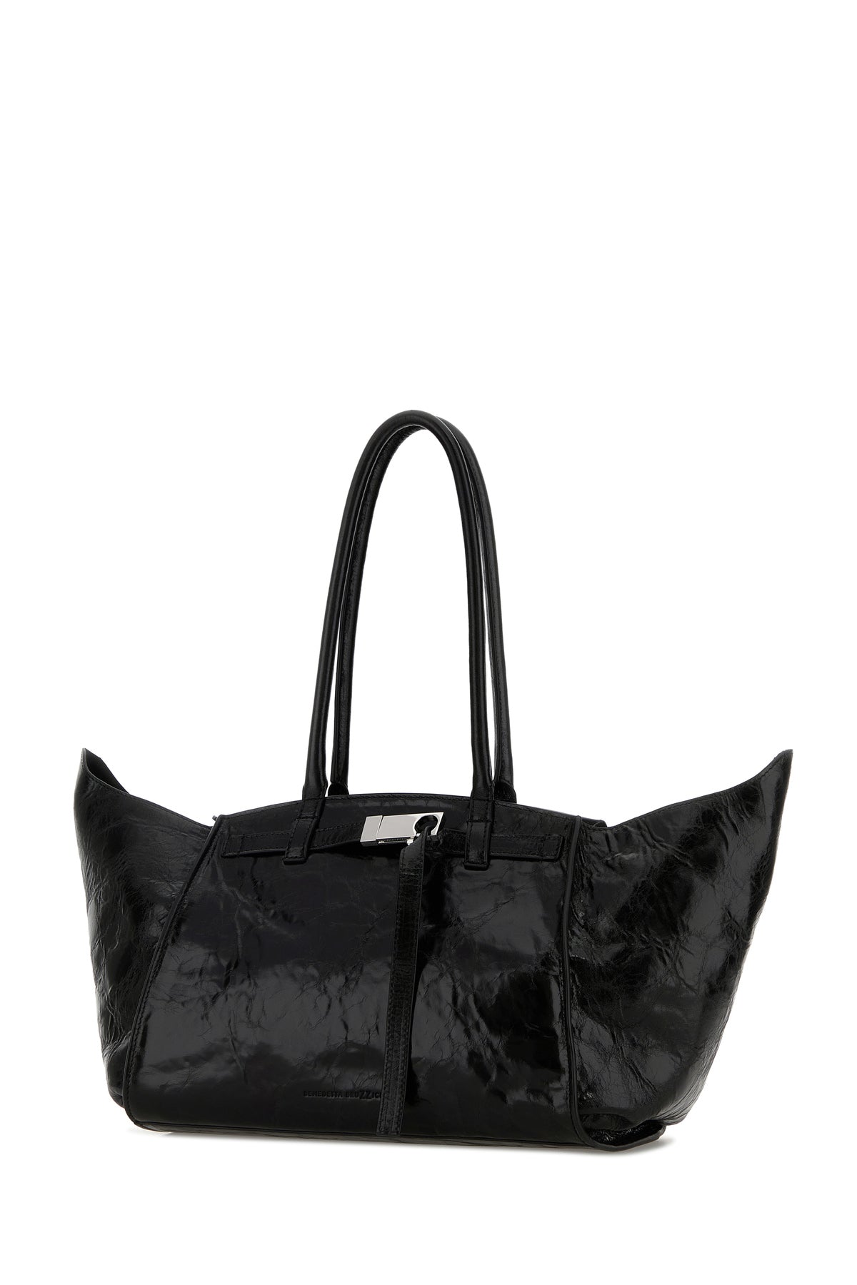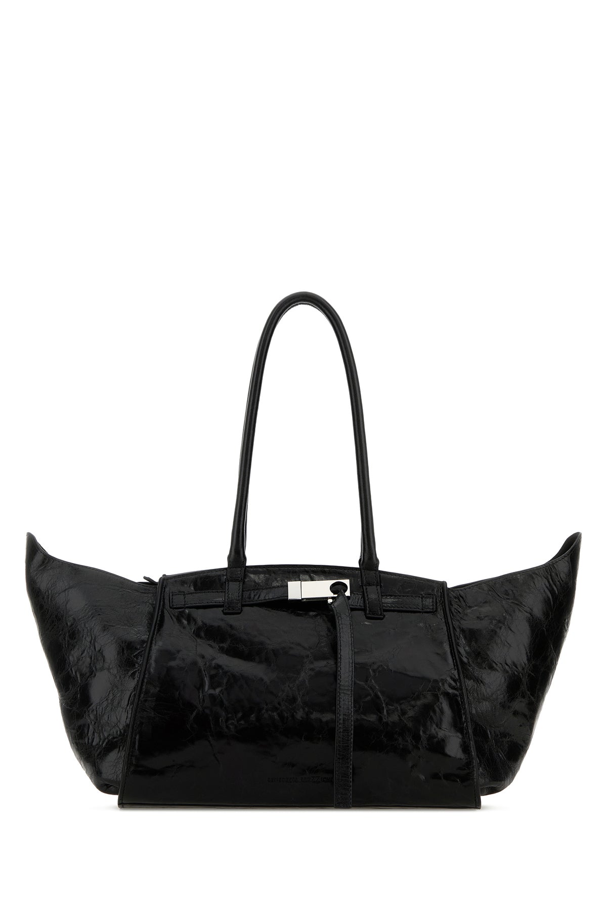 Handbag realized in creased-effect leather characterized by embossed logo on the hemline enriched by decorative strap with metal logoed buckle at the front.