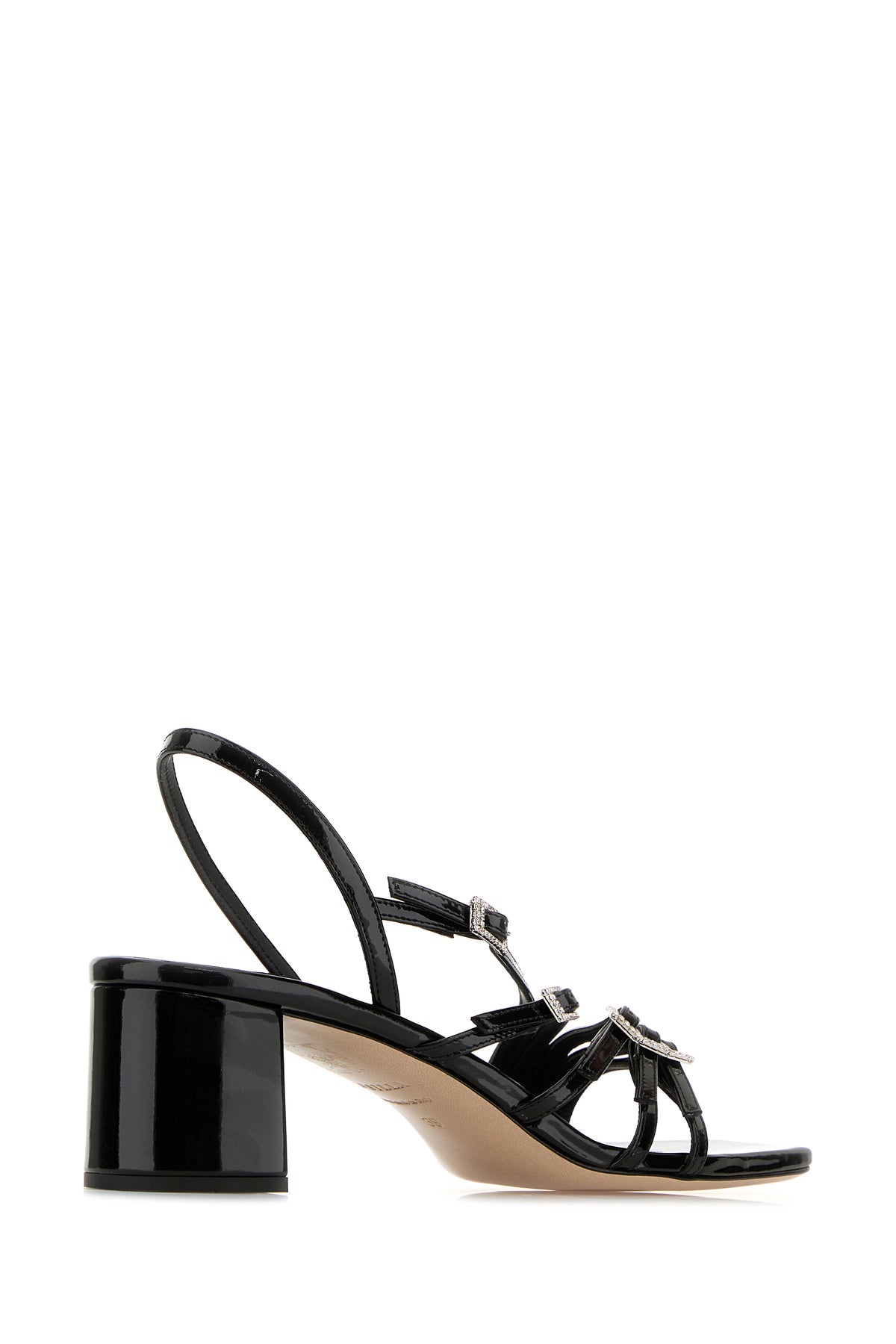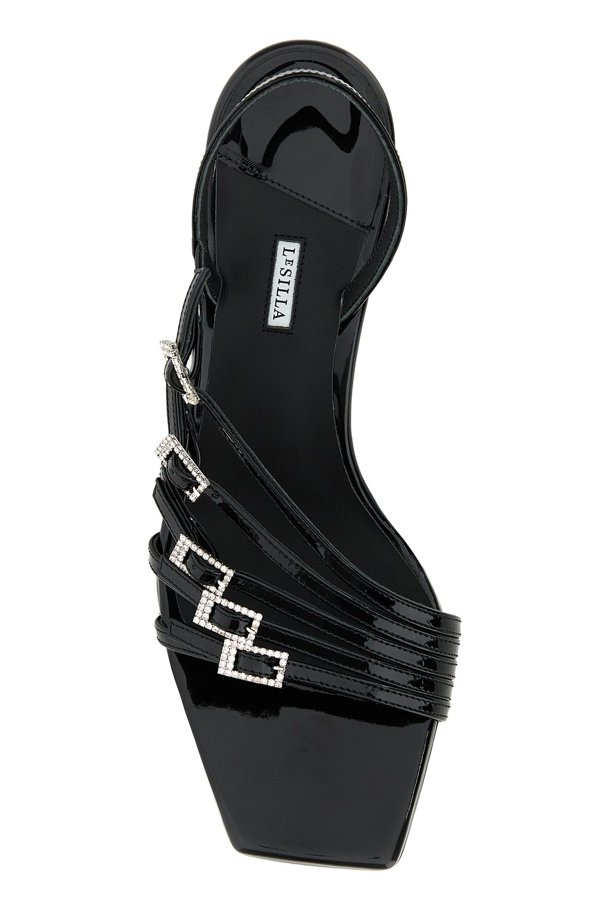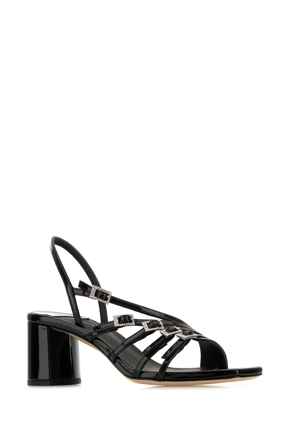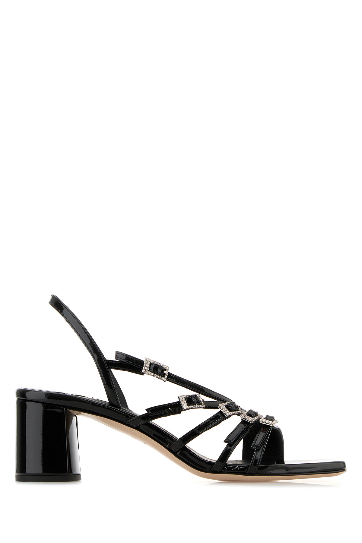 Sandals realized in patent calf leather characterized by tonal straps on the instep.