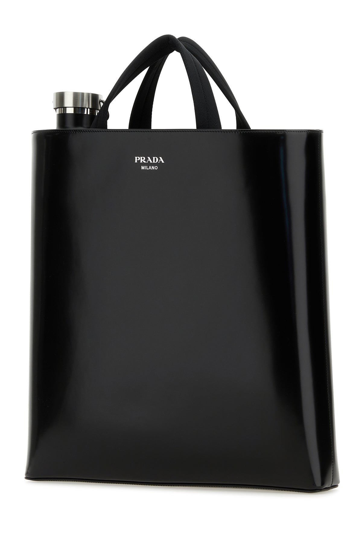 Shopping bag realized in smooth leather from a polished finish characterized by contrasting printed logo at the front enriched by