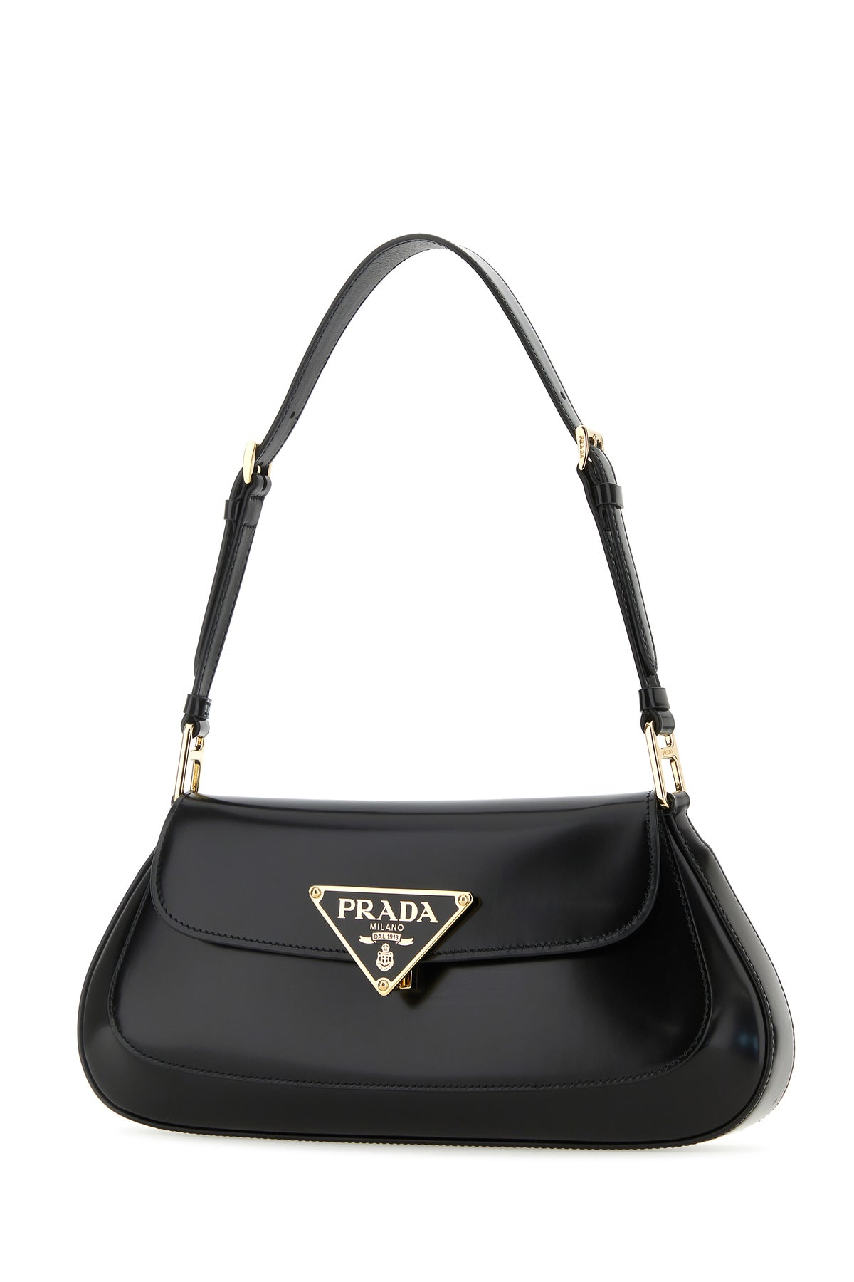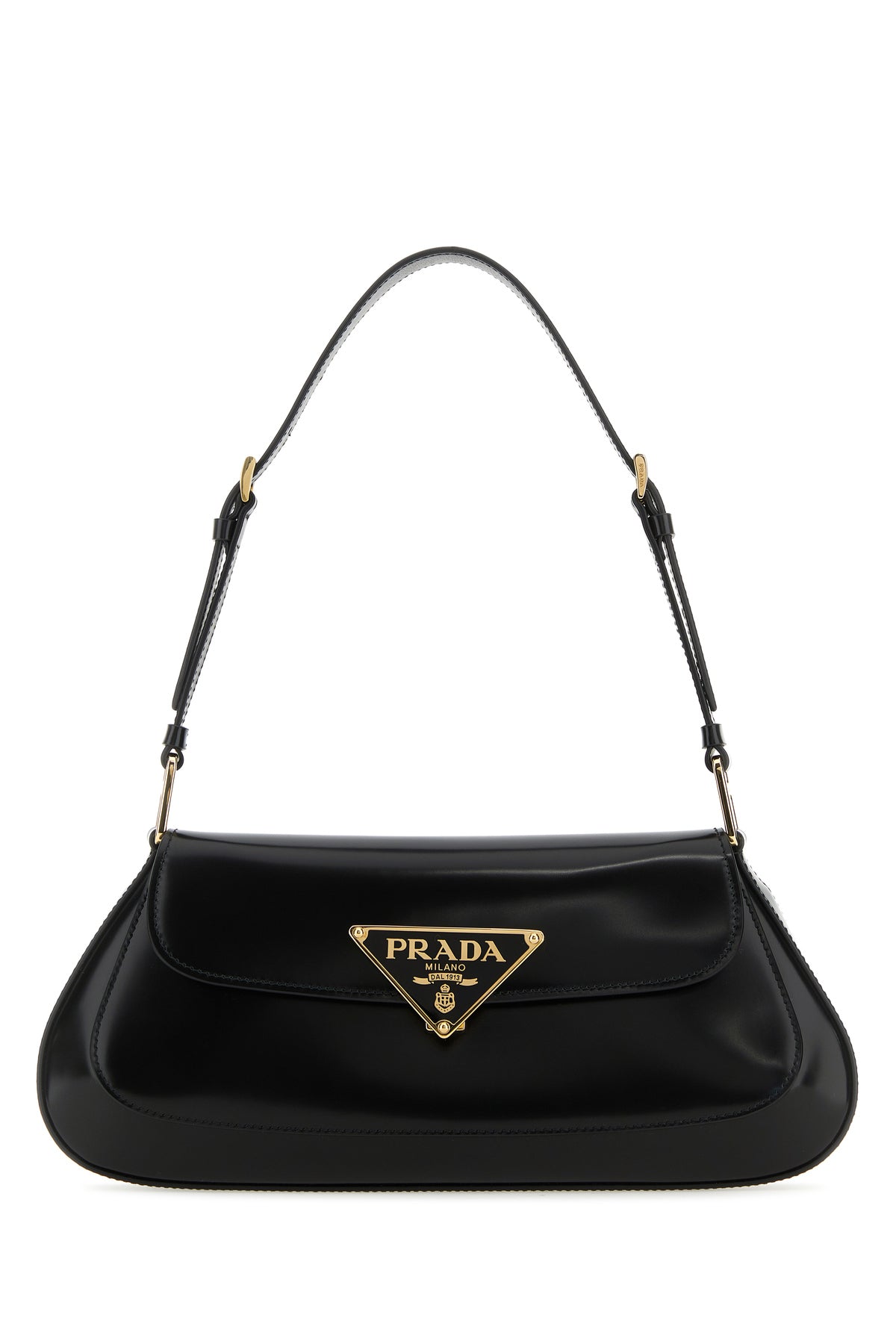 Shoulder bag realized in polished-finish smooth leather enriched by metal iconic logoed triangle at the front.
