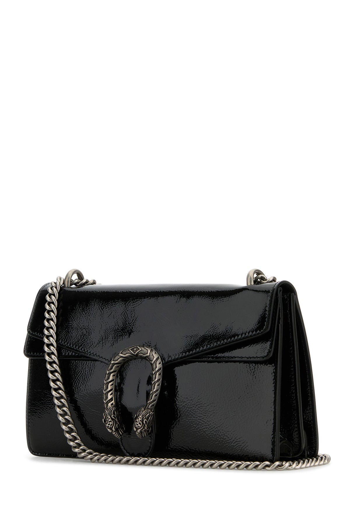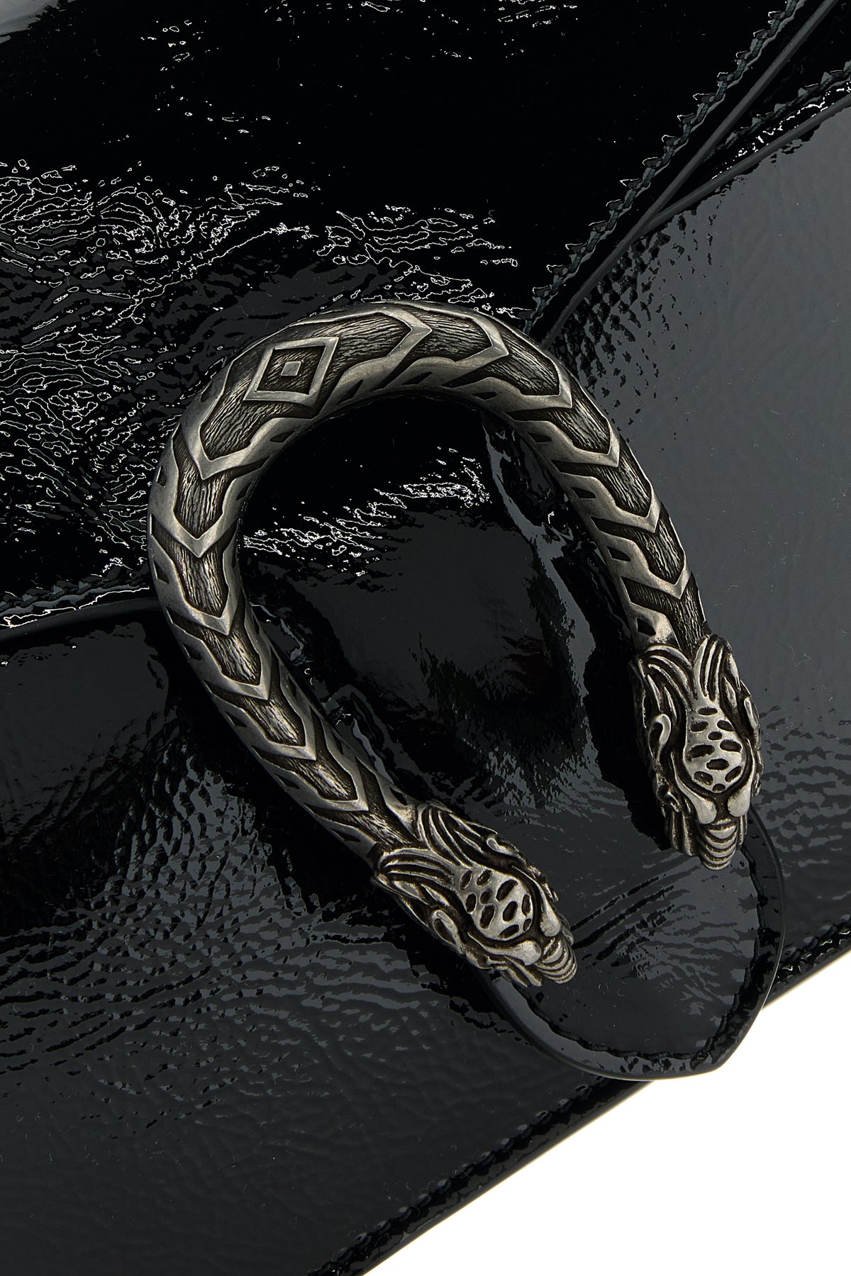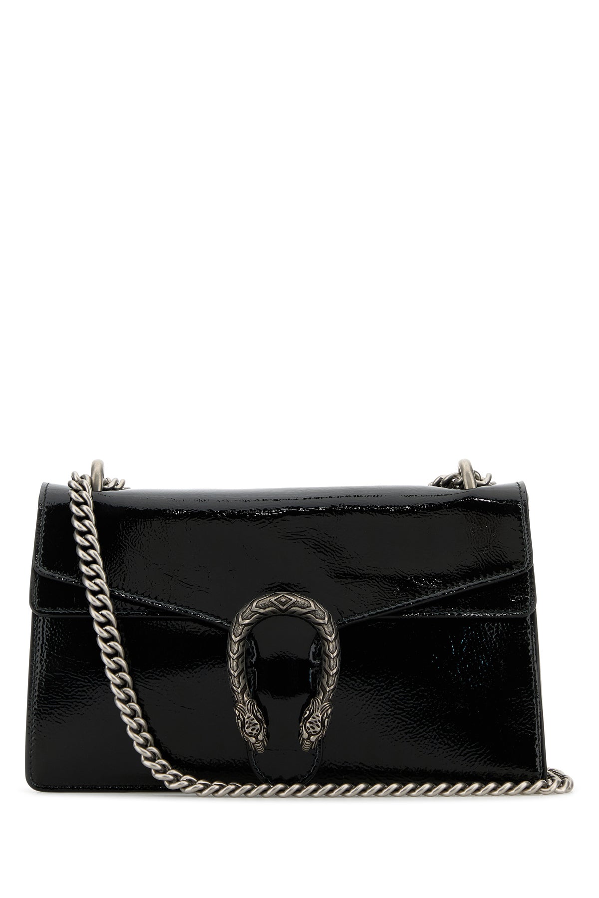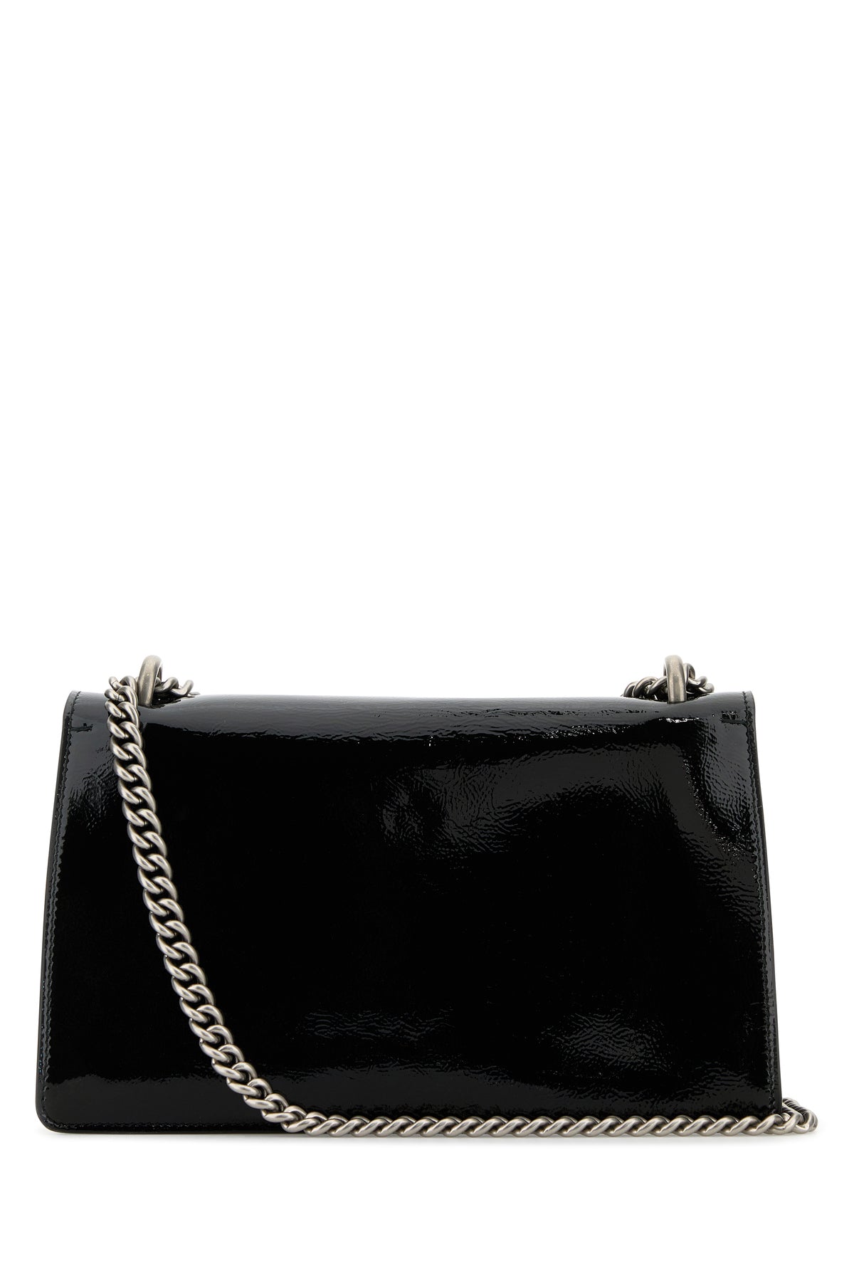 Shoulder bag realized in patent pebble leather enriched by peculiar metal detail at the front.
