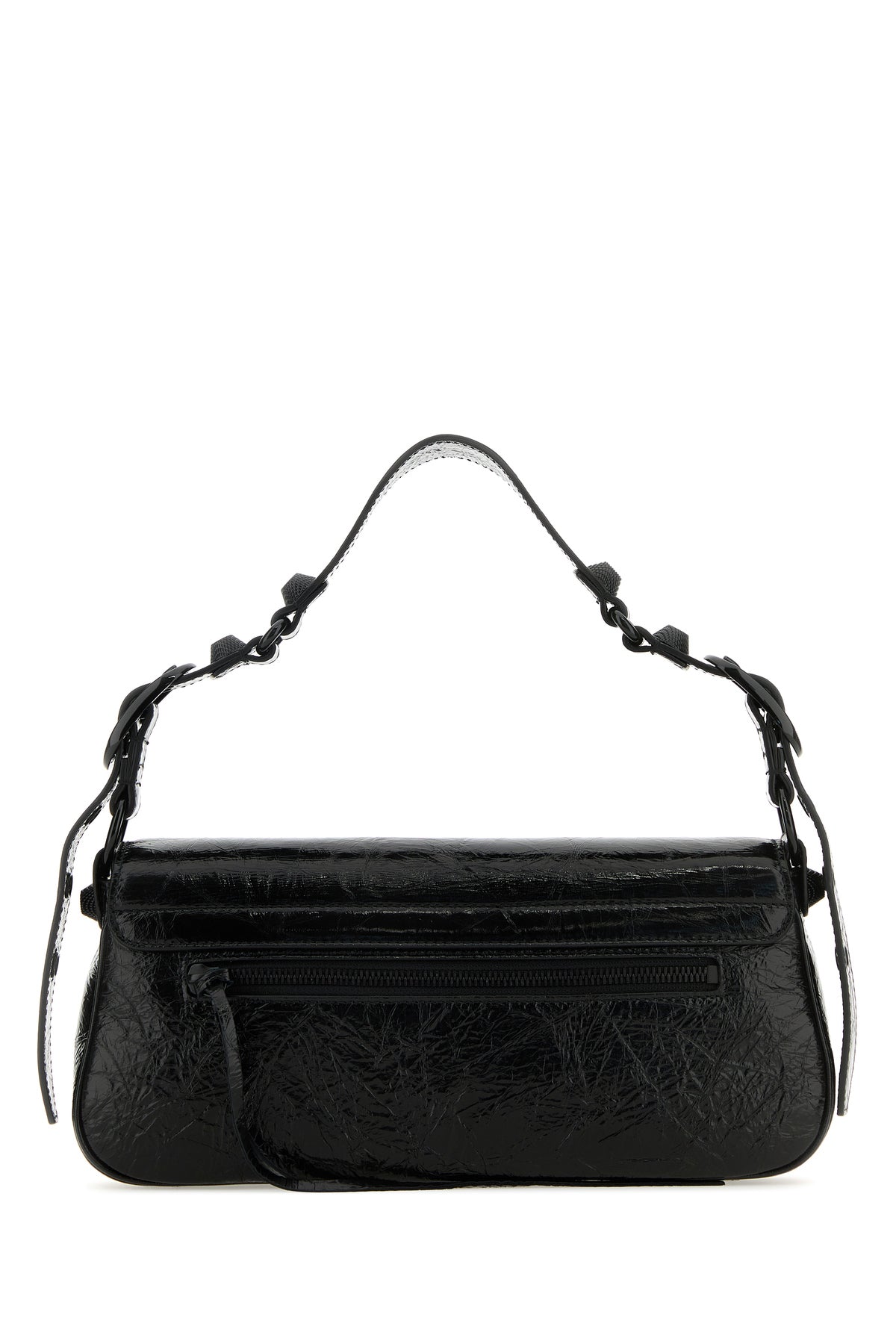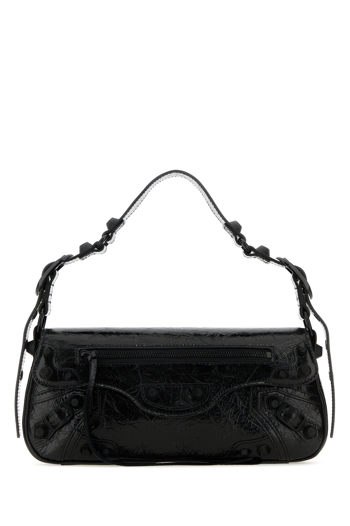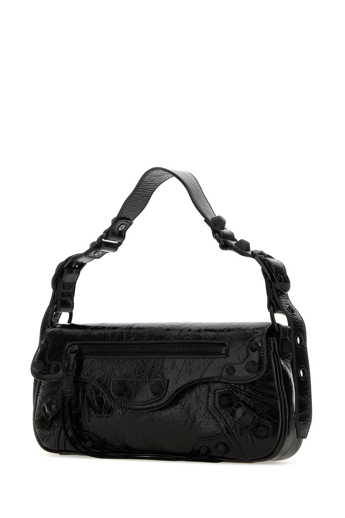 Shoulder bag realized in craquelè-effect patent calf leather enriched by tonal metal studs at the front.