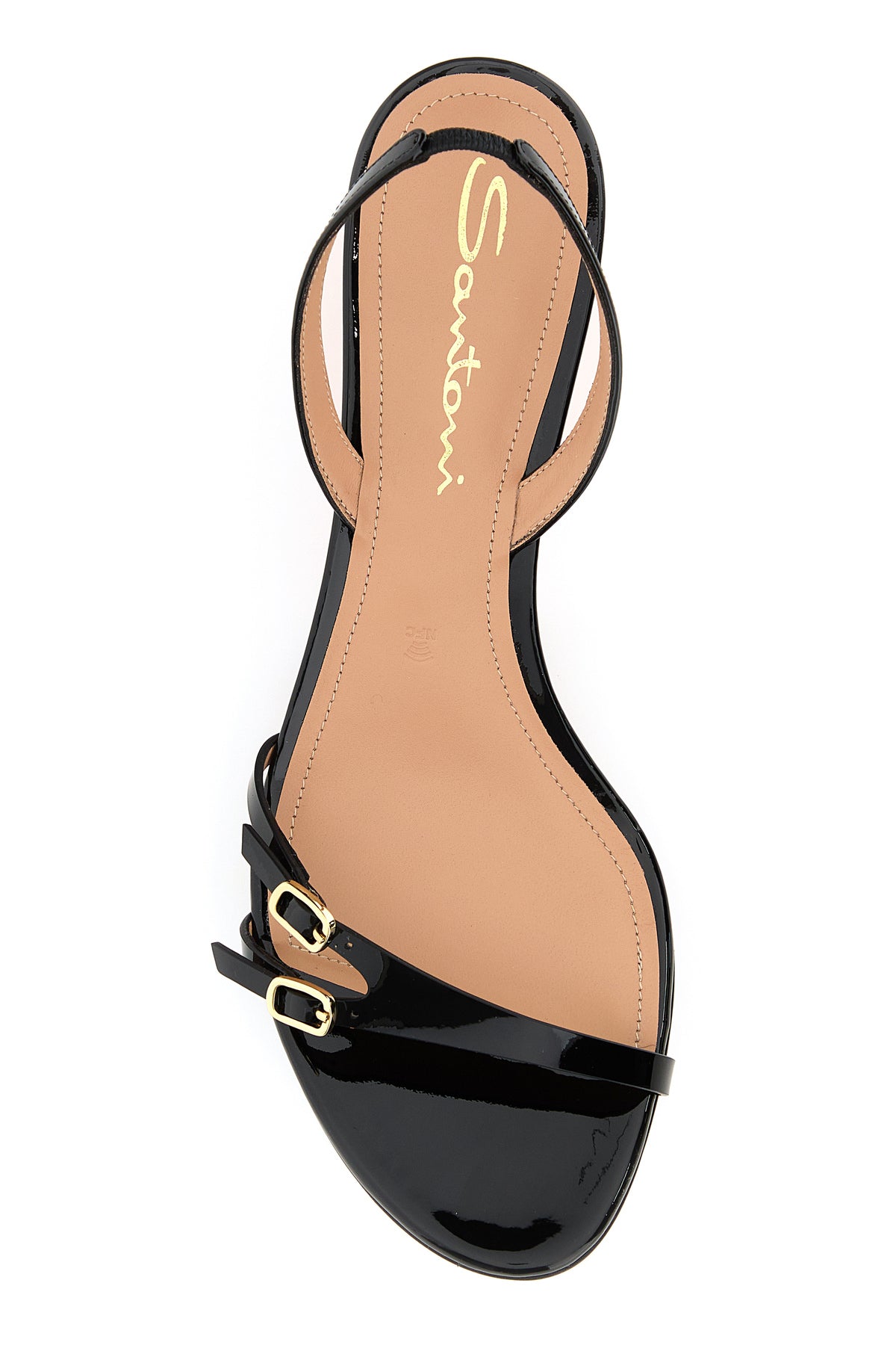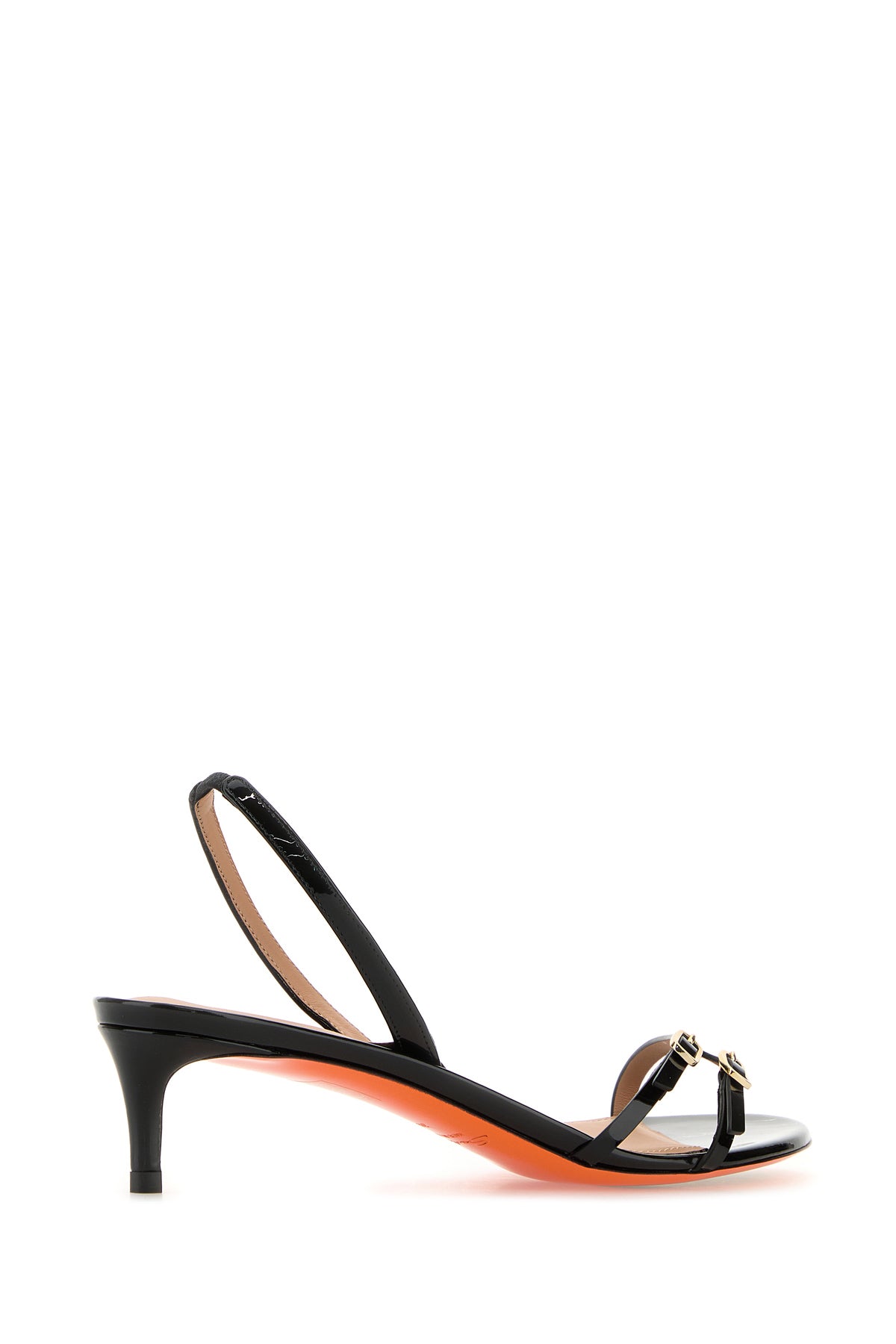 Sandals realized in patent leather characterized by decorative straps on the instep.