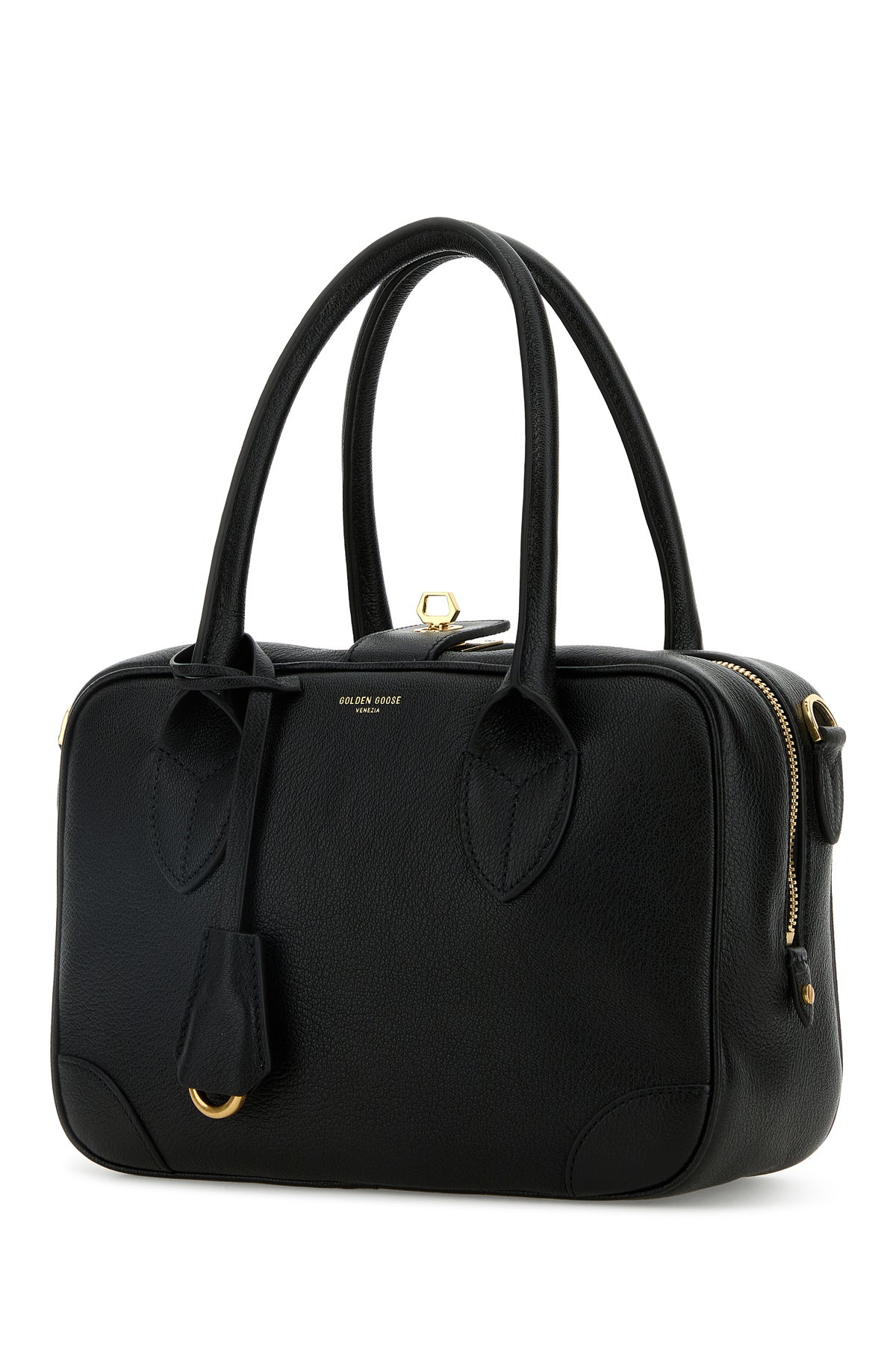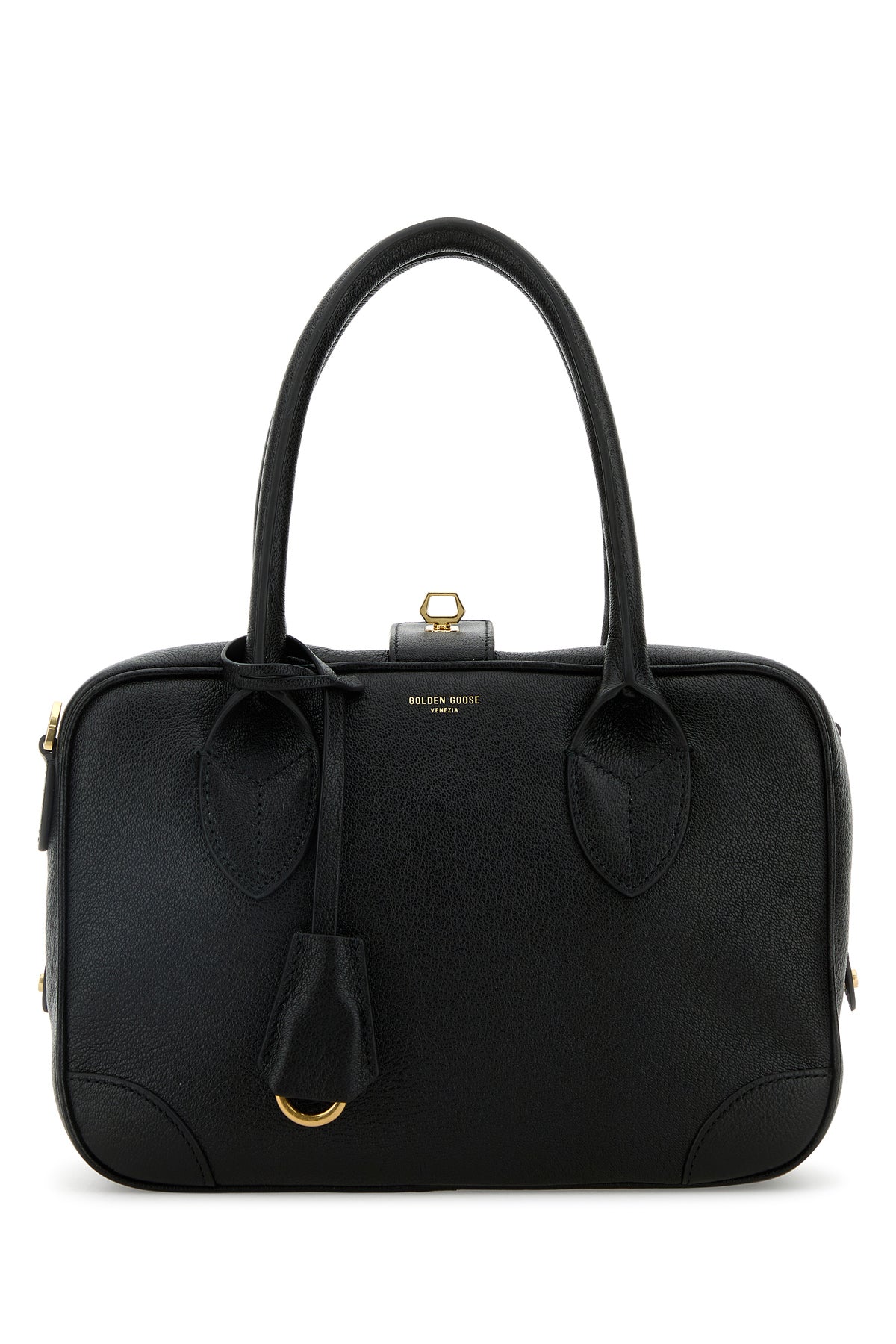 Handbag realized in slightly pebble ovine leather characterized by laminated printed logo at the front enriched by detachable keyring accessory.
