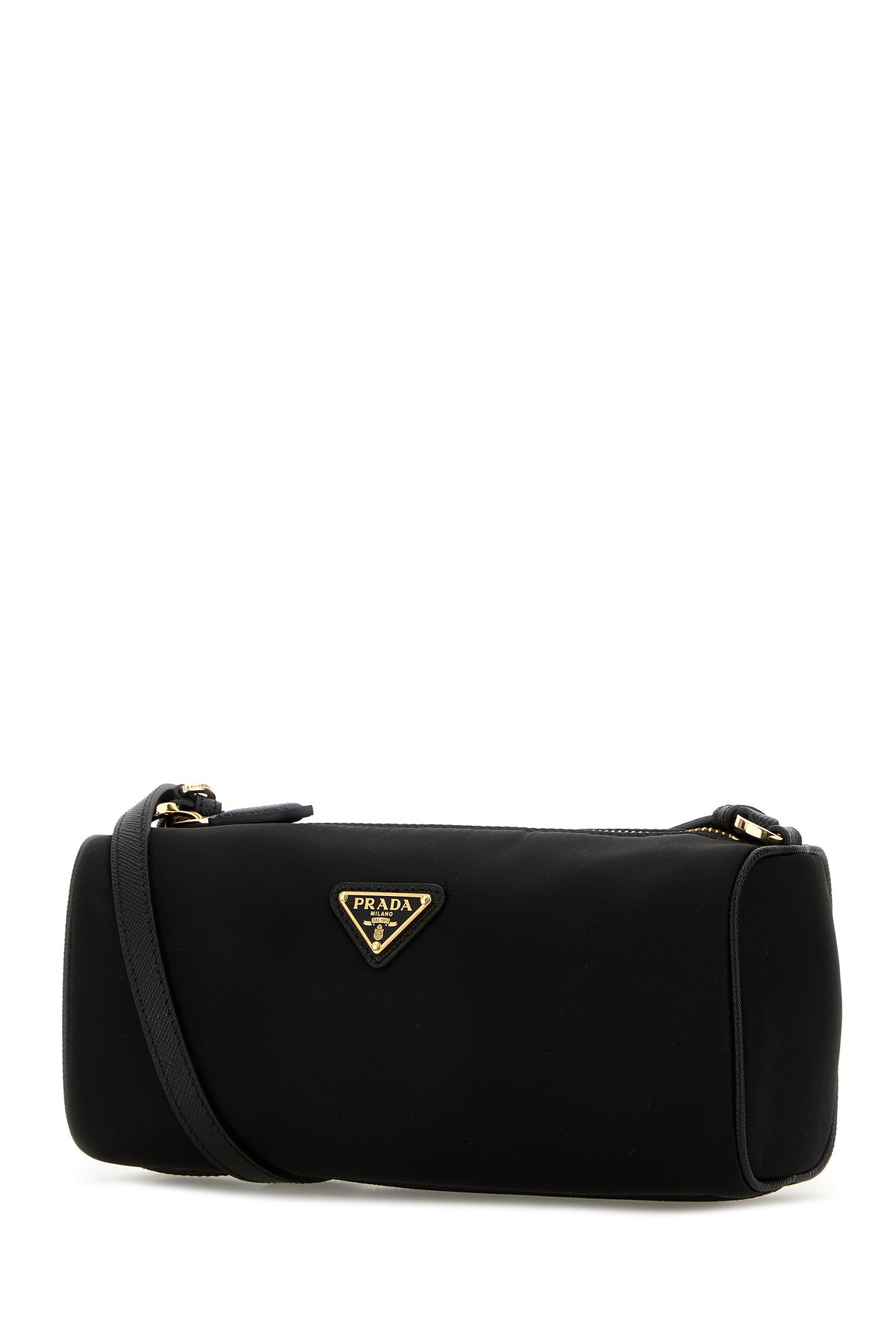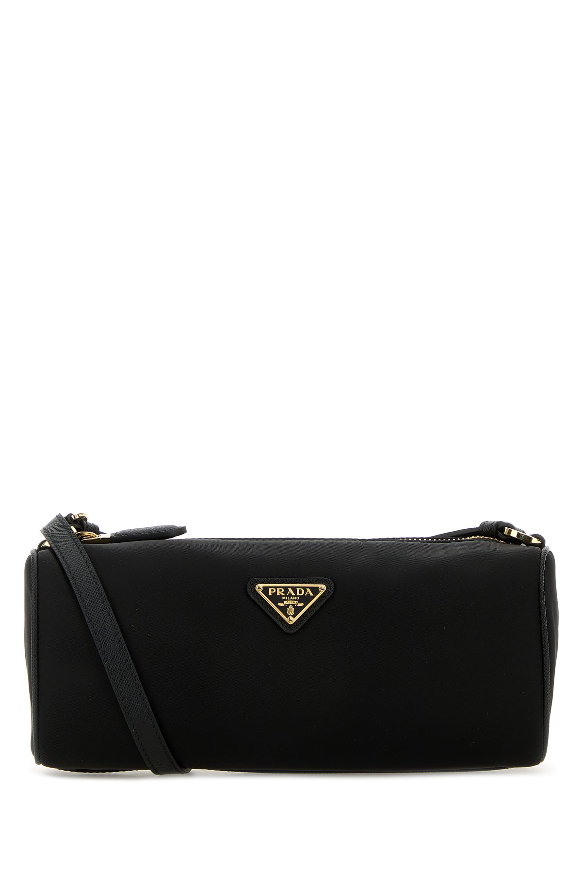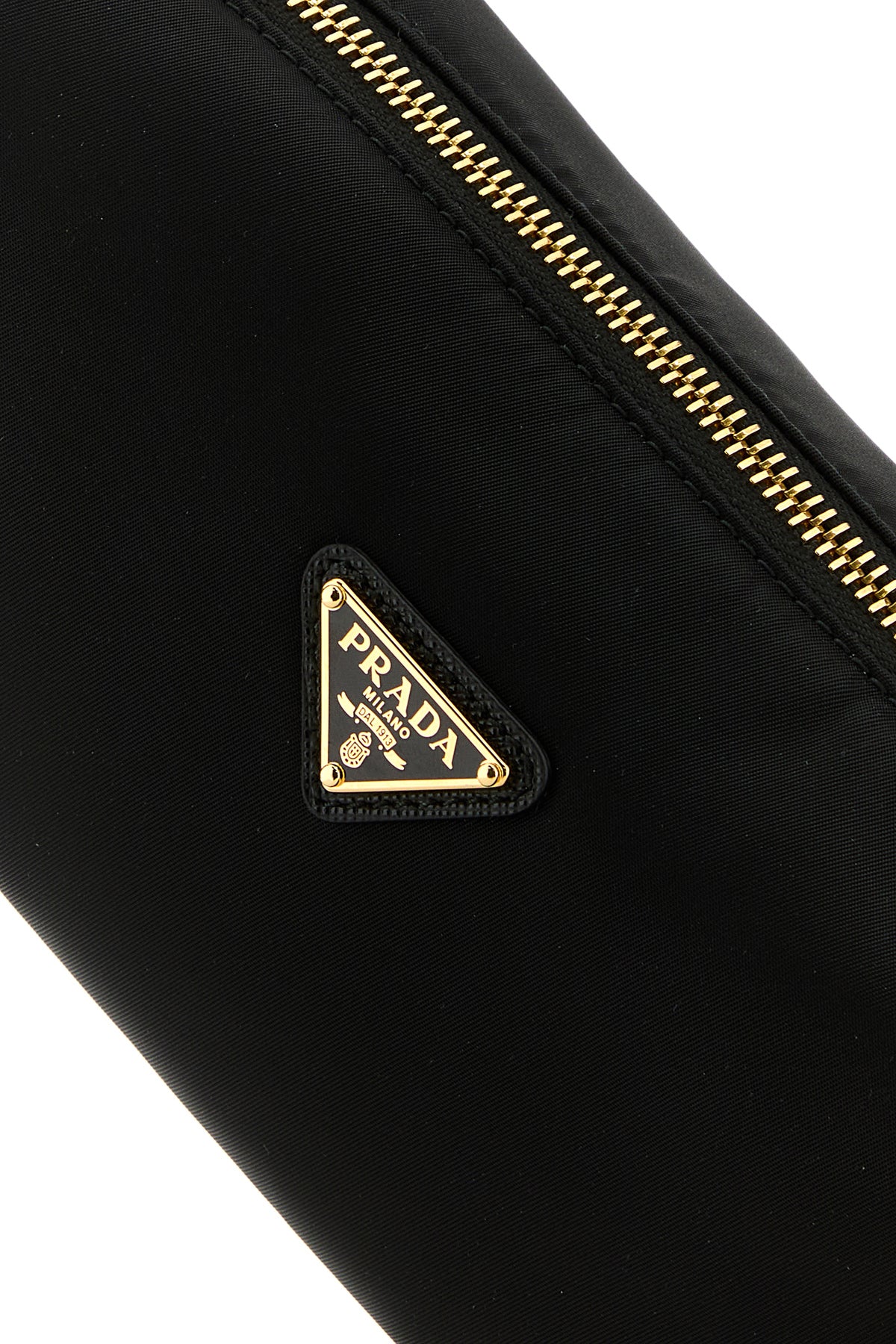 Beauty case realized in nylon enriched by iconic metal and leather logoed triangle at the front.