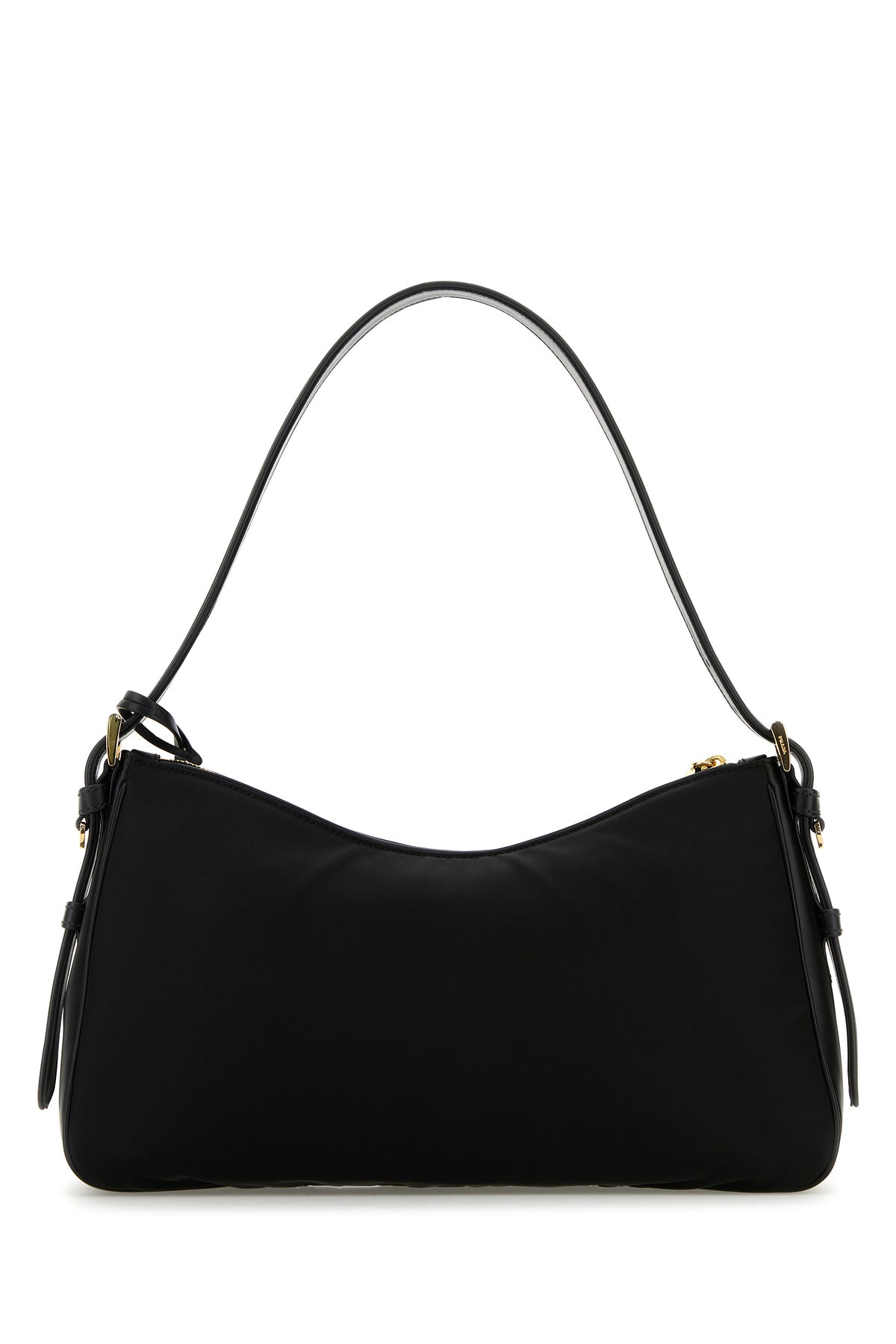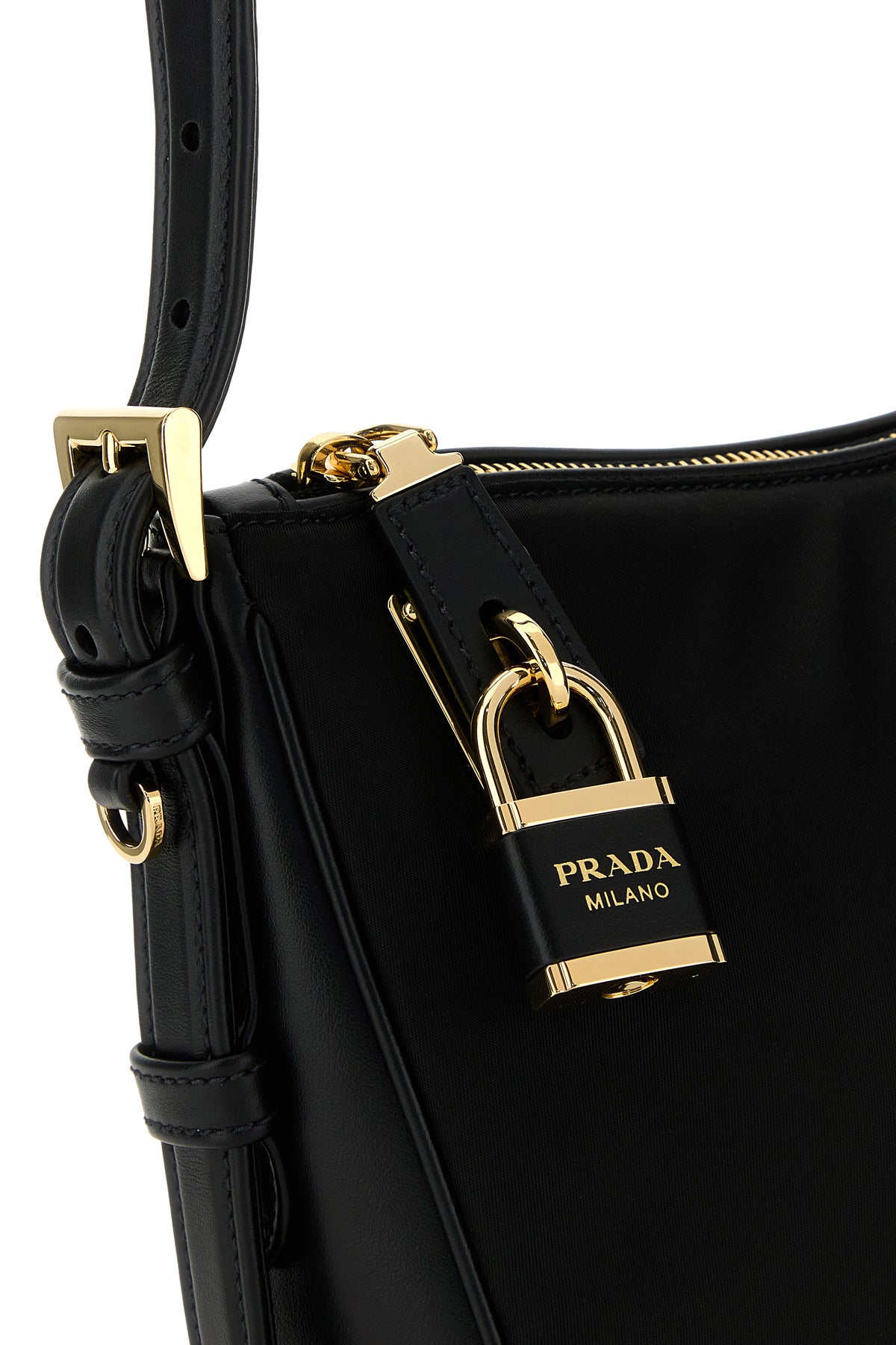 Shoulder bag realized in nylon with tonal smooth leather inserts on the sides enriched by iconic metal logoed triangle and metal and leather logoed padlock at the front and detachable tonal leather keyring accessory on the side.